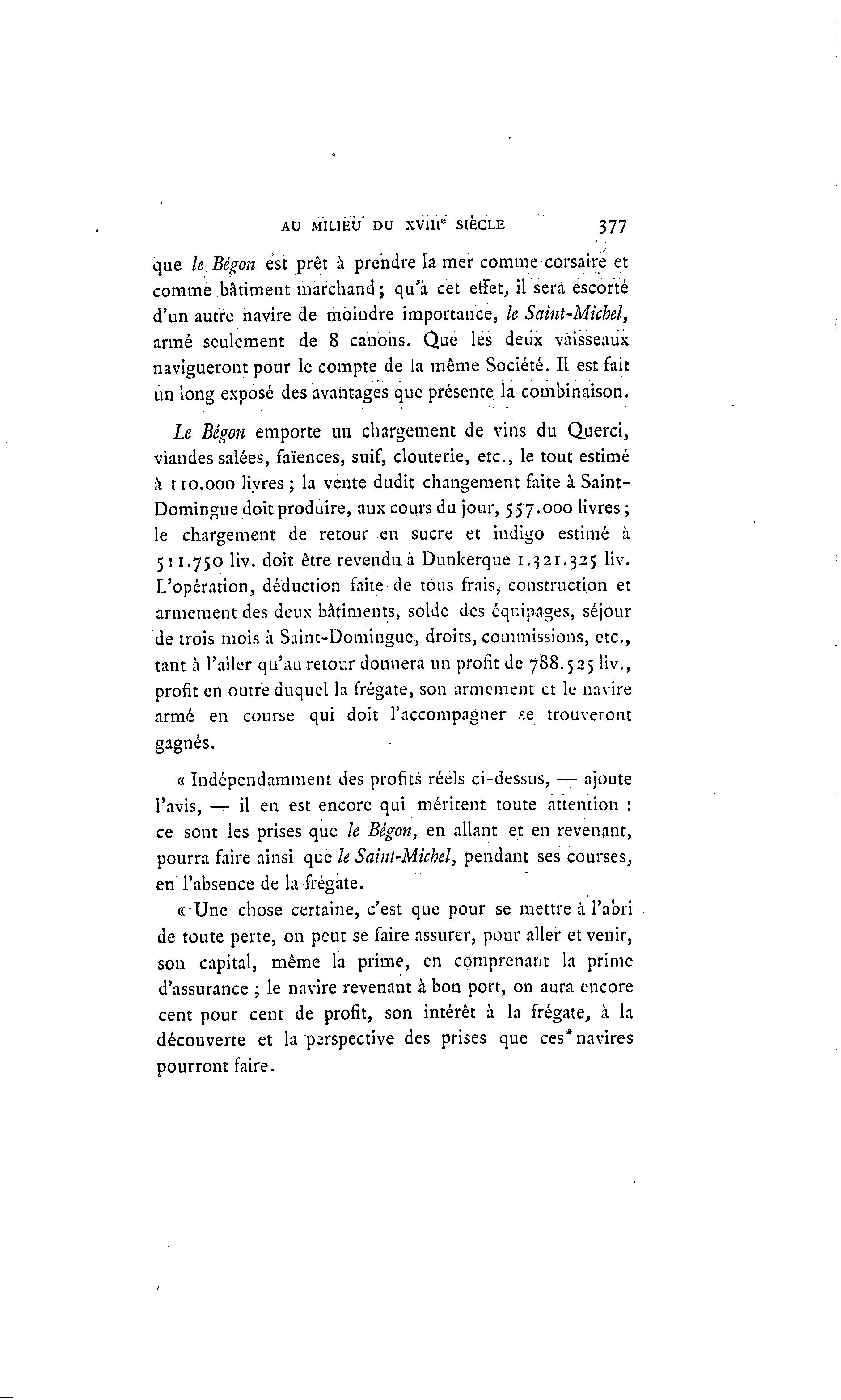 AU MILIEU DU XVIIIe SIECLE 377 que le.Bégon est prêt à prendre la mer comme corsaire et comme bâtiment marchand ; qu'à cet effet, il sera escorté d'un autre navire de moindre importance, le Saint-Michel, armé seulement de 8 canons. Que les deux vaisseaux navigueront pour le compte de ia même Société. Il est fait un long exposé des avantages que présente la combinaison. Le Bégon emporte un chargement de vins du Querci, viandes salées, faïences, suif, clouterie, etc., le tout estimé à tio.ooo livres; la vente dudit changement faite à Saint- Domingue doit produire, aux cours du jour, 557.000 livres; le chargement de retour en sucre et indigo estimé à 5 11.750 liv. doit être revendu à Dunkerque 1.321.325 liv. L'opération, déduction faite de tous frais, construction et armement des deux bâtiments, solde des équipages, séjour de trois mois à Saint-Domingue, droits, commissions, etc., tant à l'aller qu'au retour donnera un profit de 788.525 liv., profit en outre duquel la frégate, son armement et le navire armé en course qui doit l'accompagner se trouveront gagnés. « Indépendamment des profits réels ci-dessus, — ajoute l'avis, —r il en est encore qui méritent toute attention : ce sont les prises que le Bégon, en allant et en revenant, pourra faire ainsi que le Saint-Michel, pendant ses courses, en' l'absence de la frégate. « Une chose certaine, c'est que pour se mettre à l'abri de toute perte, on peut se faire assurer, pour aller et venir, son capital, même la prime, en comprenant la prime d'assurance ; le navire revenant à bon port, on aura encore cent pour cent de profit, son intérêt à la frégate, à la découverte et la pzrspective des prises que ces* navires pourront faire.