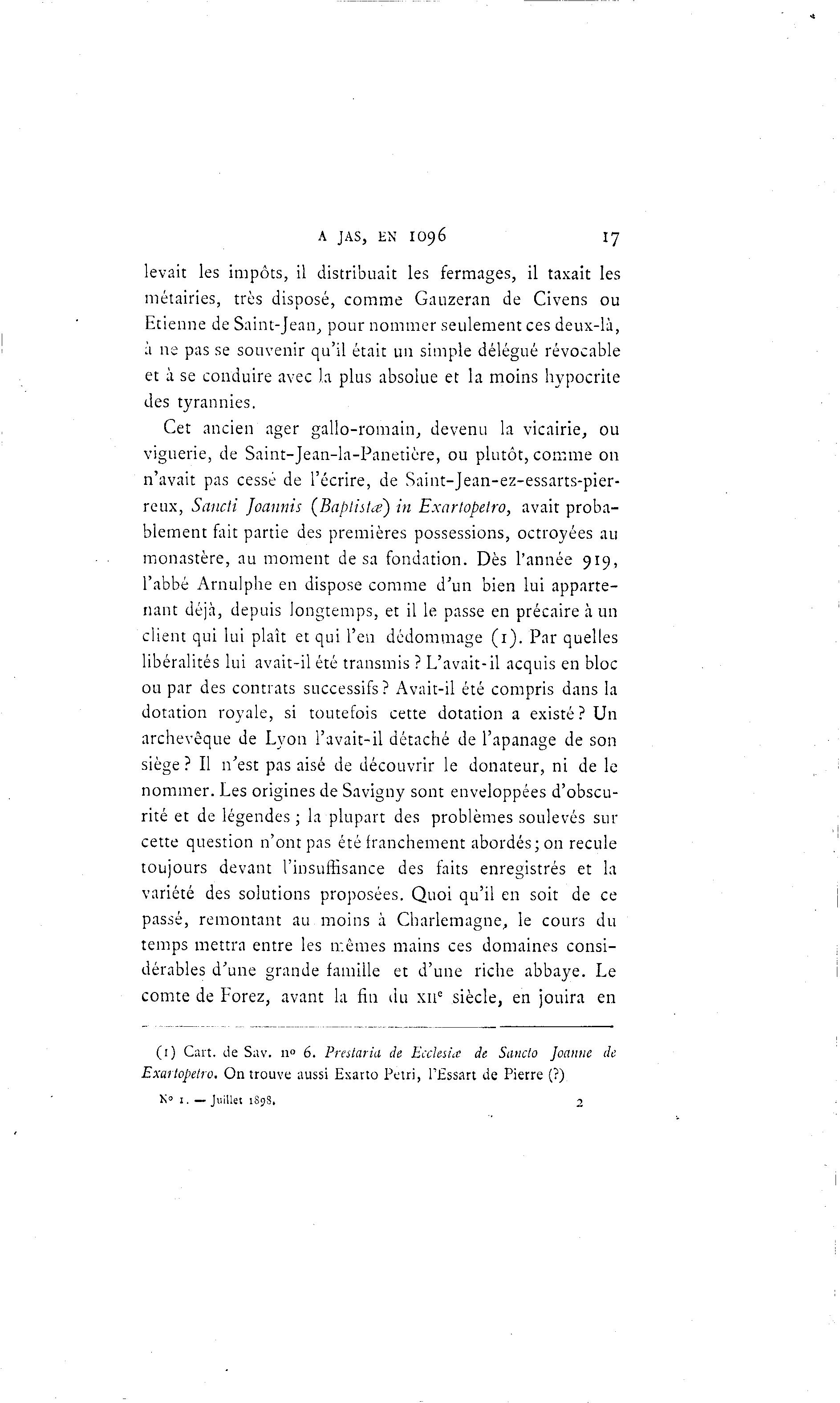 A JAS, EN 109e 17 levait les impôts, il distribuait les fermages, il taxait les métairies, très disposé, comme Gauzeran de Civens ou Etienne de Saint-Jean, pour nommer seulement ces deux-là , à ne pas se souvenir qu'il était un simple délégué révocable et à se conduire avec la plus absolue et la moins hypocrite des tyrannies. Cet ancien ager gallo-romain, devenu la vicairie, ou viguerie, de Saint-Jean-la-Panetière, ou plutôt, comme on n'avait pas cessé de l'écrire, de Saint-Jean-ez-essarts-pier- reux, Sancîi Joannis (Baplislœ) in Exarlopeiro, avait proba- blement fait partie des premières possessions, octroyées au monastère, au moment de sa fondation. Dès l'année 919, l'abbé Arnulphe en dispose comme d'un bien lui apparte- nant déjà , depuis longtemps, et il le passe en précaire à un client qui lui plaît et qui l'en dédommage (1). Par quelles libéralités lui avait-il été transmis ? L'avait-il acquis en bloc ou par des contrats successifs? Avait-il été compris dans la dotation royale, si toutefois cette dotation a existé? Un archevêque de Lyon l'avait-il détaché de l'apanage de son siège ? Il n'est pas aisé de découvrir le donateur, ni de le nommer. Les origines de Savigny sont enveloppées d'obscu- rité et de légendes ; la plupart des problèmes soulevés sur cette question n'ont pas été franchement abordés; on recule toujours devant l'insuffisance des faits enregistrés et la variété des solutions proposées. Quoi qu'il en soit de ce passé, remontant au moins à Charlemagne, le cours du temps mettra entre les mêmes mains ces domaines consi- dérables d'une grande famille et d'une riche abbaye. Le comte de Forez, avant la fin du xue siècle, en jouira en (1) Ont. de Sav. n° 6. Prestaria de Ecclesia de Saiiclo Joanne de Exarlopeiro. On trouve aussi Exarto Pétri, l'Essart de Pierre (?) N° i. — Juillet 1S9S. 2