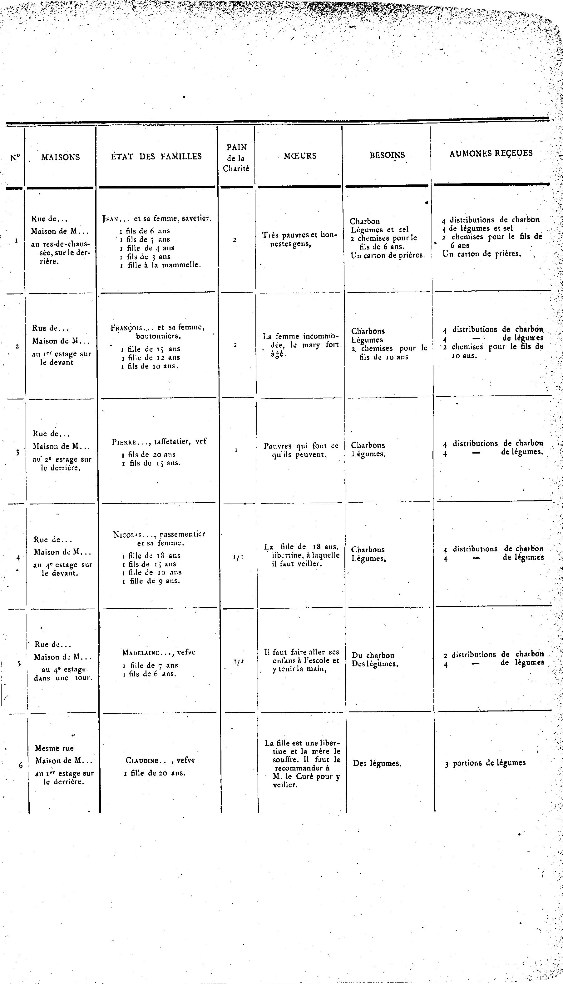 N° MAISONS ÉTAT DES FAMILLES delà MŒURS BESOINS AUMONES REÇEUES