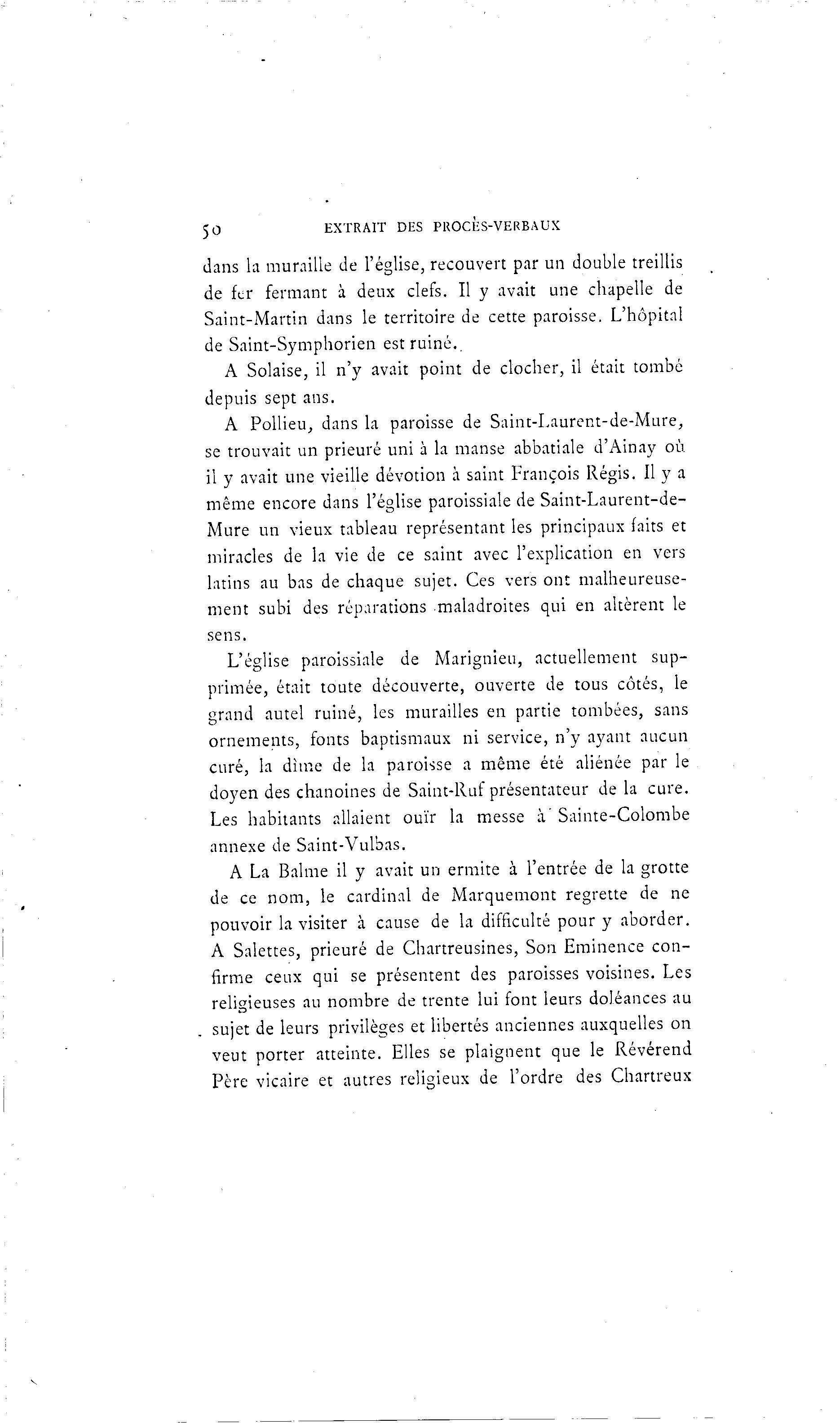 50 EXTRAIT DES PROCES-VERBAUX dans la muraille de l'église, recouvert par un double treillis de fer fermant à deux clefs. Il y avait une chapelle de Saint-Martin dans le territoire de cette paroisse. L'hôpital de Saint-Symphorien est ruiné.. A Solaise, il n'y avait point de clocher, il était tombé depuis sept ans. A Pollieu, dans la paroisse de Saint-Laurent-de-Mure, se trouvait un prieuré uni à la manse abbatiale d'Ainay où il y avait une vieille dévotion à saint François Régis. Il y a même encore dans l'église paroissiale de Saint-Laurent-de- Mure un vieux tableau représentant les principaux faits et miracles de la vie de ce saint avec l'explication en vers latins au bas de chaque sujet. Ces vers ont malheureuse- ment subi des réparations maladroites qui en altèrent le sens. L'église paroissiale de Marignieu, actuellement sup- primée, était toute découverte, ouverte de tous côtés, le grand autel ruiné, les murailles en partie tombées, sans ornements, fonts baptismaux ni service, n'y ayant aucun curé, la dîme de la paroisse a même été aliénée par le doyen des chanoines de Saint-Ruf présentateur de la cure. Les habitants allaient ouïr la messe à ' Sainte-Colombe annexe de Saint-Vulbas. A La Balme il y avait un ermite à l'entrée de la grotte de ce nom, le cardinal de Marquemont regrette de ne pouvoir la visiter à cause de la difficulté pour y aborder. A Salettes, prieuré de Chartreusines, Son Eminence con- firme ceux qui se présentent des paroisses voisines. Les religieuses au nombre de trente lui font leurs doléances au sujet de leurs privilèges et libertés anciennes auxquelles on veut porter atteinte. Elles se plaignent que le Révérend Père vicaire et autres religieux de l'ordre des Chartreux
