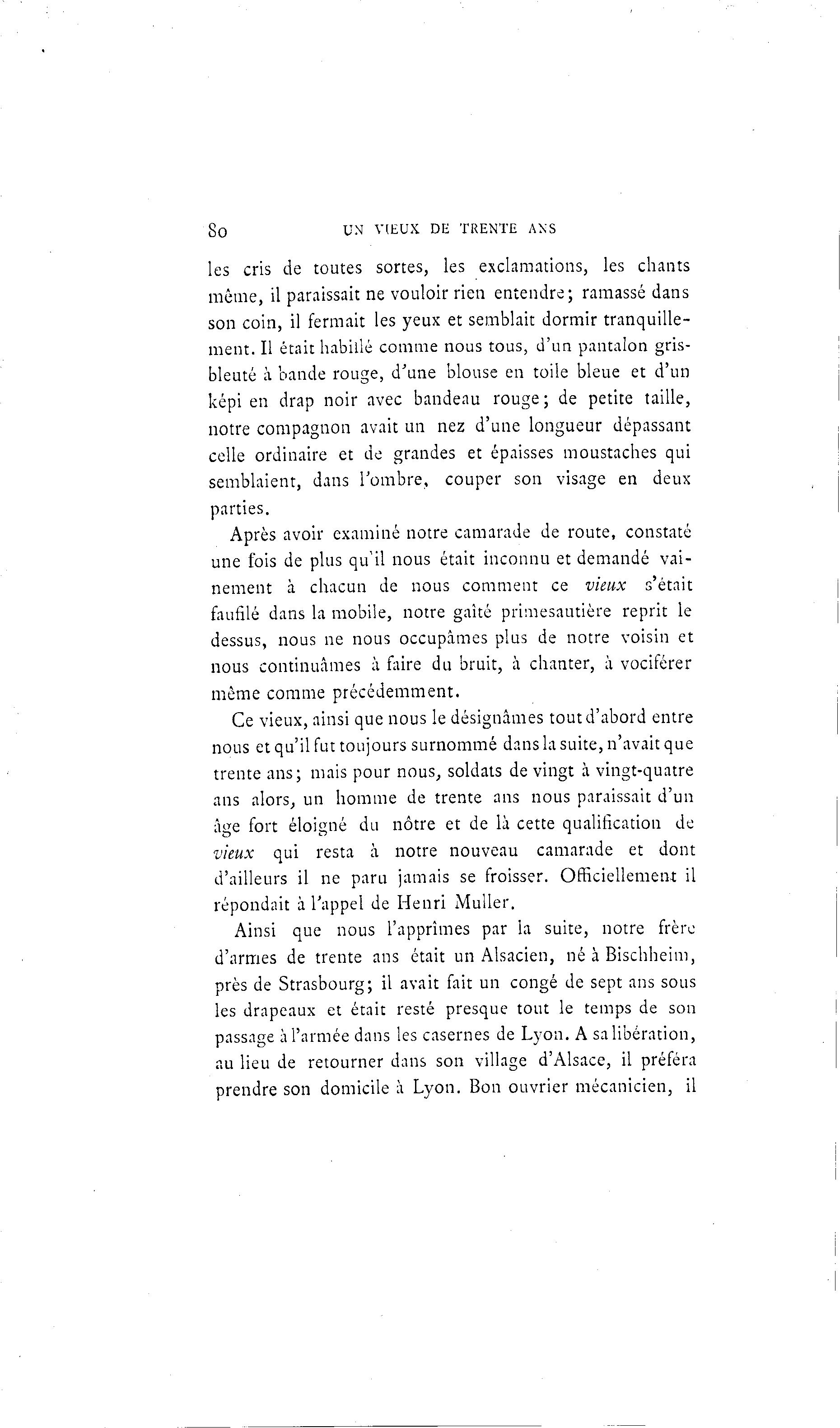 So UN VIEUX DE TRENTE AXS les cris de toutes sortes, les exclamations, les chants même, il paraissait ne vouloir rien entendre; ramassé dans son coin, il fermait les yeux et semblait dormir tranquille- ment. Il était habillé comme nous tous, d'un pantalon gris- bleuté à bande rouge, d'une blouse en toile bleue et d'un képi en drap noir avec bandeau rouge; de petite taille, notre compagnon avait un nez d'une longueur dépassant celle ordinaire et de grandes et épaisses moustaches qui semblaient, dans l'ombre, couper son visage en deux parties. Après avoir examiné notre camarade de route, constaté une fois de plus qu'il nous était inconnu et demandé vai- nement à chacun de nous comment ce vieux s'était faufilé dans la mobile, notre gaîté primesautière reprit le dessus, nous ne nous occupâmes plus de notre voisin et nous continuâmes à faire du bruit, à chanter, à vociférer même comme précédemment. Ce vieux, ainsi que nous le désignâmes tout d'abord entre nous et qu'il fut toujours surnommé dans la suite, n'avait que trente ans; mais pour nous, soldats de vingt à vingt-quatre ans alors, un homme de trente ans nous paraissait d'un âge fort éloigné du nôtre et de là cette qualification de vieux qui resta à notre nouveau camarade et dont d'ailleurs il ne paru jamais se froisser. Officiellement il répondait à l'appel de Henri Muller. Ainsi que nous l'apprîmes par la suite, notre frère d'armes de trente ans était un Alsacien, né à Bischheim, près de Strasbourg; il avait fait un congé de sept ans sous les drapeaux et était resté presque tout le temps de son passage à l'armée dans les casernes de Lyon. A sa libération, au lieu de retourner dans son village d'Alsace, il préféra prendre son domicile à Lyon. Bon ouvrier mécanicien, il