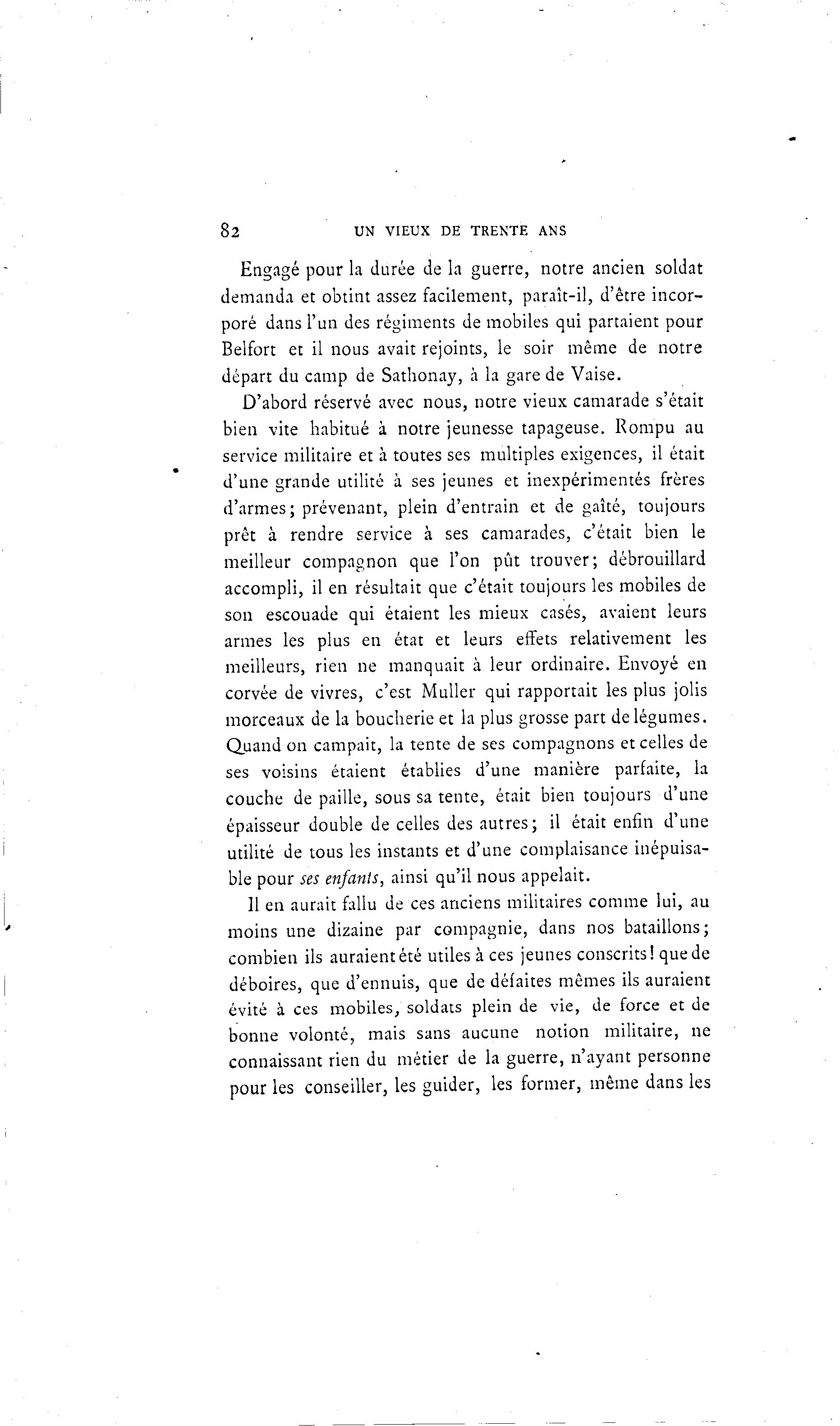 82 UN VIEUX DE TRENTE ANS Engagé pour la durée de la guerre, notre ancien soldat demanda et obtint assez facilement, paraît-il, d'être incor- poré dans l'un des régiments de mobiles qui partaient pour Belfort et il nous avait rejoints, le soir même de notre départ du camp de Sathonay, à la gare de Vaise. D'abord réservé avec nous, notre vieux camarade s'était bien vite habitué à notre jeunesse tapageuse. Rompu au service militaire et à toutes ses multiples exigences, il était d'une grande utilité à ses jeunes et inexpérimentés frères d'armes; prévenant, plein d'entrain et de gaîté, toujours prêt à rendre service à ses camarades, c'était bien le meilleur compagnon que l'on pût trouver; débrouillard accompli, il en résultait que c'était toujours les mobiles de son escouade qui étaient les mieux casés, avaient leurs armes les plus en état et leurs effets relativement les meilleurs, rien ne manquait à leur ordinaire. Envoyé en corvée de vivres, c'est Muller qui rapportait les plus jolis morceaux de la boucherie et la plus grosse part de légumes. Quand on campait, la tente de ses compagnons et celles de ses voisins étaient établies d'une manière parfaite, la couche de paille, sous sa tente, était bien toujours d'une épaisseur double de celles des autres; il était enfin d'une utilité de tous les instants et d'une complaisance inépuisa- ble pour ses enfants, ainsi qu'il nous appelait. 11 en aurait fallu de ces anciens militaires comme lui, au moins une dizaine par compagnie, dans nos bataillons; combien ils auraient été utiles à ces jeunes conscrits ! que de déboires, que d'ennuis, que de défaites mêmes ils auraient évité à ces mobiles, soldats plein de vie, de force et de bonne volonté, mais sans aucune notion militaire, ne connaissant rien du métier de la guerre, n'ayant personne pour les conseiller, les guider, les former, même dans les
