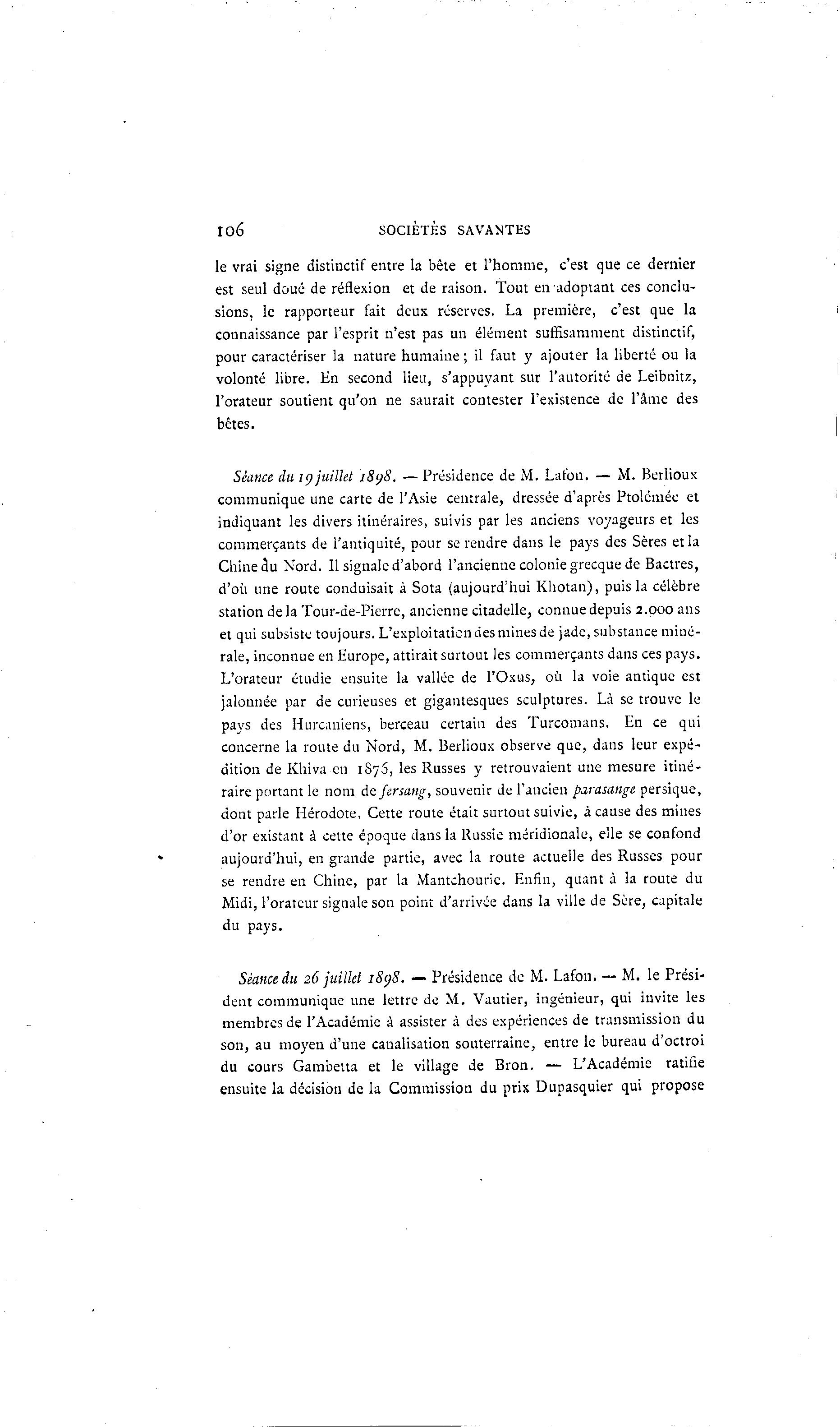io6 SOCIÉTÉS SAVANTES le vrai signe distinctif entre la bête et l'homme, c'est que ce dernier est seul doué de réflexion et de raison. Tout en adoptant ces conclu- sions, le rapporteur fait deux réserves. La première, c'est que la connaissance par l'esprit n'est pas un élément suffisamment distinctif, pour caractériser la nature humaine ; il faut y ajouter la liberté ou la volonté libre. En second lieu, s'appuyant sur l'autorité de Leibnitz, l'orateur soutient qu'on ne saurait contester l'existence de l'âme des bêtes. Séance du 19 juillet 1898. — Présidence de M. Lafou. — M. Berlioux communique une carte de l'Asie centrale, dressée d'après Ptolémée et indiquant les divers itinéraires, suivis par les anciens voyageurs et les commerçants de l'antiquité, pour se rendre dans le pays des Sères et la Chine du Nord. Il signale d'abord l'ancienne colonie grecque de Bactres, d'où une route conduisait à Sota (aujourd'hui Khotan), puis la célèbre station de la Tour-de-Pierre, ancienne citadelle, connue depuis 2.000 ans et qui subsiste toujours. L'exploitation des mines de jade, substance miné- rale, inconnue en Europe, attirait surtout les commerçants dans ces pays. L'orateur étudie ensuite la vallée de l'Oxus, où la voie antique est jalonnée par de curieuses et gigantesques sculptures. Là se trouve le pays des Hurcauiens, berceau certain des Turcomans. En ce qui concerne la route du Nord, M. Berlioux observe que, dans leur expé- dition de Khiva en iSy5, les Russes y retrouvaient une mesure itiné- raire portant le nom defersang, souvenir de l'ancien parasange persique, dont parle Hérodote, Cette route était surtout suivie, à cause des mines d'or existant à cette époque dans la Russie méridionale, elle se confond aujourd'hui, en grande partie, avec la route actuelle des Russes pour se rendre en Chine, par la Mantchourie. Enfin, quant à la route du Midi, l'orateur signale son point d'arrivée dans la ville de Sére, capitale du pays. Séance du 26 juillet i8ç)8. — Présidence de M. Lafon. — M. le Prési- dent communique une lettre de M. Vautier, ingénieur, qui invite les membres de l'Académie à assister à des expériences de transmission du son, au moyen d'une canalisation souterraine, entre le bureau d'octroi du cours Gambetta et le village de Bron. — L'Académie ratifie ensuite la décision de la Commission du prix Dupasquier qui propose