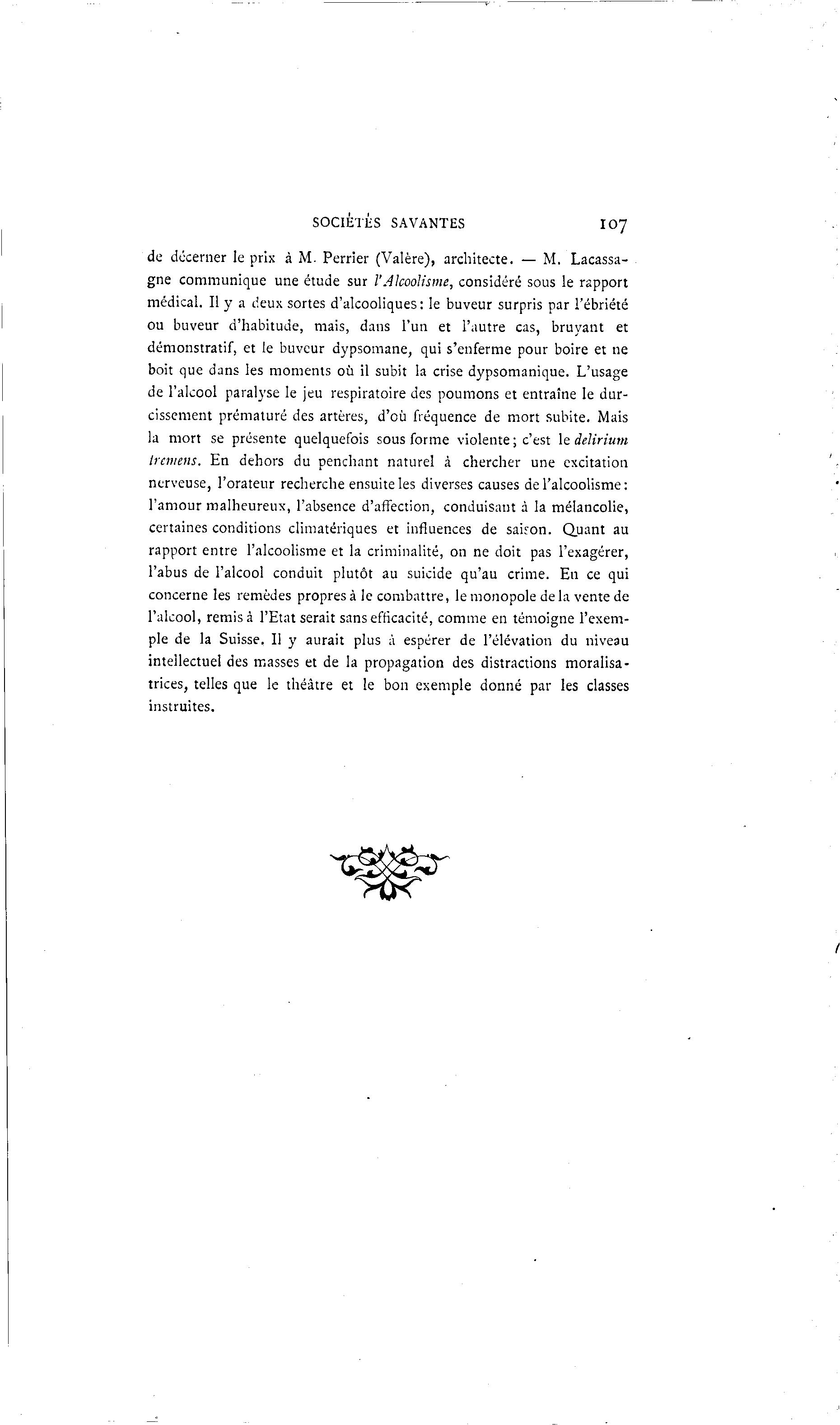 SOCIÉTÉS SAVANTES 107 de décerner le prix à M. Perrier (Valère), architecte. — M. Lacassa- gne communique une étude sur l'Alcoolisme, considéré sous le rapport médical. Il y a deux sortes d'alcooliques: le buveur surpris par l'ébriété ou buveur d'habitude, mais, dans l'un et l'autre cas, bruyant et démonstratif, et le buveur dypsomane, qui s'enferme pour boire et ne boit que dans les moments où il subit la crise dypsomanique. L'usage de l'alcool paralyse le jeu respiratoire des poumons et entraîne le dur- cissement prématuré des artères, d'où fréquence de mort subite. Mais la mort se présente quelquefois sous forme violente ; c'est le delirium Ircmens. En dehors du penchant naturel à chercher une excitation nerveuse, l'orateur recherche ensuite les diverses causes de l'alcoolisme: l'amour malheureux, l'absence d'affection, conduisant à la mélancolie, certaines conditions climatériques et influences de saison. Quant au rapport entre l'alcoolisme et la criminalité, on ne doit pas l'exagérer, l'abus de l'alcool conduit plutôt au suicide qu'au crime. En ce qui concerne les remèdes propres à le combattre, le monopole delà vente de l'alcool, remisa l'Etat serait sans efficacité, comme en témoigne l'exem- ple de la Suisse. Il y aurait plus à espérer de l'élévation du niveau intellectuel des masses et de la propagation des distractions moralisa- trices, telles que le théâtre et le bon exemple donné par les classes instruites.
