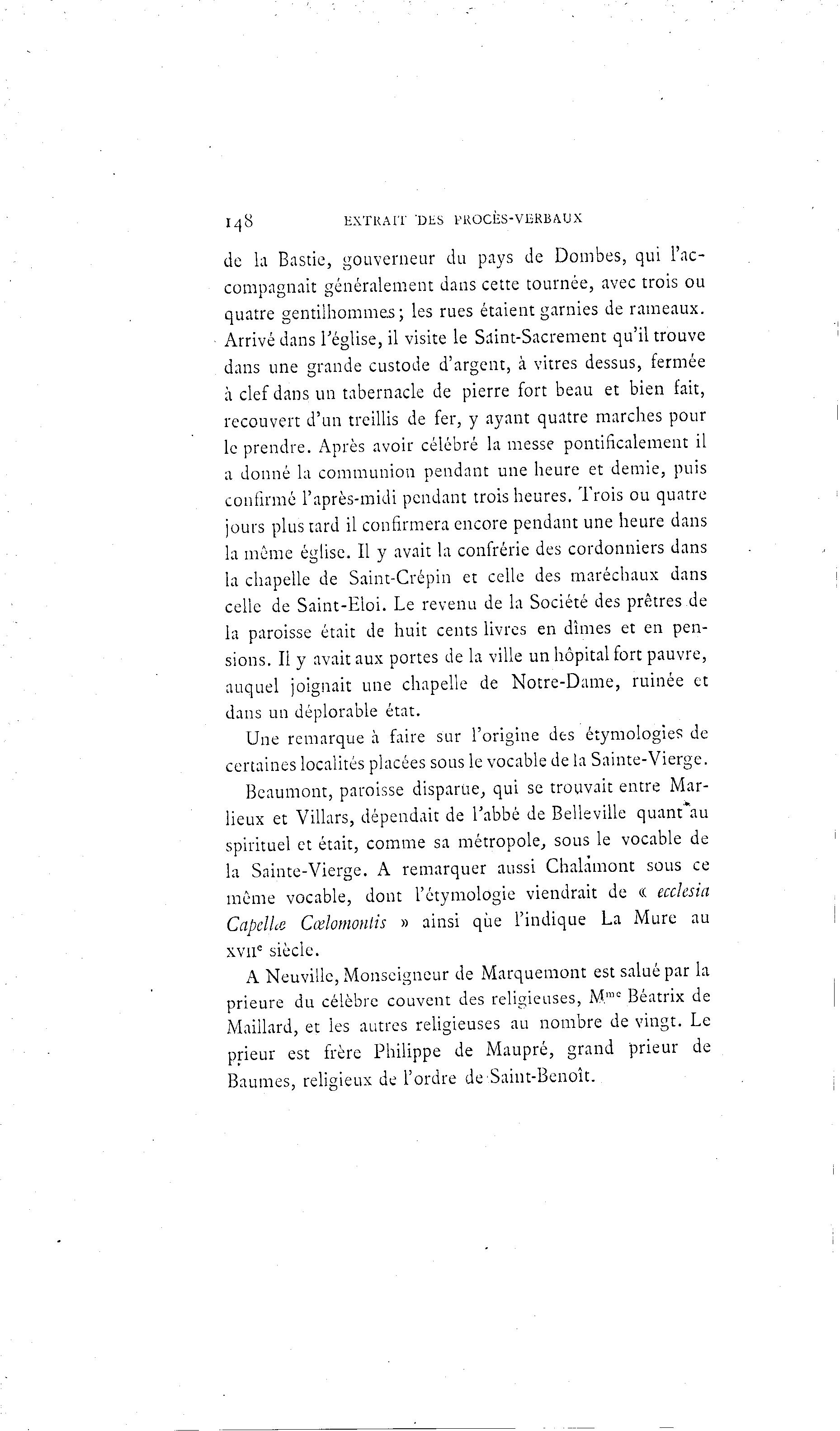 I48 EXTRAIT DES PROCÈS-VERBAUX de la Bastie, gouverneur du pays de Dombes, qui l'ac- compagnait généralement dans cette tournée, avec trois ou quatre gentilhomme^ ; les rues étaient garnies de rameaux. Arrivé dans l'église, il visite le Saint-Sacrement qu'il trouve dans une grande custode d'argent, à vitres dessus, fermée à clef dans un tabernacle de pierre fort beau et bien l'ait, recouvert d'un treillis de fer, y ayant quatre marches pour le prendre. Après avoir célébré la messe pontificalement il a donné la communion pendant une heure et demie, puis confirmé l'après-midi pendant trois heures. Trois ou quatre jours plus tard il confirmera encore pendant une heure dans la même église. Il y avait la confrérie des cordonniers dans la chapelle de Saint-Crépin et celle des maréchaux dans celle de Saint-Eloi. Le revenu de la Société des prêtres de la paroisse était de huit cents livres en dîmes et en pen- sions. Il y avait aux portes de la ville un hôpital fort pauvre, auquel joignait une chapelle de Notre-Dame, ruinée et dans un déplorable état. Une remarque à faire sur l'origine des étymologies de certaines localités placées sous le vocable de la Sainte-Vierge. Beaumont, paroisse disparue, qui se trouvait entre Mar- lieux et Villars, dépendait de l'abbé de Belleville quant*au spirituel et était, comme sa métropole, sous le vocable de la Sainte-Vierge. A remarquer aussi Chalamont sous ce même vocable, dont l'étymologie viendrait de « ecclesia CapelUe Cœlomonlis » ainsi que l'indique La Mure au xvuc siècle. A Neuville, Monseigneur de Marquemont est salué par la prieure du célèbre couvent des religieuses, Mmc Béatrix de Maillard, et les autres religieuses au nombre de vingt. Le prieur est frère Philippe de Maupré, grand prieur de Baumes, religieux de l'ordre de Saint-Benoît.