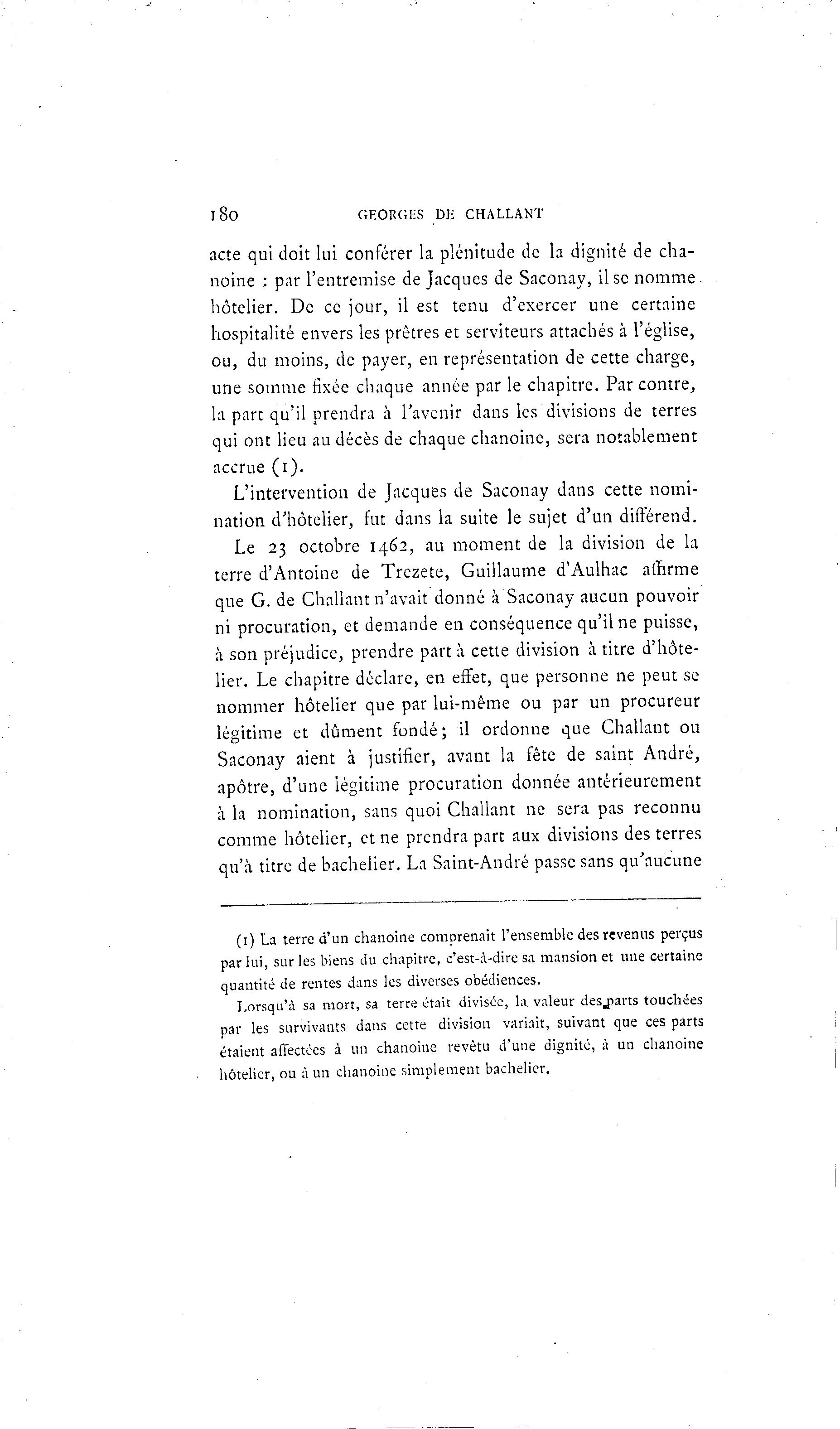 i8o GEORGES DK CHALLANT acte qui doit lui conférer la plénitude de la dignité de cha- noine .: par l'entremise de Jacques de Saconay, il se nomme, hôtelier. De ce jour, il est tenu d'exercer une certaine hospitalité envers les prêtres et serviteurs attachés à l'église, ou, du moins, de payer, en représentation de cette charge, une somme fixée chaque année par le chapitre. Par contre, la part qu'il prendra à l'avenir dans les divisions de terres qui ont lieu au décès de chaque chanoine, sera notablement accrue ( i ) . L'intervention de Jacques de Saconay dans cette nomi- nation d'hôtelier, fut dans la suite le sujet d'un différend. Le 23 octobre 1462, au moment de la division de la terre d'Antoine de Trezete, Guillaume d'Aulhac affirme que G. de Challant n'avait donné à Saconay aucun pouvoir ni procuration, et demande en conséquence qu'il ne puisse, à son préjudice, prendre part à cette division à titre d'hôte- lier. Le chapitre déclare, en effet, que personne ne peut se nommer hôtelier que par lui-même ou par un procureur légitime et dûment fondé ; il ordonne que Challant ou Saconay aient à justifier, avant la fête de saint André, apôtre, d'une légitime procuration donnée antérieurement à la nomination, sans quoi Challant ne sera pas reconnu comme hôtelier, et ne prendra part aux divisions des terres qu'à titre de bachelier. La Saint-André passe sans qu'aucune (1) La terre d'un chanoine comprenait l'ensemble des revenus perçus par lui, sur les biens du chapitre, c'est-à -dire sa mansion et une certaine quantité de rentes dans les diverses obédiences. Lorsqu'à sa mort, sa terre était divisée, la valeur desj)arts touchées par les survivants dans cette division variait, suivant que ces parts étaient affectées à un chanoine revêtu d'une dignité, à un chanoine hôtelier, ou à un chanoine simplement bachelier.