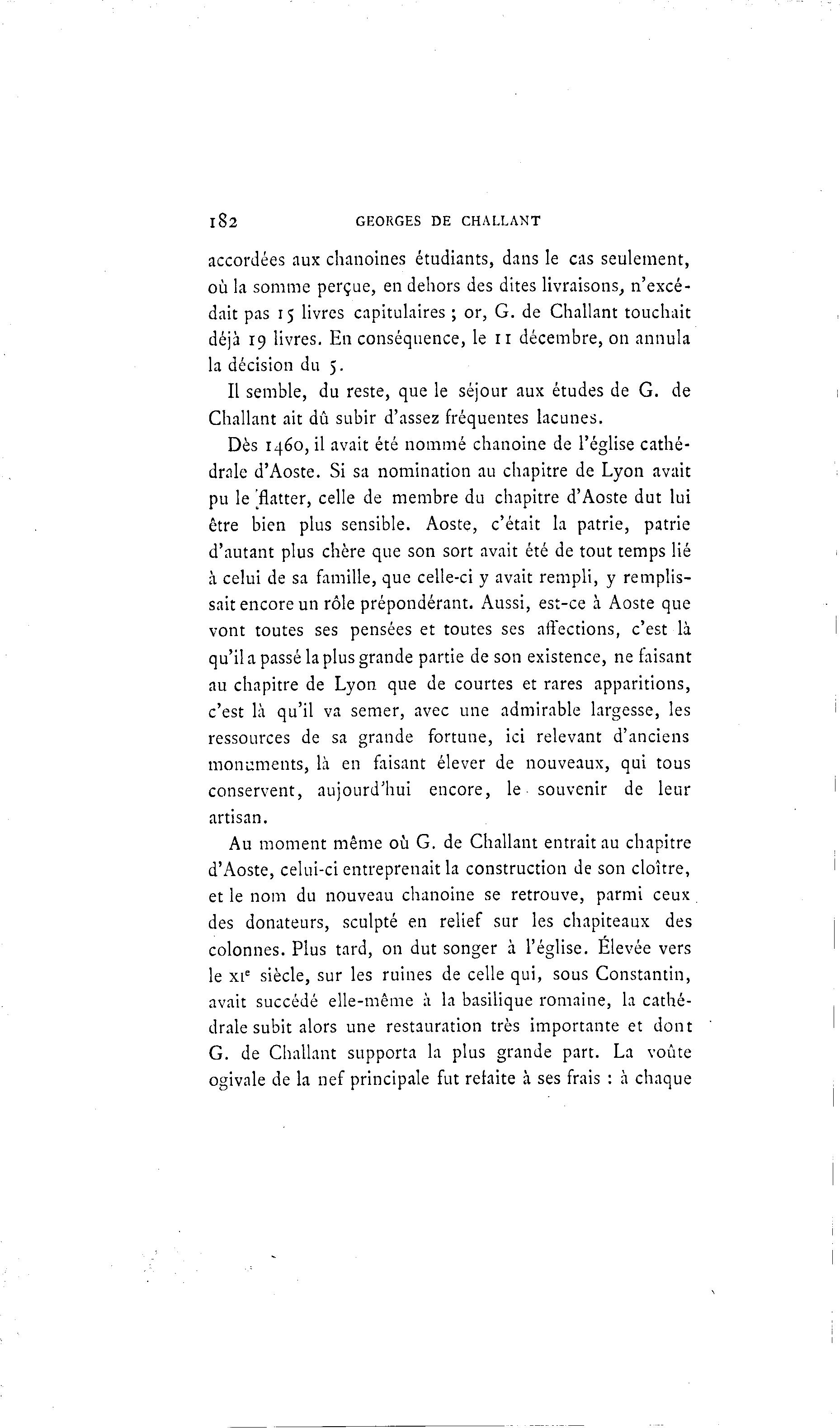 l82 GEORGES DE CHALLANT accordées aux chanoines étudiants, dans le cas seulement, où la somme perçue, en dehors des dites livraisons, n'excé- dait pas 15 livres capitulaires ; or, G. de Challant touchait déjà 19 livres. En conséquence, le n décembre, on annula la décision du 5. Il semble, du reste, que le séjour aux études de G. de Challant ait dû subir d'assez fréquentes lacunes. Dès 1460, il avait été nommé chanoine de l'église cathé- drale d'Aoste. Si sa nomination au chapitre de Lyon avait pu le ^flatter, celle de membre du chapitre d'Aoste dut lui être bien plus sensible. Aoste, c'était la patrie, patrie d'autant plus chère que son sort avait été de tout temps lié à celui de sa famille, que celle-ci y avait rempli, y remplis- sait encore un rôle prépondérant. Aussi, est-ce à Aoste que vont toutes ses pensées et toutes ses affections, c'est là qu'il a passé la plus grande partie de son existence, ne faisant au chapitre de Lyon que de courtes et rares apparitions, c'est là qu'il va semer, avec une admirable largesse, les ressources de sa grande fortune, ici relevant d'anciens monuments, là en faisant élever de nouveaux, qui tous conservent, aujourd'hui encore, le souvenir de leur artisan. Au moment même où G. de Challant entrait au chapitre d'Aoste, celui-ci entreprenait la construction de son cloître, et le nom du nouveau chanoine se retrouve, parmi ceux des donateurs, sculpté en relief sur les chapiteaux des colonnes. Plus tard, on dut songer à l'église. Élevée vers le xic siècle, sur les ruines de celle qui, sous Constantin, avait succédé elle-même à la basilique romaine, la cathé- drale subit alors une restauration très importante et dont G. de Challant supporta la plus grande part. La voûte ogivale de la nef principale fut refaite à ses frais : à chaque