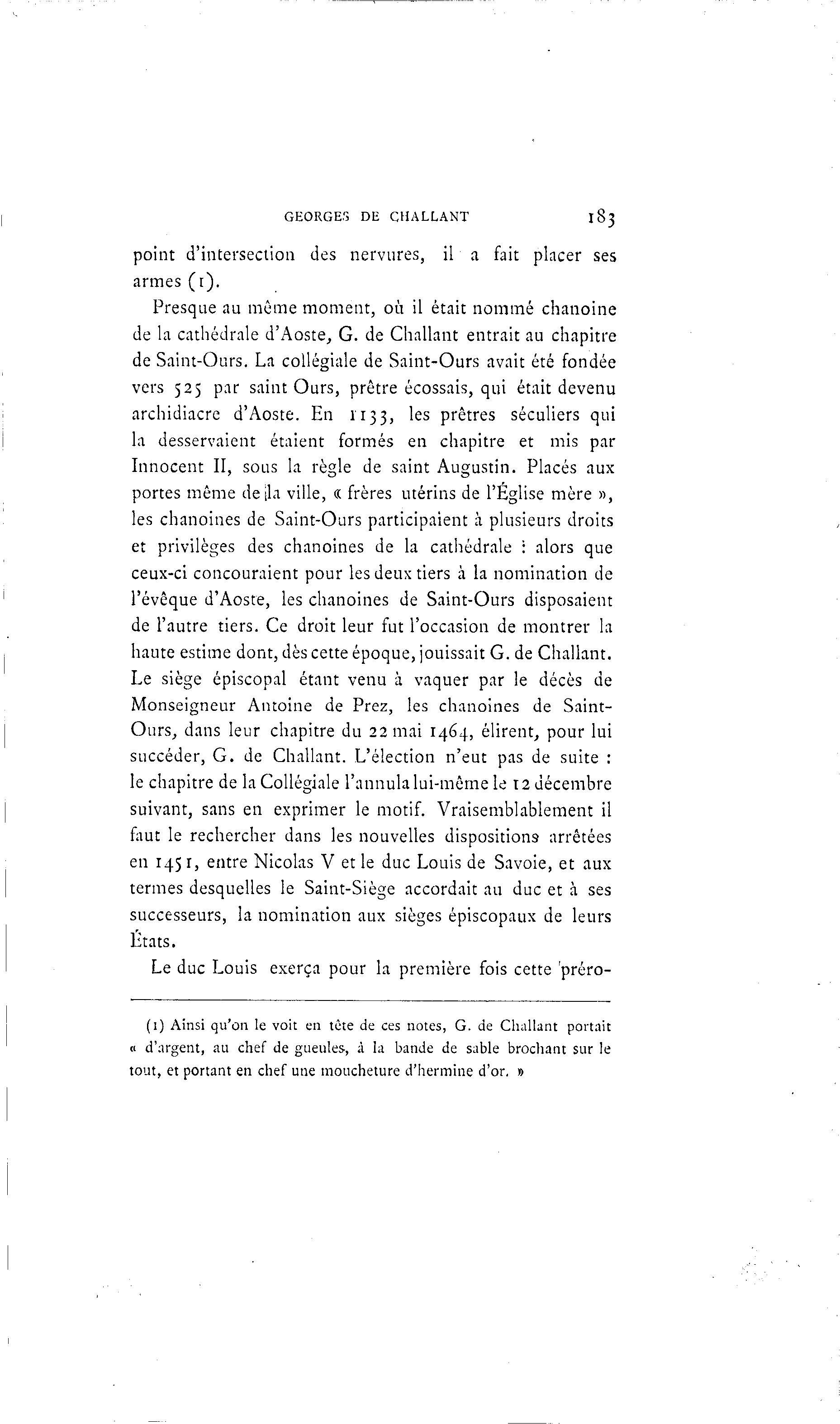 GEORGES DE CHALLANT 183 point d'intersection des nervures, il a fait placer ses armes ( r ) . Presque au même moment, où il était nommé chanoine de la cathédrale d'Aoste, G. de Challant entrait au chapitre de Saint-Ours. La collégiale de Saint-Ours avait été fondée vers 525 par saint Ours, prêtre écossais, qui était devenu archidiacre d'Aoste. En 1133, les prêtres séculiers qui la desservaient étaient formés en chapitre et mis par Innocent II, sous la règle de saint Augustin. Placés aux portes même de [la ville, « frères utérins de l'Église mère », les chanoines de Saint-Ours participaient à plusieurs droits et privilèges des chanoines de la cathédrale : alors que ceux-ci concouraient pour les deux tiers à la nomination de l'évêque d'Aoste, les chanoines de Saint-Ours disposaient de l'autre tiers. Ce droit leur fut l'occasion de montrer la haute estime dont, dès cette époque, jouissait G. de Challant. Le siège épiscopal étant venu à vaquer par le décès de Monseigneur Antoine de Prez, les chanoines de Saint- Ours, dans leur chapitre du 22 mai 1464, élirent, pour lui succéder, G. de Challant. L'élection n'eut pas de suite : le chapitre de la Collégiale l'annula lui-même le 12 décembre suivant, sans en exprimer le motif. Vraisemblablement il faut le rechercher dans les nouvelles dispositions arrêtées en 1451, entre Nicolas V et le duc Louis de Savoie, et aux termes desquelles le Saint-Siège accordait au duc et à ses successeurs, la nomination aux sièges épiscopaux de leurs États. Le duc Louis exerça pour la première fois cette 'préro- (1) Ainsi qu'on le voit en tête de ces notes, G. de Challant portait « d'argent, au chef de gueules, à la bande de sable brochant sur le tout, et portant en chef une moucheture d'hermine d'or. »