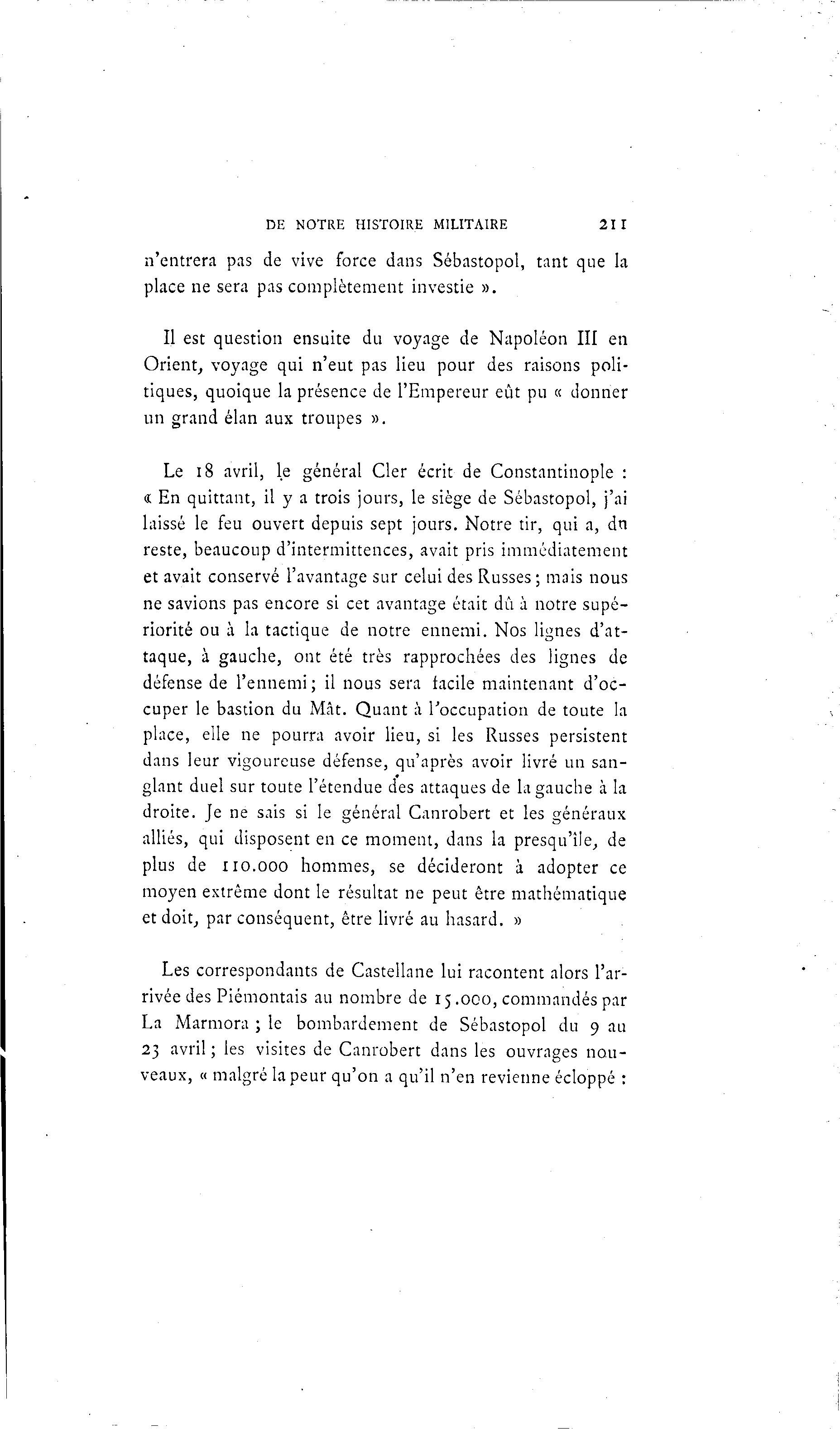 DE NOTRE HISTOIRE MILITAIRE 211 n'entrera pas de vive force dans Sébastopol, tant que la place ne sera pas complètement investie ». Il est question ensuite du voyage de Napoléon III en Orient, voyage qui n'eut pas lieu pour des raisons poli- tiques, quoique la présence de l'Empereur eût pu « donner un grand élan aux troupes ». Le 18 avril, le général Cler écrit de Constantinople : « En quittant, il y a trois jours, le siège de Sébastopol, j'ai laissé le feu ouvert depuis sept jours. Notre tir, qui a, dn reste, beaucoup d'intermittences, avait pris immédiatement et avait conservé l'avantage sur celui des Russes; mais nous ne savions pas encore si cet avantage était dû à notre supé- riorité ou à la tactique de notre ennemi. Nos lignes d'at- taque, à gauche, ont été très rapprochées des lignes de défense de l'ennemi ; il nous sera facile maintenant d'oc- cuper le bastion du Mât. Quant à l'occupation de toute la place, elle ne pourra avoir lieu, si les Russes persistent dans leur vigoureuse défense, qu'après avoir livré un san- glant duel sur toute l'étendue des attaques de la gauche à la droite. Je ne sais si le général Canrobert et les généraux alliés, qui disposent en ce moment, dans la presqu'île, de plus de 110.000 hommes, se décideront à adopter ce moyen extrême dont le résultat ne peut être mathématique et doit, par conséquent, être livré au hasard. » Les correspondants de Castellane lui racontent alors l'ar- rivée des Piemontais au nombre de 15.000, commandés par La Marmora ; le bombardement de Sébastopol du 9 au 23 avril ; les visites de Canrobert dans les ouvrages nou- veaux, « malgré la peur qu'on a qu'il n'en revienne écloppé :