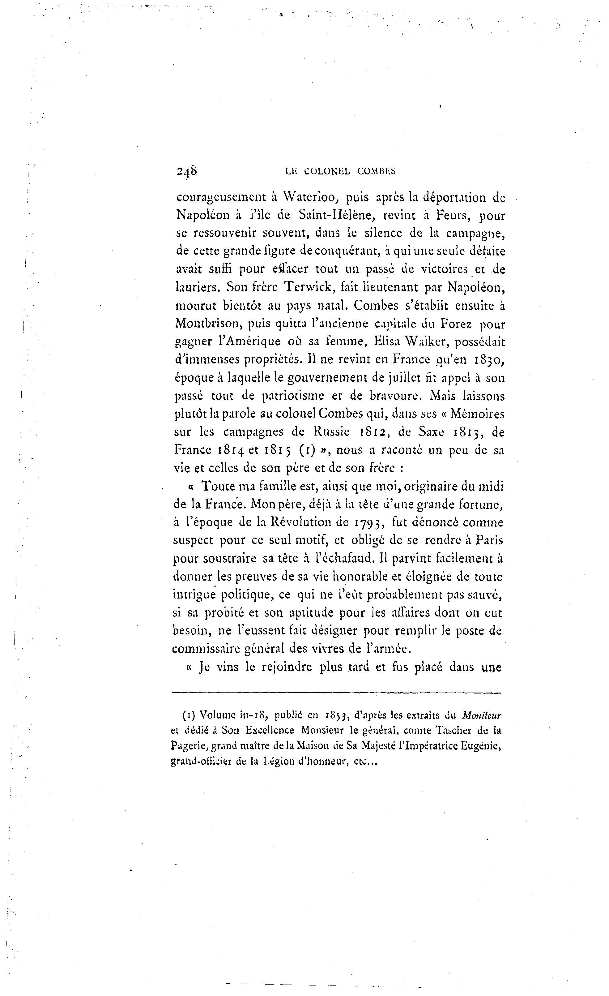 24S LE COLONEL COMBES courageusement à Waterloo, puis après la déportation de Napoléon à l'île de Saint-Hélène, revint à Feurs, pour se ressouvenir souvent, dans le silence de la campagne, de cette grande figure de conquérant, à qui une seule défaite avait suffi pour effacer tout un passé de victoires et de lauriers. Son frère Terwick, fait lieutenant par Napoléon, mourut bientôt au pays natal. Combes s'établit ensuite à Montbrison, puis quitta l'ancienne capitale du Forez pour gagner l'Amérique où sa femme, Elisa Walker, possédait d'immenses propriétés. 11 ne revint en France qu'en 1830, époque à laquelle le gouvernement de juillet fit appel à son passé tout de patriotisme et de bravoure. Mais laissons plutôt la parole au colonel Combes qui, dans ses « Mémoires sur les campagnes de Russie 1812, de Saxe 1813, de France i 8 i 4 e t 1815 (r) », nous a raconté un peu de sa vie et celles de son père et de son frère : « Toute ma famille est, ainsi que moi, originaire du midi de la France. Mon père, déjà à la tète d'une grande fortune, à l'époque de la Révolution de 1793, fut dénoncé comme suspect pour ce seul motif, et obligé de se rendre à Paris pour soustraire sa tête à l'échafaud. Il parvint facilement à donner les preuves de sa vie honorable et éloignée de toute intrigue politique, ce qui ne l'eût probablement pas sauvé, si sa probité et son aptitude pour les affaires dont on eut besoin, ne l'eussent fait désigner pour remplir le poste de commissaire général des vivres de l'armée. « Je vins le rejoindre plus tard et fus placé dans une (1) Volume in-18, publié en 1853. d'après les extraits du Moniteur et dédié à Son Excellence Monsieur le général, comte Tascher de la Pagerie, grand maître de la Maison de Sa Majesté l'Impératrice Eugénie, grand-officier de la Légion d'honneur, e t c .