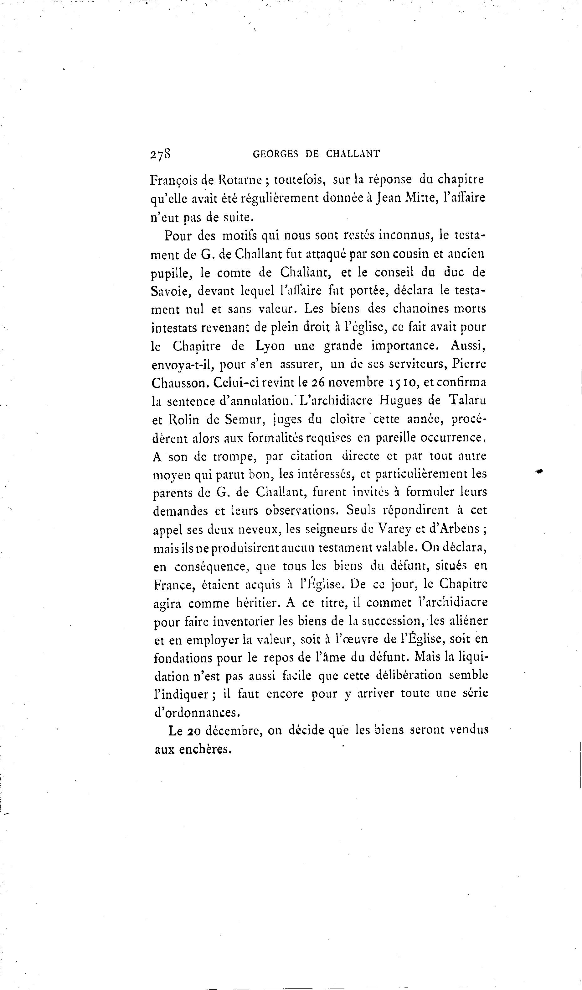 278 GEORGES DE CHALLANT François de Rotarne ; toutefois, sur la réponse du chapitre qu'elle avait été régulièrement donnée à Jean Mitte, l'affaire n'eut pas de suite. Pour des motifs qui nous sont restés inconnus, le testa- ment de G. de Challant fut attaqué par son cousin et ancien pupille, le comte de Challant, et le conseil du duc de Savoie, devant lequel l'affaire fut portée, déclara le testa- ment nul et sans valeur. Les biens des chanoines morts intestats revenant de plein droit à l'église, ce fait avait pour le Chapitre de Lyon une grande importance. Aussi, envoya-t-il, pour s'en assurer, un de ses serviteurs, Pierre Chausson. Celui-ci revint le 26 novembre 1510, et confirma la sentence d'annulation. L'archidiacre Hugues de Talaru et Rolin de Semur, juges du cloître cette année, procé- dèrent alors aux formalités requises en pareille occurrence. A son de trompe, par citation directe et par tout autre moyen qui parut bon, les intéressés, et particulièrement les parents de G. de Challant, furent invités à formuler leurs demandes et leurs observations. Seuls répondirent à cet appel ses deux neveux, les seigneurs de Varey et d'Arbens ; mais ils ne produisirent aucun testament valable. On déclara, en conséquence, que tous les biens du défunt, situés en France, étaient acquis à l'Église. De ce jour, le Chapitre agira comme héritier. A ce titre, il commet l'archidiacre pour faire inventorier les biens de la succession, les aliéner et en employer la valeur, soit à l'œuvre de l'Église, soit en fondations pour le repos de l'âme du défunt. Mais la liqui- dation n'est pas aussi facile que cette délibération semble l'indiquer ; il faut encore pour y arriver toute une série d'ordonnances. Le 20 décembre, on décide que les biens seront vendus aux enchères.