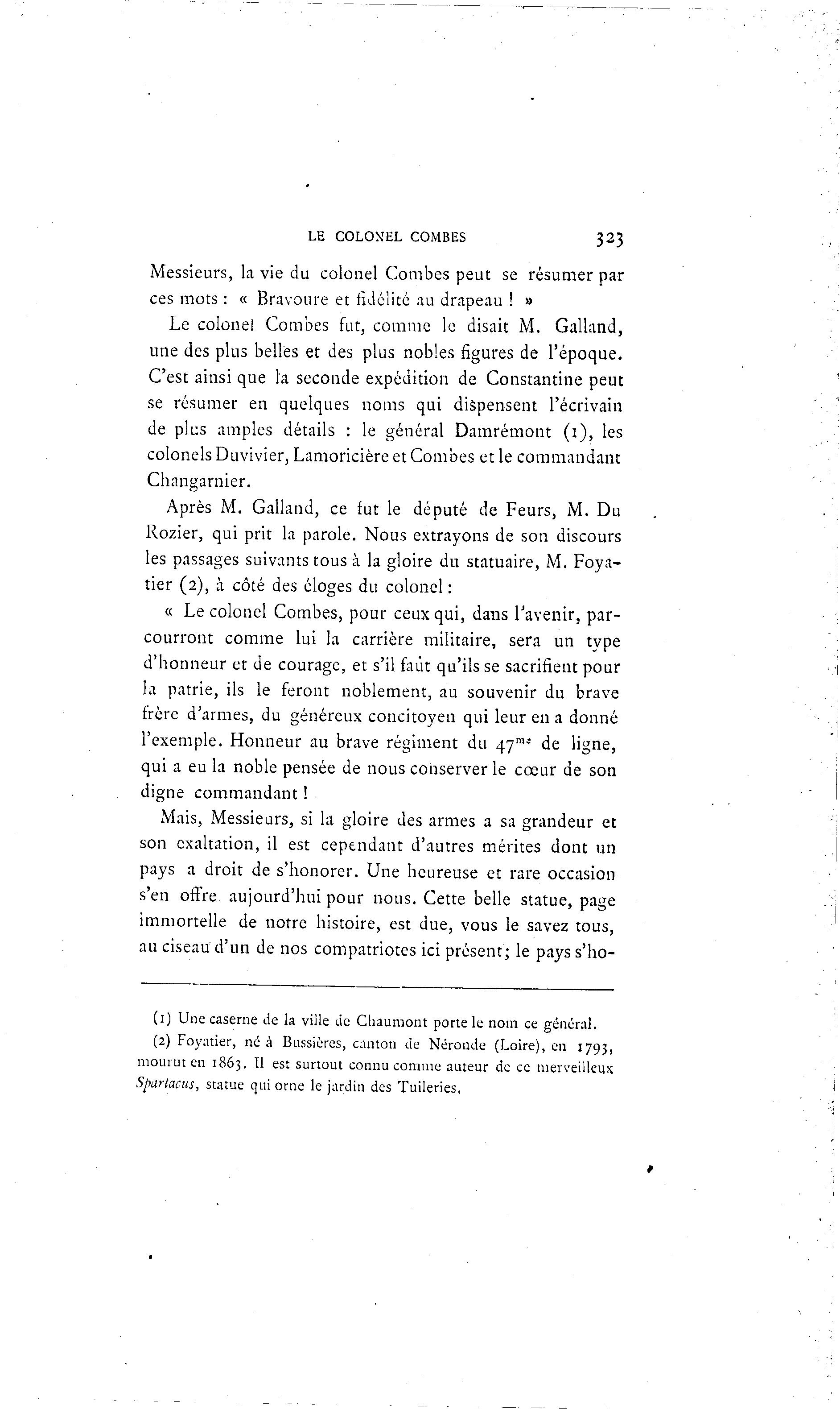 LE COLONEL COMBES 323 xMessieurs, la vie du colonel Combes peut se résumer par ces mots : « Bravoure et fidélité au drapeau ! » Le colonel Combes fut, comme le disait M. Galland, une des plus belles et des plus nobles figures de l'époque. C'est ainsi que la seconde expédition de Constantine peut se résumer en quelques noms qui dispensent l'écrivain de plus amples détails : le général Damrémont ( i ) , les colonels Duvivier, Lamoricière et Combes et le commandant Changarnier. Après M. Galland, ce fut le député de Feurs, M. Du Rozier, qui prit la parole. Nous extrayons de son discours les passages suivants tous à la gloire du statuaire, M. Foya- tier (2), à côté des éloges du colonel : « Le colonel Combes, pour ceux qui, dans l'avenir, par- courront comme lui la carrière militaire, sera un type d'honneur et de courage, et s'il faut qu'ils se sacrifient pour la patrie, ils le feront noblement, au souvenir du brave frère d'armes, du généreux concitoyen qui leur en a donné l'exemple. Honneur au brave régiment du 47™" de ligne, qui a eu la noble pensée de nous conserver le cœur de son digne commandant ! Mais, Messieurs, si la gloire des armes a sa grandeur et son exaltation, il est cependant d'autres mérites dont un pays a droit de s'honorer. Une heureuse et rare occasion s'en offre, aujourd'hui pour nous. Cette belle statue, page immortelle de notre histoire, est due, vous le savez tous, au ciseau d'un de nos compatriotes ici présent; le pays s'ho- (1) Une caserne de la ville de Chaumont porte le nom ce général. (2) Foyatier, né à Bussières, canton de Néronde (Loire), en 1793, mourut en 1863, Il est surtout connu comme auteur de ce merveilleux Spartacus, statue qui orne le jardin des Tuileries,