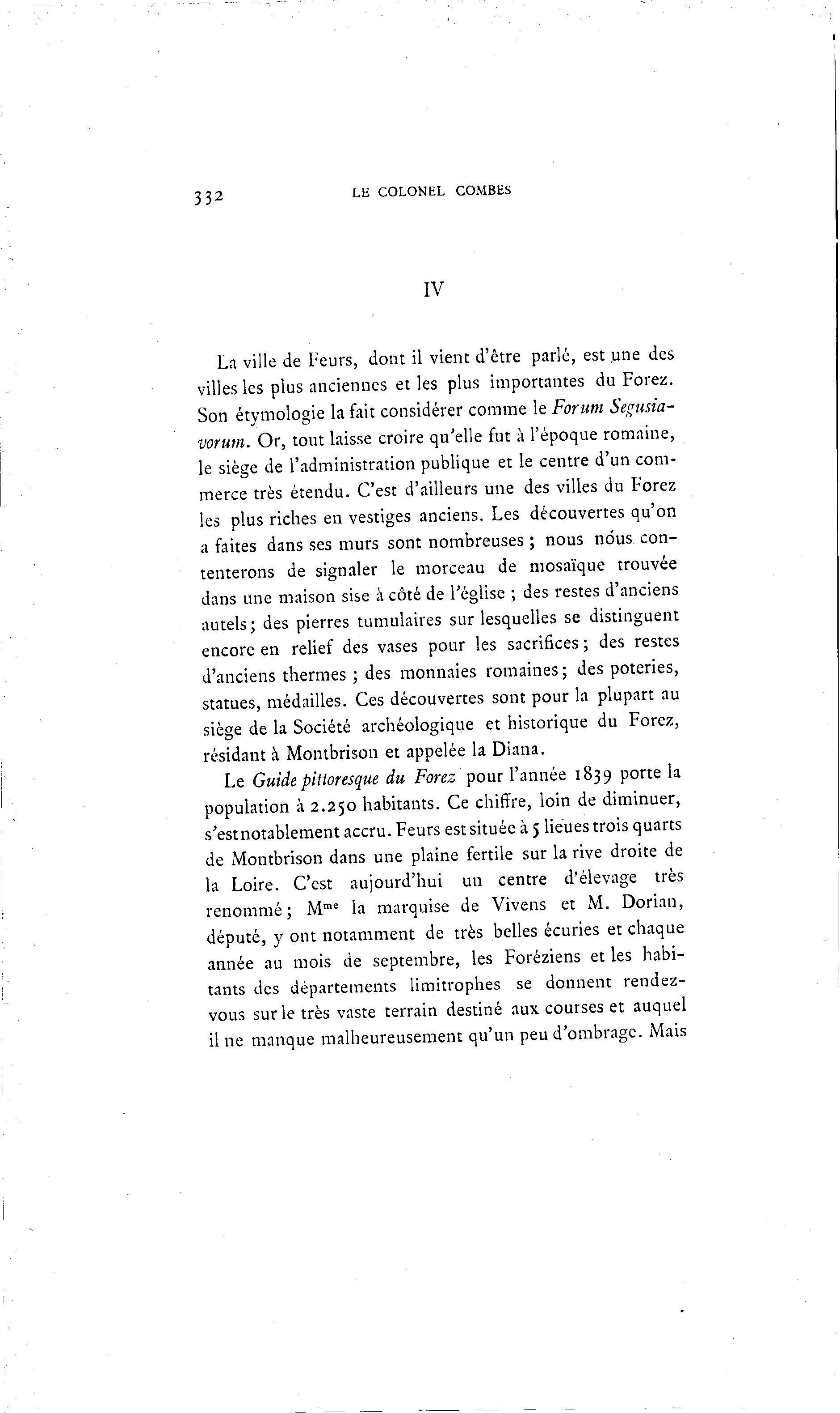 332 LE COLONEL COMBES IV La ville de Feurs, dont il vient d'être parlé, est une des villes les plus anciennes et les plus importantes du Forez. Son étymologie la fait considérer comme le Forum Segusia- vorum. Or, tout laisse croire qu'elle fut à l'époque romaine, le siège de l'administration publique et le centre d'un com- merce très étendu. C'est d'ailleurs une des villes du Forez les plus riches en vestiges anciens. Les découvertes qu'on a faites dans ses murs sont nombreuses ; nous nous con- tenterons de signaler le morceau de mosaïque trouvée dans une maison sise à côté de l'église ; des restes d'anciens autels ; des pierres tumulaires sur lesquelles se distinguent encore en relief des vases pour les sacrifices ; des restes d'anciens thermes ; des monnaies romaines ; des poteries, statues, médailles. Ces découvertes sont pour la plupart au siège de la Société archéologique et historique du Forez, résidant à Montbrison et appelée la Diana. Le Guide pittoresque du Forez pour l'année 1839 porte la population à 2.250 habitants. Ce chiffre, loin de diminuer, s'estnotablement accru. Feurs est située à 5 lieues trois quarts de Montbrison dans une plaine fertile sur la rive droite de la Loire. C'est aujourd'hui un centre d'élevage très renommé; Mme la marquise de Vivens et M. Dorian, député, y ont notamment de très belles écuries et chaque année au mois de septembre, les Foréziens et les habi- tants des départements limitrophes se donnent rendez- vous sur le très vaste terrain destiné aux courses et auquel il ne manque malheureusement qu'un peu d'ombrage. Mais