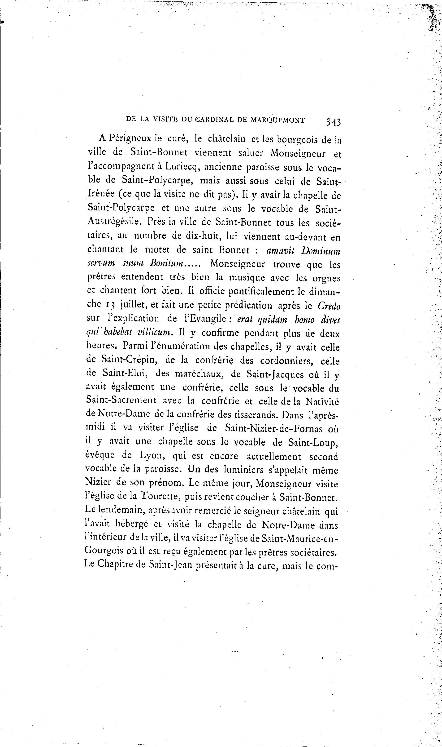 DE LA VISITE DU CARDINAL DE MARQUEMONT 543 A Périgneux le curé, le châtelain et les bourgeois de la ville de Saint-Bonnet viennent saluer Monseigneur et l'accompagnent à Luriecq, ancienne paroisse sous le voca- ble de Saint-Polycarpe, mais aussi sous celui de Saint- Irénée (ce que la visite ne dit pas). Il y avait la chapelle de Saint-Polycarpe et une autre sous le vocable de Saint- Au'jtrégésile. Près la ville de Saint-Bonnet tous les socié- taires, au nombre de dix-huit, lui viennent au-devant en chantant le motet de saint Bonnet : amavit Dominum servutn suum Bonilum Monseigneur trouve que les prêtres entendent très bien la musique avec les orgues et chantent fort bien. Il officie pontificalement le diman- che 13 juillet, et fait une petite prédication après le Credo sur l'explication de l'Evangile : erat quidam homo dives qui habebat villicum. Il y confirme pendant plus de deux heures. Parmi l'énumération des chapelles, il y avait celle de Saint-Crépin, de la confrérie des cordonniers, celle de Saint-Eloi, des maréchaux, de Saint-Jacques où il y avait également une confrérie, celle sous le vocable du Saint-Sacrement avec la confrérie et celle de la Nativité de Notre-Dame de la confrérie des tisserands. Dans l'après- midi il va visiter l'église de Saint-Nizier-de-Fornas où il y avait une chapelle sous le vocable de Saint-Loup, évêque de Lyon, qui est encore actuellement second vocable de la paroisse. Un des luminiers s'appelait même Nizier de son prénom. Le même jour, Monseigneur visite l'église de la Tourette, puis revient coucher à Saint-Bonnet. Le lendemain, après avoir remercié le seigneur châtelain qui l'avait hébergé et visité la chapelle de Notre-Dame dans l'intérieur de la ville, il va visiter l'église de Saint-Maurice-en- Gourgois où il est reçu également parles prêtres sociétaires. Le Chapitre de Saint-Jean présentait à la cure, mais le com-