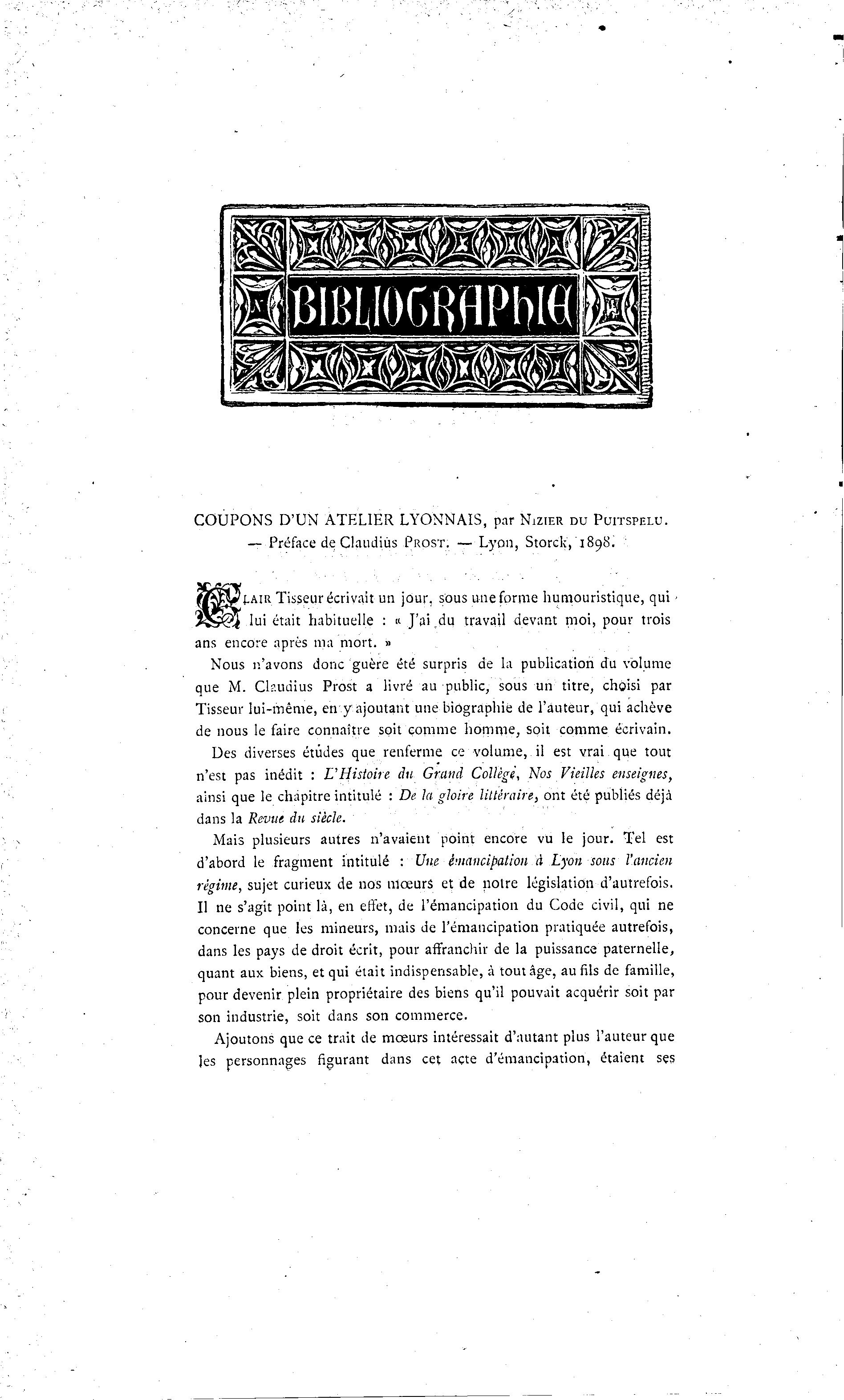 — Préface de Claudiûs PROST. — Lyon, Storck, 1898.