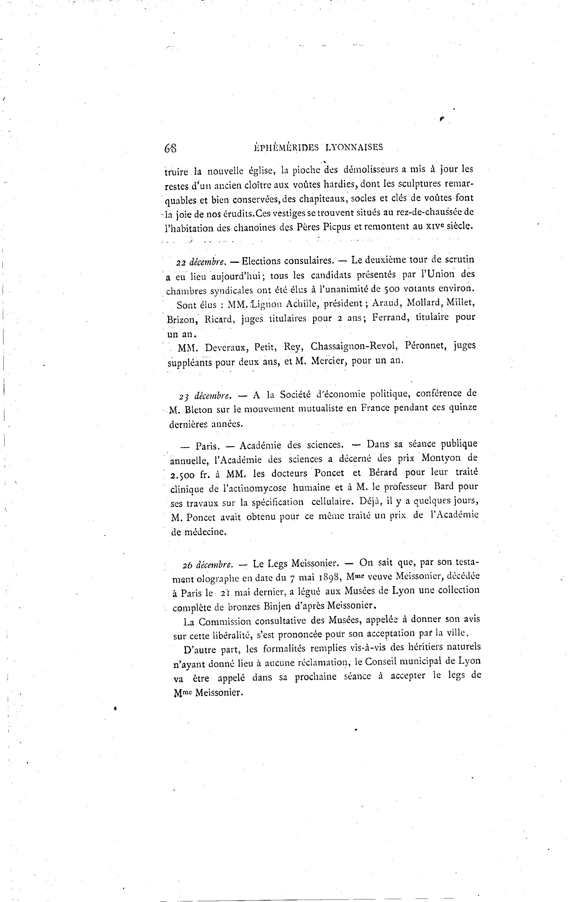 t 6-8 ÉPHÉMÈRIDES LYONNAISES tr'uire la nouvelle église, la pioche des démolisseurs a mis à jour les restes d'un ancien cloître aux voûtes hardies, dont les sculptures remar- quables et bien conservées, des chapiteaux, socles et clés de voûtes font la jo're de nos érudits.Ces vestiges se trouvent situés au rez-de-chaus'sée de l'habitation des chanoines des Pères Picpus et remontent au xrve siècle. 22 décembre. — Elections consulaires. — Le deuxième tour de scrutin a eu lieu aujourd'hui; tous les candidats présentés par l'Union des chambres syndicales ont été élus à l'unanimité de 500 votants environ. Sont élus : MM.'Lignon Achille, président ; Araud, Mollard, Millet, Brizon, Ricard, juges titulaires pour 2 ans; Ferrand, titulaire pour un a n . MM. Deveraux, Petit, Rey, Chassaignon-Revol, Péronnet, juges suppléants pour deux ans, et M. Mercier, pour un an. 2} décembre. — A la Société d'économie politique, conférence de M. Bleton sur le mouvement mutualiste en France pendant ces quinze dernières années. — Paris. — Académie des sciences. — Dans sa séance publique annuelle, l'Académie des sciences a décerné des prix Montyon de 2.500 fr. à MM. les docteurs Poncet et Bérard pour leur traité clinique de l'actinomycose humaine et à M. le professeur Bard pour ses travaux sur la spécification cellulaire. Déjà , il y a quelques jours, M. Poncet avait obtenu pour ce même traité un prix de l'Académie de médecine. 26 décembre. — Le Legs Meissonier. — On sait que, par son testa- ment olographe en date du 7 mai 1898, M me veuve Meissonier, décédée à Paris le 21 mai dernier, a légué aux Musées de Lyon une collection complète de bronzes Binjen d'après Meissonier. La Commission consultative des Musées, appelée à donner son avis sur cette libéralité, s'est prononcée pour son acceptation par la ville. D'autre part, les formalités remplies vis-à -vis des héritiers naturels n'ayant donné lieu à aucune réclamation, le Conseil municipal de Lyon va être appelé dans sa prochaine séance à accepter le legs de M m e Meissonier.