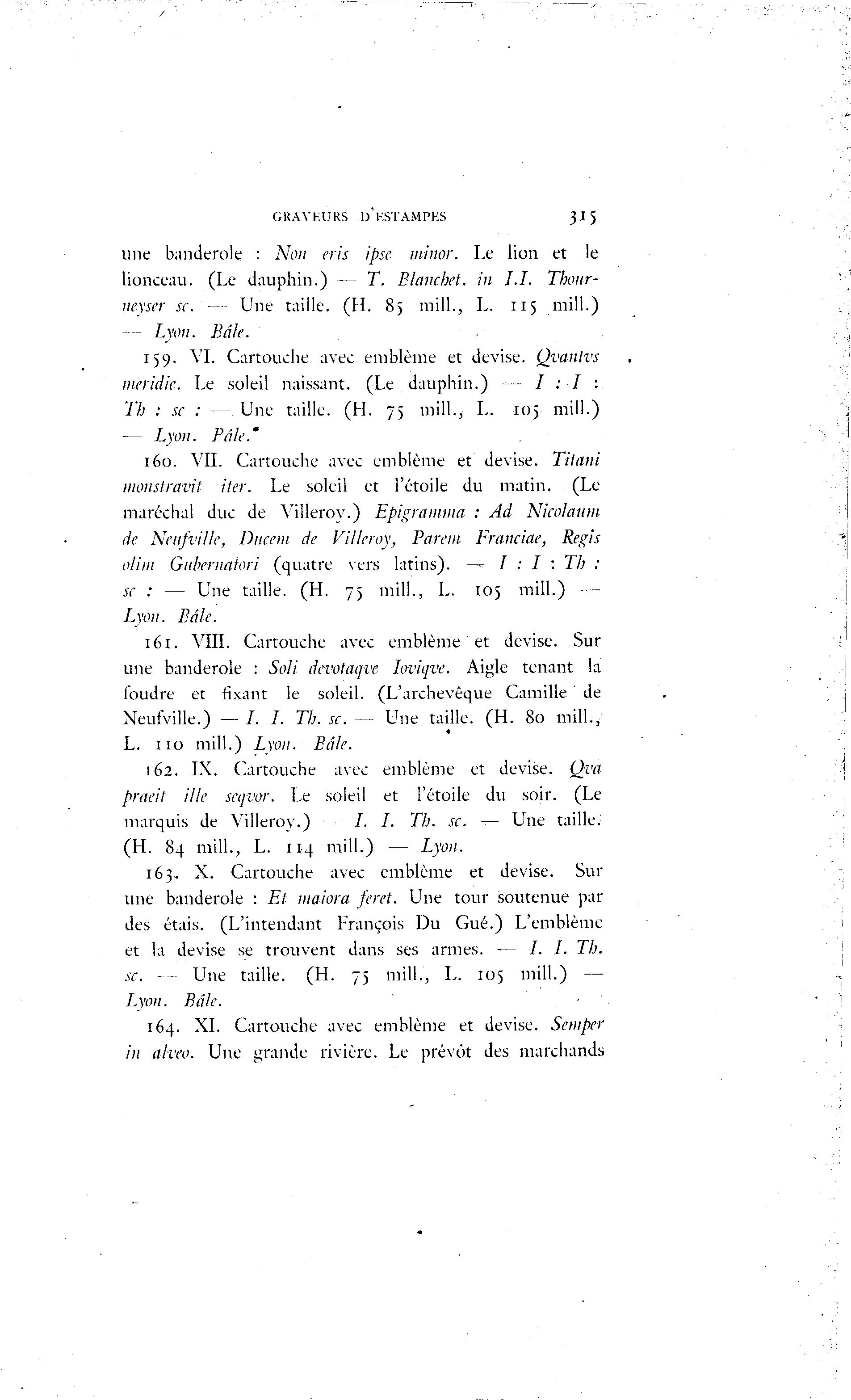 GRAVKURS D'KSTAMPKS 315 une banderole : Non cris ipse ininor. Le lion et le lionceau. (Le dauphin.) — T. Flanchet, in I.I. Thour- neyser se. — Une taille. (H. 85 mill., L. 115 mill.) •— Lyon. Bâle. 159. VI. Cartouche avec emblème et devise. Qyanivs meridic. Le soleil naissant. (Le dauphin.) — 1 : 1 : Th : se : — Une taille. (H. 75 mill., L. 105 mill.) — Lyon. Pâle.' 160. VIL Cartouche avec emblème et devise. Titani monstravit iter. Le soleil et l'étoile du matin. (Le maréchal duc de Villeroy.) Epigramma : Ad Nicolaum de Neiifvi/le, Dncein de Villeroy, Pare m Eranciae, Régis olim Gubematori (quatre vers latins). — I : I : Th : se : — Une taille. (H. 75 mill., L. 105 mill.) — Lyon. Bâle. 161. VIII. Cartouche avec emblème et devise. Sur une banderole : Soli dcvotaqve loviqve. Aigle tenant la foudre et fixant le soleil. (L'archevêque Camille de Neufville.) — /. /. Th. se. — Une taille. (H. 80 mill., L. 110 mill.) Lyon. Pâle. 162. IX. Cartouche avec emblème et devise. Qva praeit ille seqvor. Le soleil et l'étoile du soir. (Le marquis de Villeroy.) — /. /. Th. se. — Une taille. (H. 84 mill., L. 114 mill.) — Lyon. 163. X. Cartouche avec emblème et devise. Sur une banderole : Et niaiora feret. Une tour soutenue par des étais. (L'intendant François Du Gué.) L'emblème et la devise se trouvent dans ses armes. — L L Th. se. — Une taille. (H. 75 mill., L. 105 mill.) — Lyon. Pâle. - 164. XL Cartouche avec emblème et devise. Senipcr in alveo. Une grande rivière. Le prévôt des marchands