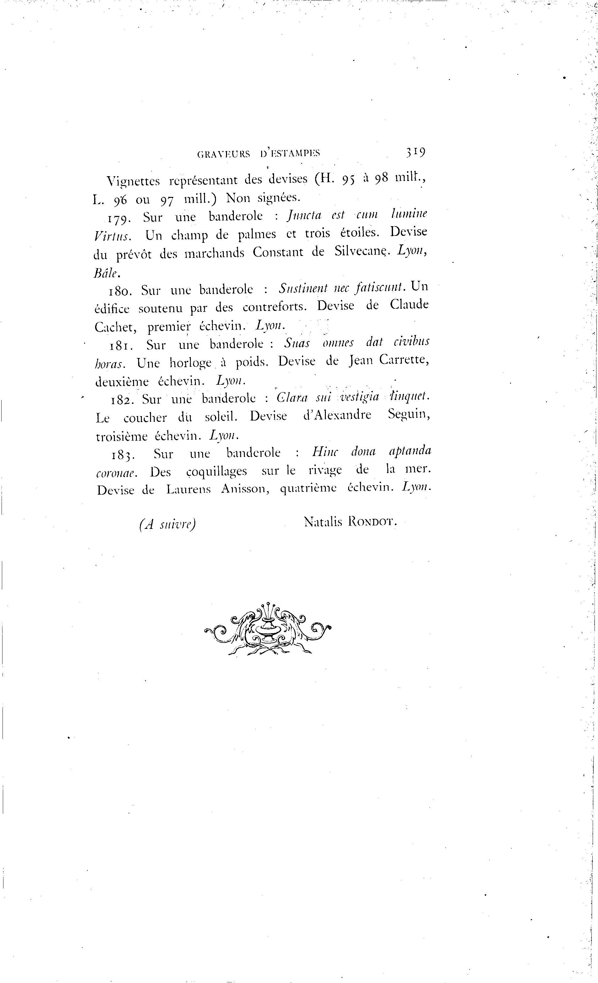 GRAVEURS D KSTAMP1-S 319 Vignettes représentant des devises (H. 95 à 98 mil!., L. 9*6 ou 97 mill.) Non signées. 179. Sur une banderole : Jiincta est cum lamine Virtus. Un champ de palmes et trois étoiles. Devise du prévôt des marchands Constant de Silvecane. Lyon, Bâk. 180. Sur une banderole : Sustinent nec fatiscitnt. Un édifice soutenu par des contreforts. Devise de Claude Cachet, premier échevin. Lyon. 181. Sur une banderole : Suas omîtes dat civibus horas. Une horloge à poids. Devise de Jean Carrette, deuxième échevin. Lyon. 182. Sur une banderole : Glana sui vesiigia 'linquel. Le coucher du soleil. Devise d'Alexandre Seguin, troisième échevin. Lyon. 183. Sur une banderole : Hinc doua aptanda coronae. Des coquillages sur le rivage de la mer. Devise de Laurens Anisson, quatrième échevin. Lyon. (A suivre) Natalis RONDOT.