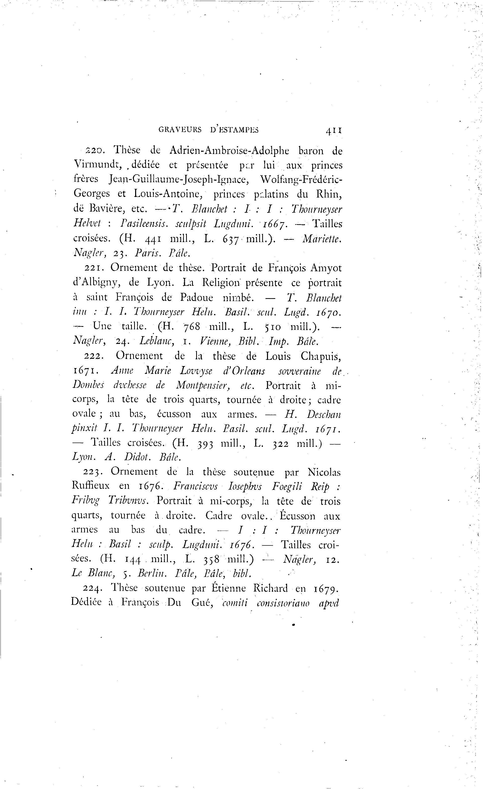 GRAVEURS D'ESTAMPES 4II 220. Thèse de Adrien-Ambroise-Adolphe baroii de Virmundt, , dédiée et présentée pr.r lui aux princes frères Jean-Guillaume-Joseph-Ignace, Wolfang-Frédéric- Georges et Louis-Antoine, princes pdatins du Rhin, de Bavière, etc. — T . Blanchet : I : I : Thoumeyser Helvet : Pasileensis. sculpsit Lugduni. 1667. — Tailles croisées. (H. 441 mill., L. 637 mill.). — Mariette. Nagler, 23. Paris. Pâle. 221. Ornement de thèse. Portrait de François Amyot d'Albigny, de Lyon. La Religion présente ce portrait à saint François de Padoue nimbé. — T. Blanchet iint : L I. Thoumeyser Hein. Basil, seul. Lugd. I6JO. — Une taille. (H. 768 mill., L. 510 mill.). — Nagler, 24. Leblanc, 1. Vienne, Bibl. Imp. Bâte. 222. Ornement de la thèse de Louis Chapuis, 1671. Anne Marie Lovvyse d'Orléans sovveraine de. Bombes dvchesse de Montpensier, etc. Portrait à mi- corps, la tête de trois quarts, tournée à droite; cadre ovale ; au bas, éeusson aux armes. — H. Deschan pinxit I. I. Thoumeyser Hein. Basil, seul. Lugd. 1671. — Tailles croisées. (H. 393 mill., L. 322 mill.) — Lyon. A. Didot. Bâle. 223. Ornement de la thèse soutenue par Nicolas Ruffieux en 1676. Franciscvs loseplrvs Foegili Reip : Fribvg Tribvnvs. Portrait à mi-corps/ la tête de trois quarts, tournée à . droite. Cadre ovale.. Ecusson aux armes au bas du cadre. — / : / ; Thourneyseï' Helu : Basil : scalp. Lugduni. 1676. — Tailles croi- sées. (H. 144 . mill., L. 358 mill.) — Nagler, 12. Le Blanc, 5. Berlin. Pâle, Bâle, bibl. 224. Thèse soutenue par Etienne Richard en 1679. Dédiée à François Du Gué, comili consistoriauo apvd