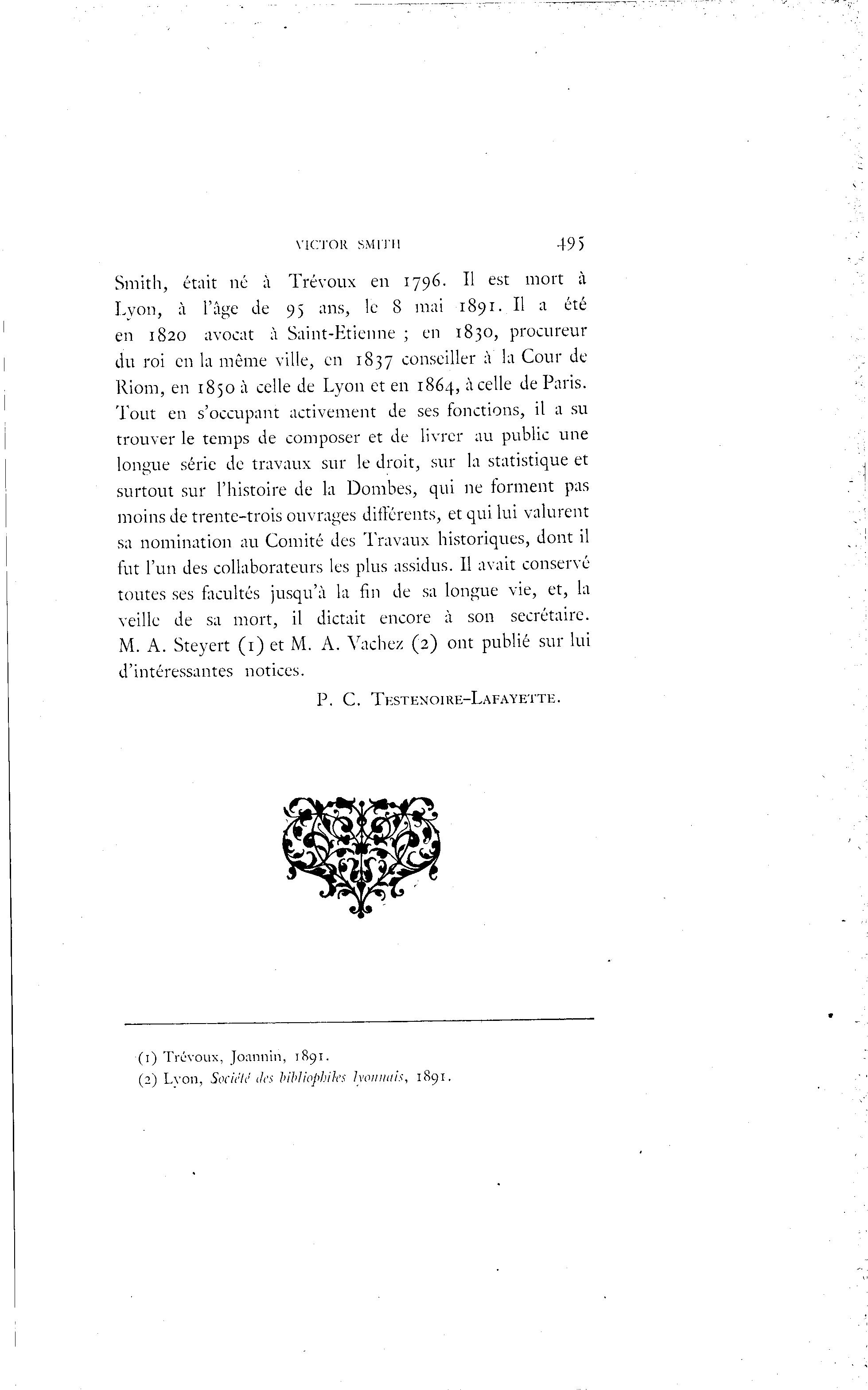 VICTOR SMITH 495 Smith, était né à Trévoux en 1796. Il est mort à Lyon, à l'âge de 95 ans, le 8 mai 1891. Il a été en 1820 avocat à Saint-Etienne ; en 1830, procureur du roi en la même ville, en 1837 conseiller à la Cour de Riom, en 1850 à celle de Lyon et en 1864, à celle de Paris. Tout en s'occupant activement de ses fonctions, il a su trouver le temps de composer et de livrer au public une longue série de travaux sur le droit, sur la statistique et surtout sur l'histoire de la Dombes, qui ne forment pas moins de trente-trois ouvrages différents, et qui lui valurent sa nomination au Comité des Travaux historiques, dont il fut l'un des collaborateurs les plus assidus. Il avait conservé toutes ses facultés jusqu'à la fin de sa longue vie, et, la veille de sa mort, il dictait encore à son secrétaire. M. A. Steyert (1) et M. A. Vachez (2) ont publié sur lui d'intéressantes notices. P. C. TESTENOIRE-LAFAYETTE. (1) Trévoux, Joannin, 1891. (2) Lvon, SocirW tics hihliophiks Ivomiais, 1891.