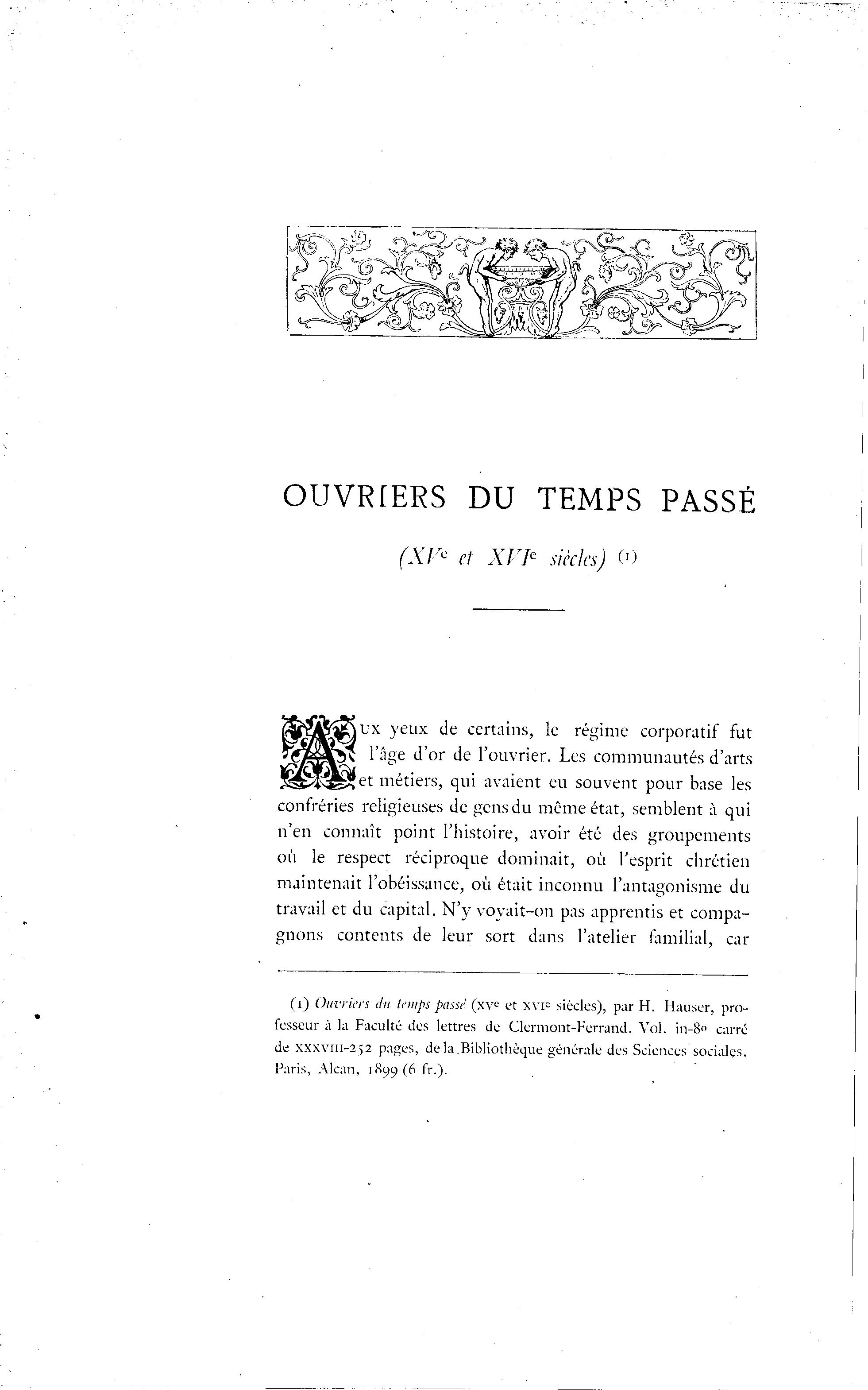 OUVRIERS DU TEMPS PASSÉ (XVe et XVIe siècles) (') ux yeux de certains, le régime corporatif fut l'âge d'or de l'ouvrier. Les communautés d'arts et métiers, qui avaient eu souvent pour base les confréries religieuses de gens du même état, semblent à qui n'en connaît point l'histoire, avoir été des groupements où le respect réciproque dominait, où l'esprit clirétien maintenait l'obéissance, où était inconnu l'antagonisme du travail et du capital. N'y voyait-on pas apprentis et compa- gnons contents de leur sort dans l'atelier familial, car (i) Ouvriers du temps passe (xv e et xvi c siècles), par H. Hauser, pro- fesseur à la Faculté des lettres de Clermont-Ferrand. Vol. in-8" carré de xxxvin-252 pages, de la .Bibliothèque générale des Sciences sociales. Paris, Alcan, 1899(6 fr.).