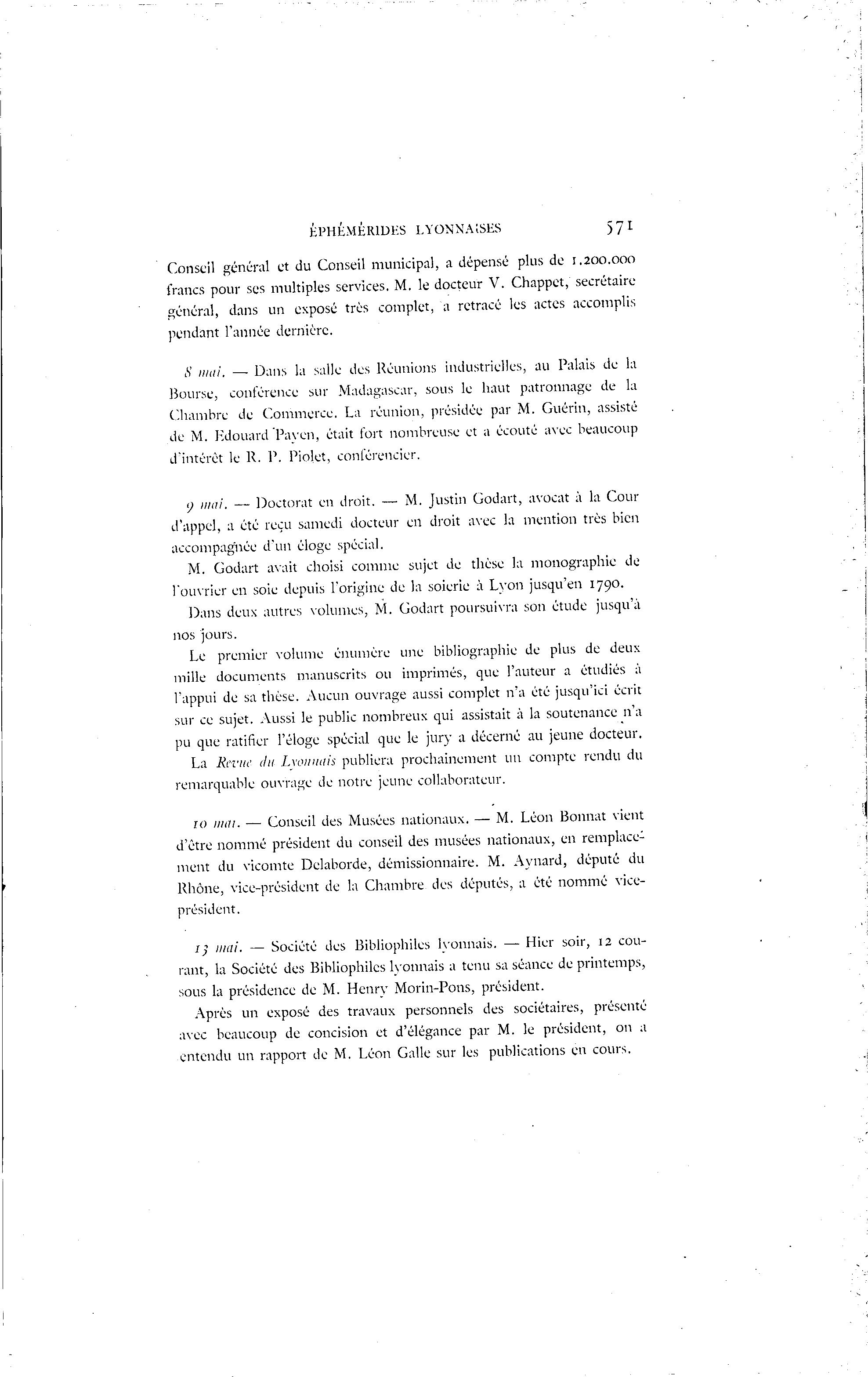 ÉPHÉMÉR1DKS LYONNAISES 571 Conseil général et du Conseil municipal, a dépensé plus de 1.200.000 francs pour ses multiples services. M. le docteur V. Chappet, secrétaire général, dans un exposé très complet, a retracé les actes accomplis pendant l'année dernière. S mai. — Dans la salle des Réunions industrielles, au Palais de la Bourse, conférence sur Madagascar, sous le haut patronnage de la Chambre de Commerce. La réunion, présidée par M. Guérin, assisté de M. Kdouard Paven, était fort nombreuse et a écouté avec beaucoup d'intérêt le R. P. Piolet, conférencier. y mai. — Doctorat en droit. — M. Justin Godart, avocat à la Cour d'appel, a été reçu samedi docteur en droit avec la mention très bien accompagnée d'un éloge spécial. M. Godart axait choisi comme sujet de thèse la monographie de l'ouvrier en soie depuis l'origine de la soierie à Lyon jusqu'en 1790. Dans deux autres volumes, M. Godart poursuivra son étude jusqu'à nos jours. Le premier volume énumère une bibliographie de plus de deux mille documents manuscrits ou imprimés, que l'auteur a étudiés à l'appui de sa thèse. Aucun ouvrage aussi complet n'a été jusqu'ici écrit sur ce sujet. Aussi le public nombreux qui assistait à la soutenance n'a pu que ratifier l'éloge spécial que le jury a décerné au jeune docteur. La Revue dit I.winuiis publiera prochainement un compte rendu du remarquable ouvrage de notre jeune collaborateur. ro mai. — Conseil des Musées nationaux. — M. Léon Bonnat vient d'être nommé président du conseil des musées nationaux, en remplace- ment du vicomte Delaborde, démissionnaire. M. Aynard, député du Rhône, vice-président de la Chambre des députés, a été nommé vice- président. 13 mai. — Société des Bibliophiles lvonnais. — Hier soir, 12 cou- rant, la Société des Bibliophiles lyonnais a tenu sa séance de printemps, sous la présidence de M. Henry Morin-Pons, président. Après un exposé des travaux personnels des sociétaires, présenté avec beaucoup de concision et d'élégance par M. le président, on a entendu un rapport de M. Léon Galle sur les publications en cours.