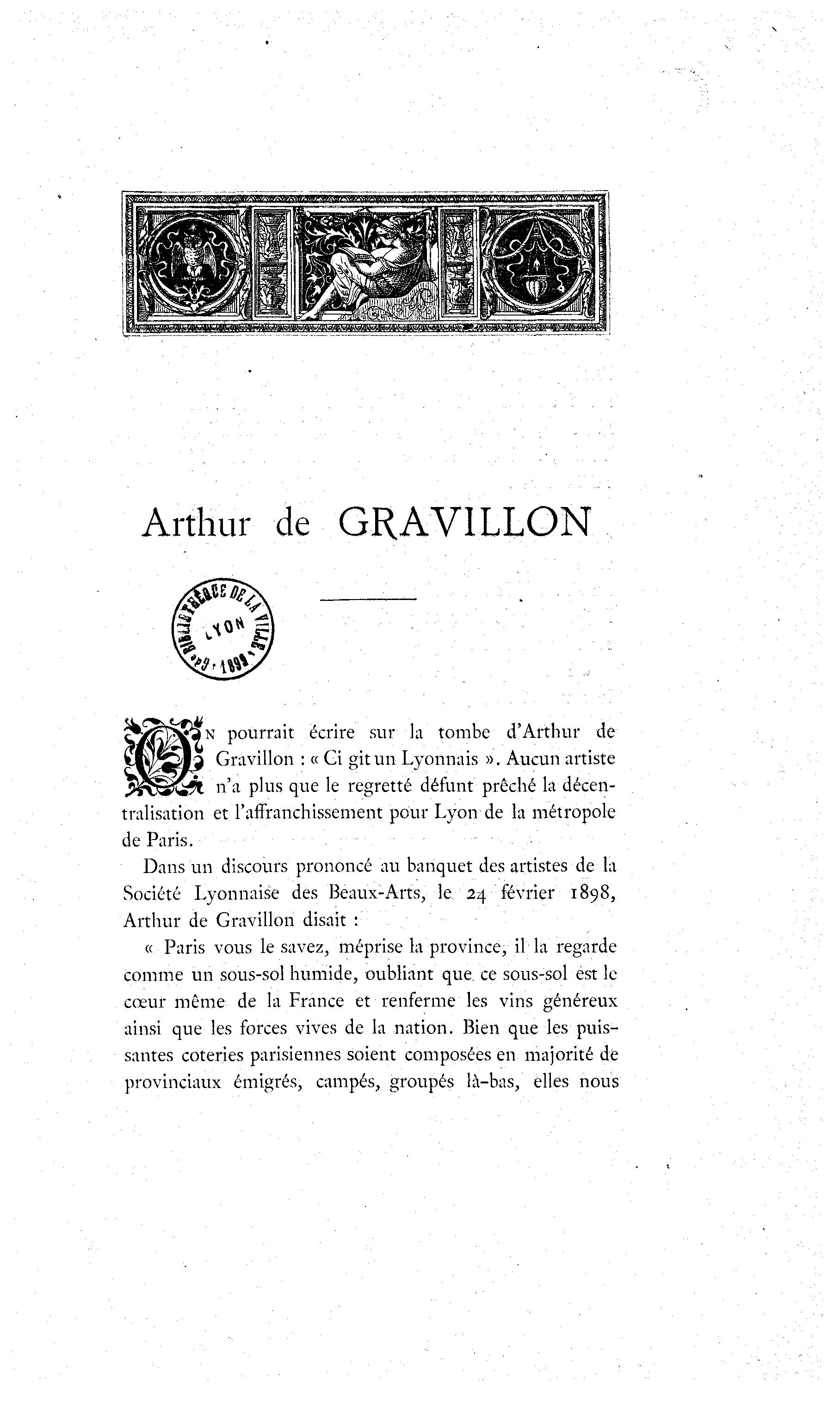 tralisation et l'affranchissement pour Lyon de la métropole de Paris. Dans un discours prononcé au banquet des artistes de la Société Lyonnaise des Beaux-Arts, le 24 février 1898, Arthur de Gravillon disait : « Paris vous le savez, méprise la province, il la regarde comme un sous-sol humide, oubliant que ce sous-sol est le cœur même de la France et renferme les vins généreux ainsi que les forces vives de la nation. Bien que les puis- santes coteries parisiennes soient composées en majorité de provinciaux émigrés, campés, groupés là -bas, elles nous