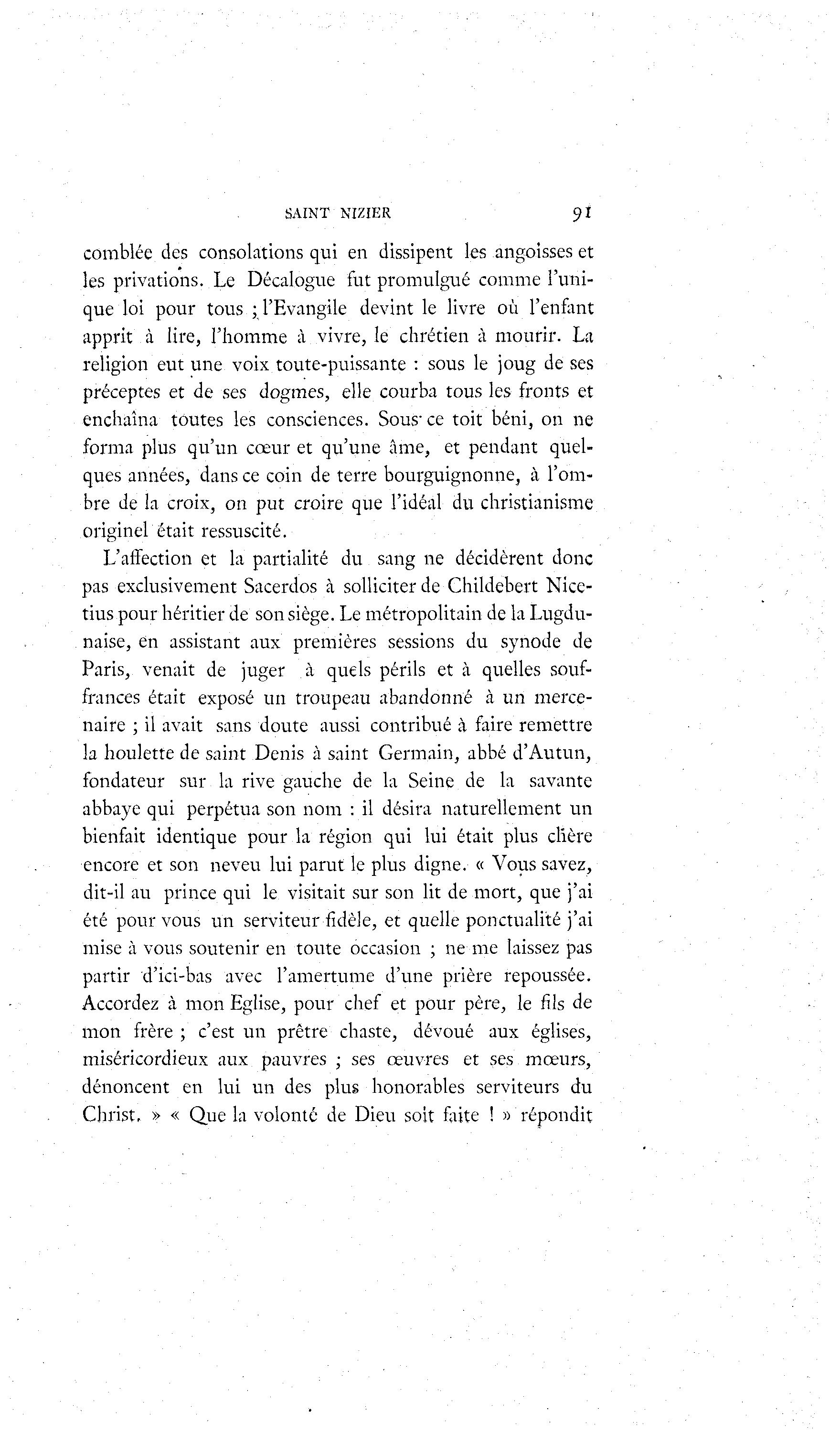 SAINT NIZIER 91 comblée des consolations qui en dissipent les angoisses et les privations. Le Décalogue fut promulgué comme l'uni- que loi pour tous ; l'Evangile devint le livre où l'enfant apprit à lire, l'homme à vivre, le chrétien à mourir. La religion eut une voix toute-puissante : sous le joug de ses préceptes et de ses dogmes, elle courba tous les fronts et enchaîna toutes les consciences. Sous- ce toit béni, on ne forma plus qu'un cœur et qu'une âme, et pendant quel- ques années, dans ce coin de terre bourguignonne, à l'om- bre de la croix, on put croire que l'idéal du christianisme originel était ressuscité. L'affection et la partialité du sang ne décidèrent donc pas exclusivement Sacerdos à solliciter de Childebert Nice- tius pour héritier de son siège. Le métropolitain de la Lugdu- naise, en assistant aux premières sessions du synode de Paris, venait de juger à quels périls et à quelles souf- frances était exposé un troupeau abandonné à un merce- naire ; il avait sans doute aussi contribué à faire remettre la houlette de saint Denis à saint Germain, abbé d'Autun, fondateur sur la rive gauche de la Seine de la savante abbaye qui perpétua son nom : il désira naturellement un bienfait identique pour la région qui lui était plus chère encore et son neveu lui parut le plus digne. « Vous savez, dit-il au prince qui le visitait sur son lit de mort, que j'ai été pour vous un serviteur fidèle, et quelle ponctualité j'ai mise à vous soutenir en toute occasion ; ne me laissez pas partir d'ici-bas avec l'amertume d'une prière repoussée. Accordez à mon Eglise, pour chef et pour père, le fils de mon frère ; c'est un prêtre chaste, dévoué aux églises, miséricordieux aux pauvres ; ses œuvres et ses mœurs, dénoncent en lui un des plus honorables serviteurs du Christ, » « Que la volonté de Dieu soit faite ! » répondit