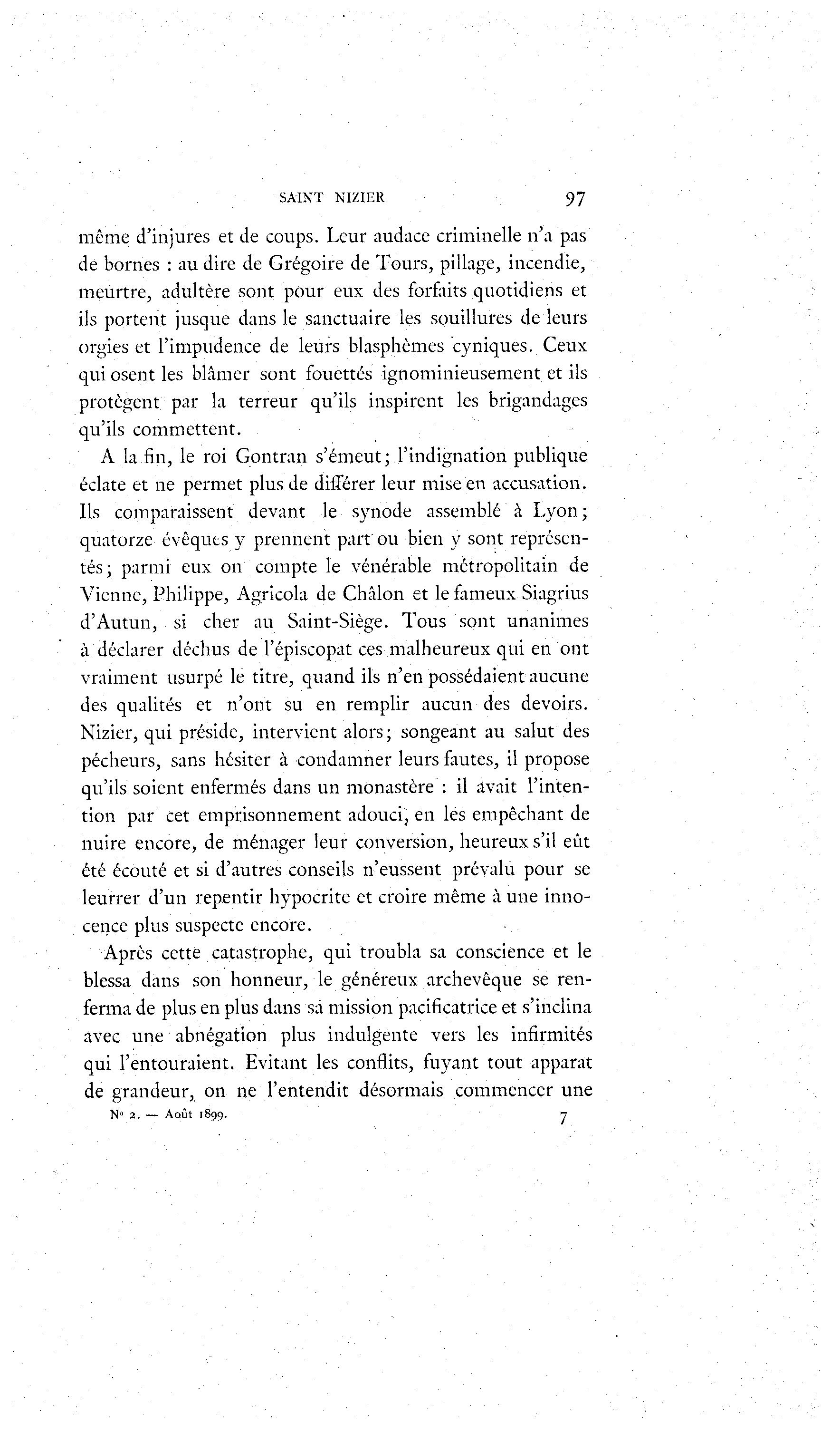 SAINT NIZIER 97 même d'injures et de coups. Leur audace criminelle n'a pas de bornes : au dire de Grégoire de Tours, pillage, incendie, meurtre, adultère sont pour eux des forfaits quotidiens et ils portent jusque dans le sanctuaire les souillures de leurs orgies et l'impudence de leurs blasphèmes cyniques. Ceux qui osent les blâmer sont fouettés ignominieusement et ils protègent par la terreur qu'ils inspirent les brigandages qu'ils commettent. A la fin, le roi Gontran s'émeut; l'indignation publique éclate et ne permet plus de différer leur mise en accusation. Ils comparaissent devant le synode assemblé à Lyon ; quatorze évoques y prennent part ou bien y sont représen- tés; parmi eux on compte le vénérable métropolitain de Vienne, Philippe, Agricola de Châlon et le fameux Siagrius d'Autun, si cher au Saint-Siège. Tous sont unanimes à déclarer déchus de l'épiscopat ces malheureux qui en ont vraiment usurpé le titre, quand ils n'en possédaient aucune des qualités et n'ont su en remplir aucun des devoirs. Nizier, qui préside, intervient alors ; songeant au salut des pécheurs, sans hésiter à condamner leurs fautes, il propose qu'ils soient enfermés dans un monastère : il avait l'inten- tion par cet emprisonnement adouci, en lés empêchant de nuire encore, de ménager leur conversion, heureux s'il eût été écouté et si d'autres conseils n'eussent prévalu pour se leurrer d'un repentir hypocrite et croire même à une inno- cence plus suspecte encore. Après cette catastrophe, qui troubla sa conscience et le blessa dans son honneur, le généreux archevêque se ren- ferma de plus en plus dans sa mission pacificatrice et s'inclina avec une abnégation plus indulgente vers les infirmités qui l'entouraient. Evitant les conflits, fuyant tout apparat de grandeur, on ne l'entendit désormais commencer une N° 2. — Août 1899. 7