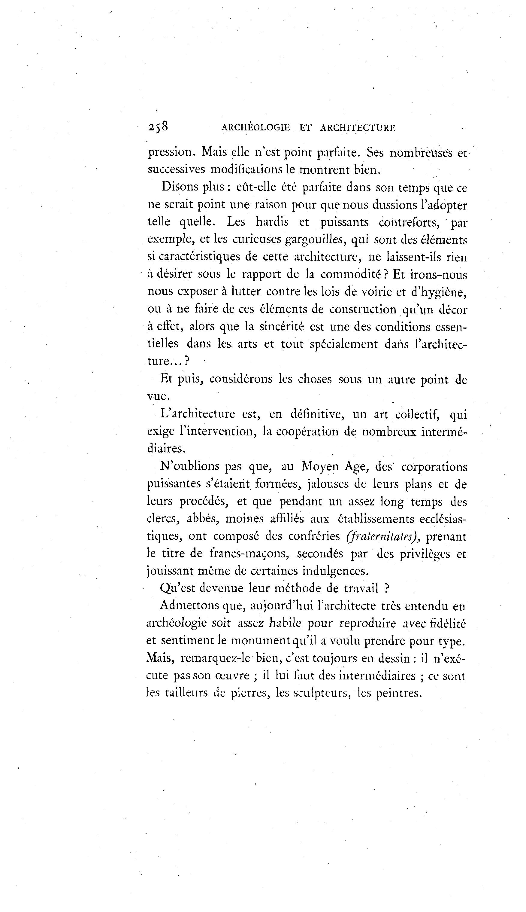 258 ARCHÉOLOGIE ET ARCHITECTURE pression. Mais elle n'est point parfaite. Ses nombreuses et successives modifications le montrent bien. Disons plus : eût-elle été parfaite dans son temps que ce ne serait point une raison pour que nous dussions l'adopter telle quelle. Les hardis et puissants contreforts, par exemple, et les curieuses gargouilles, qui sont des éléments si caractéristiques de cette architecture, ne laissent-ils rien à désirer sous le rapport de la commodité ? Et irons-nous nous exposer à lutter contre les lois de voirie et d'hygiène, ou à ne faire de ces éléments de construction qu'un décor à effet, alors que la sincérité est une des conditions essen- tielles dans les arts et tout spécialement dans l'architec- ture...? Et puis, considérons les choses sous un autre point de vue. L'architecture est, en définitive, un art collectif, qui exige l'intervention, la coopération de nombreux intermé- diaires. N'oublions pas que, au Moyen Age, des corporations puissantes s'étaient formées, jalouses de leurs plans et de leurs procédés, et que pendant un assez long temps des clercs, abbés, moines affiliés aux établissements ecclésias- tiques, ont composé des confréries (fraternitates), prenant le titre de francs-maçons, secondés par des privilèges et jouissant même de certaines indulgences. Qu'est devenue leur méthode de travail ? Admettons que, aujourd'hui l'architecte très entendu en archéologie soit assez habile pour reproduire avec fidélité et sentiment le monument qu'il a voulu prendre pour type. Mais, remarquez-le bien, c'est toujours en dessin : il n'exé- cute pas son œuvre ; il lui faut des intermédiaires ; ce sont les tailleurs de pierres, les sculpteurs, les peintres.