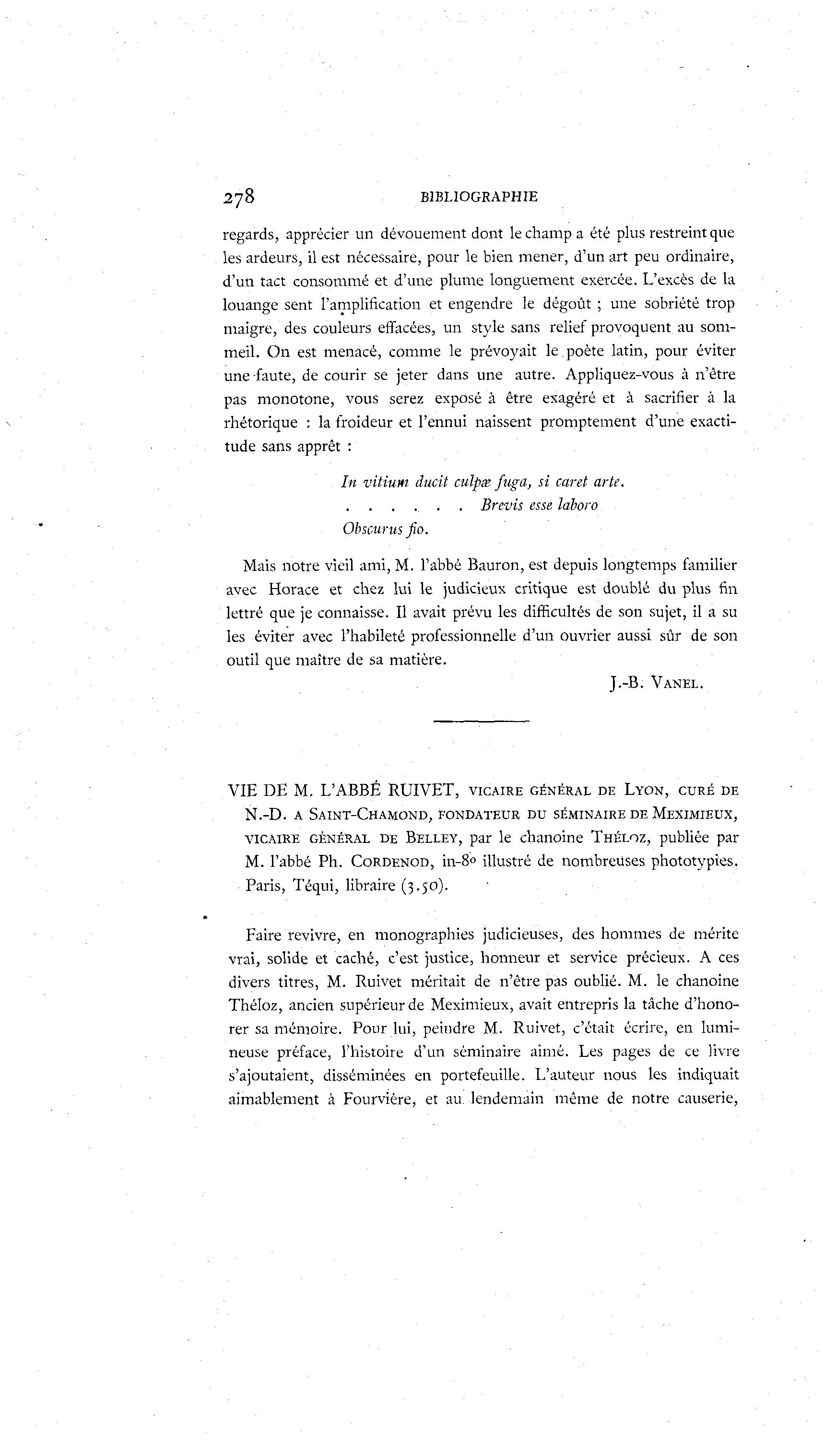278 BIBLIOGRAPHIE regards, apprécier un dévouement dont le champ a été plus restreint que les ardeurs, il est nécessaire, pour le bien mener, d'un art peu ordinaire, d'un tact consommé et d'une plume longuement exercée. L'excès de la louange sent l'amplification et engendre le dégoût ; une sobriété trop maigre, des couleurs effacées, un style sans relief provoquent au som- meil. O n est menacé, comme le prévoyait le.poète latin, pour éviter une faute, de courir se jeter dans une autre. Appliquez-vous à n'être pas monotone, vous serez exposé à être exagéré et à sacrifier à la rhétorique : la froideur et l'ennui naissent promptement d'une exacti- tude sans apprêt : In vitium ducit culpx fuga, si caret arte. . . . Brevis esse là boro Obscur us fio. Mais notre vieil ami, M. l'abbé Bauron, est depuis longtemps familier avec Horace et chez lui le judicieux critique est doublé du plus fin lettré que je connaisse. Il avait prévu les difficultés de son sujet, il a su les éviter avec l'habileté professionnelle d'un ouvrier aussi sûr de son outil que maître de sa matière. J.-B. VANEL. VIE DE M. L'ABBÉ RUIVET, VICAIRE GÉNÉRAL DE LYON, CURÉ DE N.-D. A SAINT-CHAMOND, FONDATEUR DU SÉMINAIRE DE MEXIMIEUX, VICAIRE GÉNÉRAL DE BELLEY, par le chanoine THÉLOZ, publiée par M. l'abbé Ph. CORDENOD, in-8° illustré de nombreuses phototypies. Paris, Téqui, libraire (3.50). Faire revivre, en monographies judicieuses, des hommes de mérite vrai, solide et caché, c'est justice, honneur et service précieux. A ces divers titres, M. Ruivet méritait de n'être pas oublié. M. le chanoine Théloz, ancien supérieur de Meximieux, avait entrepris la tâche d'hono- rer sa mémoire. Pour lui, peindre M. Ruivet, c'était écrire, en lumi- neuse préface, l'histoire d'un séminaire aimé. Les pages de ce livre s'ajoutaient, disséminées en portefeuille. L'auteur nous les indiquait aimablement à Fourvière, et au. lendemain même de notre causerie,