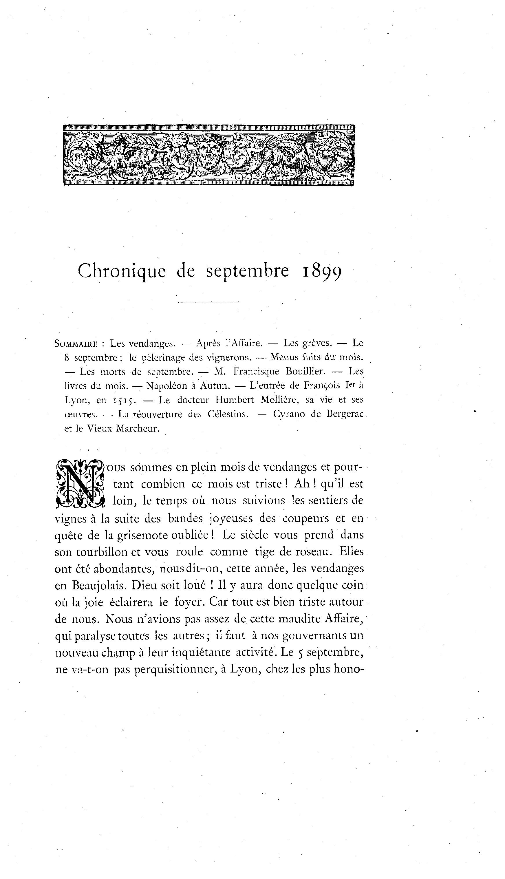 Chronique de septembre 1899 SOMMAIRE : Les vendanges. — Après l'Affaire. — Les grèves. — Le 8 septembre ; le pèlerinage des vignerons. — Menus faits du' mois. — Les morts de septembre. — M. Francisque Bouillier. — Les livres du mois. — Napoléon à Autun. — L'entrée de François I e r à Lyon, en 1515. — Le docteur Humbert Mollière, sa vie et ses œuvres. — La réouverture des Célestins. — Cyrano de Bergerac. et le Vieux Marcheur. ous sommes en plein mois de vendanges et pour- tant combien ce mois est triste ! Ah ! qu'il est loin, le temps où nous suivions les sentiers de vignes à la suite des bandes joyeuses des coupeurs et en quête de la grisemote oubliée ! Le siècle vous prend dans son tourbillon et vous roule comme tige de roseau. Elles ont été abondantes, nous dit-on, cette année, les vendanges en Beaujolais. Dieu soit loué ! Il y aura donc quelque coin où la joie éclairera le foyer. Car tout est bien triste autour de nous. Nous n'avions pas assez de cette maudite Affaire, qui paralyse toutes les autres ; il faut à nos gouvernants un nouveau champ à leur inquiétante activité. Le 5 septembre, ne va-t-on pas perquisitionner, à Lyon, chez les plus hono-