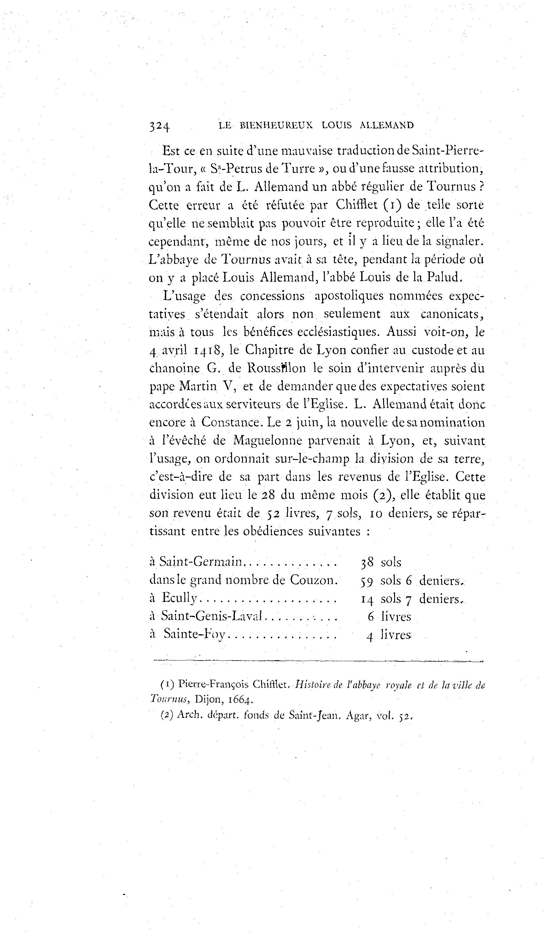 324 LE BIENHEUREUX LOUIS ALLEMAND Est ce en suite d'une mauvaise traduction de Saint-Pierre- la-Tour, « Ss-Petrus deTurre », ou d'une fausse attribution, qu'on a fait de L. Allemand un abbé régulier de Tournus ? Cette erreur a été réfutée par Chifnet (1) de telle sorte qu'elle ne semblait pas pouvoir être reproduite; elle l'a été cependant, même de nos jours, et il y a lieu de la signaler. L'abbaye de Tournus avait à sa tête, pendant la période où on y a placé Louis Allemand, l'abbé Louis de la Palud. L'usage des concessions apostoliques nommées expec- tatives s'étendait alors non seulement aux canonicats, mais à tous les bénéfices ecclésiastiques. Aussi voit-on, le 4 avril 1418, le Chapitre de Lyon confier au custode et au chanoine G. de Roussfilon le soin d'intervenir auprès du pape Martin V, et de demander que des expectatives soient accordées aux serviteurs de l'Eglise. L. Allemand était donc encore à Constance. Le 2 juin, la nouvelle de sa nomination à l'évêché de Maguelonne parvenait à Lyon, et, suivant l'usage, on ordonnait sur-le-champ la division de sa terre, c'est-à -dire de sa part dans les revenus de l'Eglise. Cette division eut lieu le 28 du même mois (2), elle établit que son revenu était de 52 livres, 7 sols, 10 deniers, se répar- tissant entre les obédiences suivantes : à Saint-Germain . 38 sols dans le grand nombre de Couzon. 59 sols 6 deniers. à Ecully 14 sols 7 deniers. à Saint-Genis-Laval •. . . . 6 livres à Sainte-Foy . 4 livres (1) Pierre-François Chifflet. Histoire de l'abbaye royale et de la ville de Tournus, Dijon, 1664. (2) Arch. départ, fonds de Saint-Jean. Agar, vol. 52.