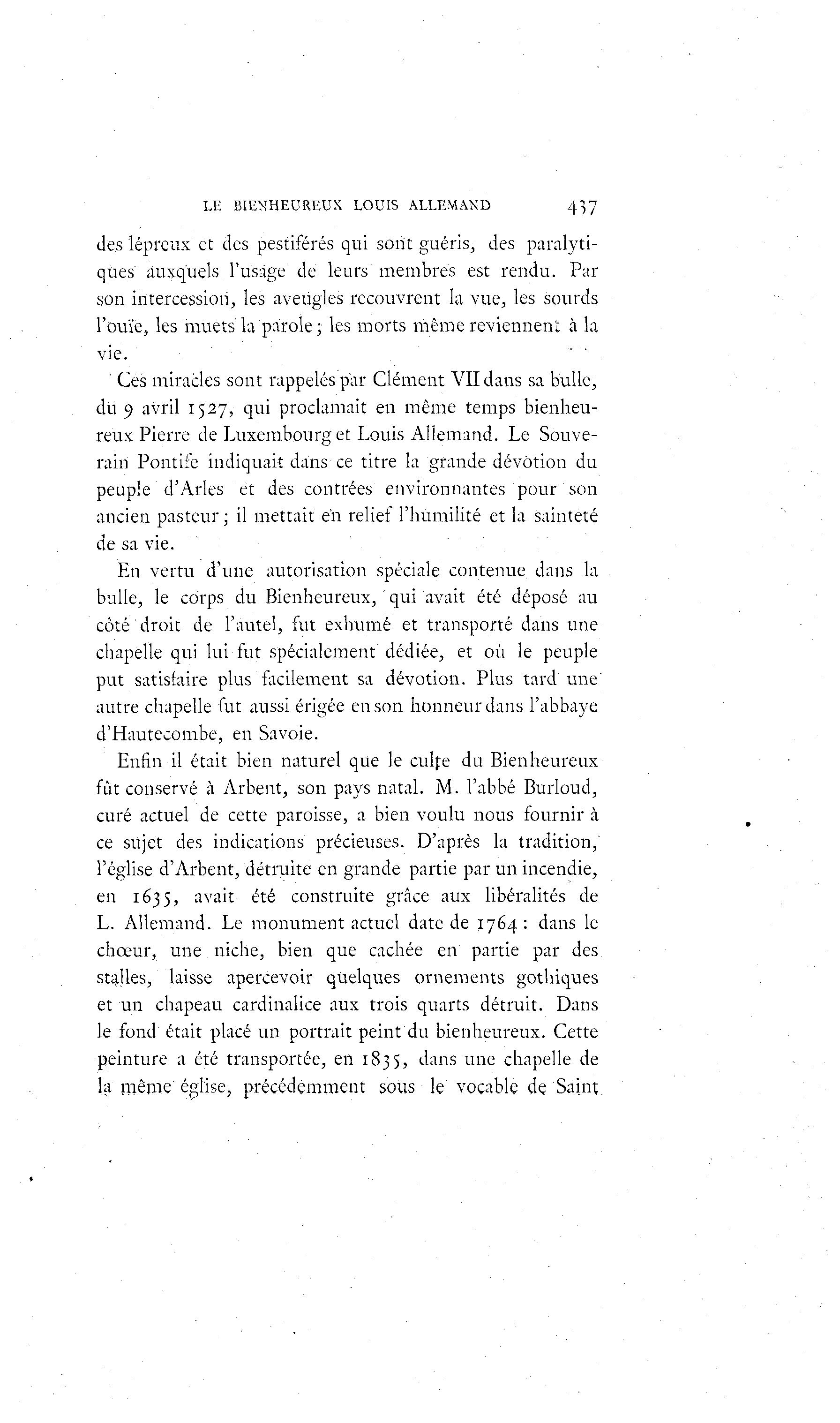 LE BIENHEUREUX LOUIS ALLEMAND 437 des lépreux et des pestiférés qui sont guéris, des paralyti- ques auxquels l'usage de leurs membres est rendu. Par son intercession, les aveugles recouvrent la vue, les sourds l'ouïe, les muets la parole ; les morts même reviennent à la vie. ' Ces miracles sont rappelés par Clément VII dans sa bulle, du 9 avril 1527, qui proclamait en même temps bienheu- reux Pierre de Luxembourg et Louis Allemand. Le Souve- rain Pontife indiquait dans ce titre la grande dévotion du peuple d'Arles et des contrées environnantes pour son ancien pasteur; il mettait en relief l'humilité et la sainteté de sa vie. En vertu d'une autorisation spéciale contenue dans la bulle, le corps du Bienheureux, qui avait été déposé au côté droit de l'autel, fut exhumé et transporté dans une chapelle qui lui fut spécialement dédiée, et où le peuple put satisfaire plus facilement sa dévotion. Plus tard une autre chapelle fut aussi érigée en son honneur dans l'abbaye d'Hautecombe, en Savoie. Enfin il était bien naturel que le culte du Bienheureux fût conservé à Arbent, son pays natal. M. l'abbé Burloud, curé actuel de cette paroisse, a bien voulu nous fournir à ce sujet des indications précieuses. D'après la tradition, l'église d'Arbent, détruite en grande partie par un incendie, en 1635, avait été construite grâce aux libéralités de L. Allemand. Le monument actuel date de 1764 : dans le choeur, une niche, bien que cachée en partie par des stalles, laisse apercevoir quelques ornements gothiques et un chapeau cardinalice aux trois quarts détruit. Dans le fond était placé un portrait peint du bienheureux. Cette peinture a été transportée, en 1835, dans une chapelle de la même' église, précédemment sous le vocable de Saint