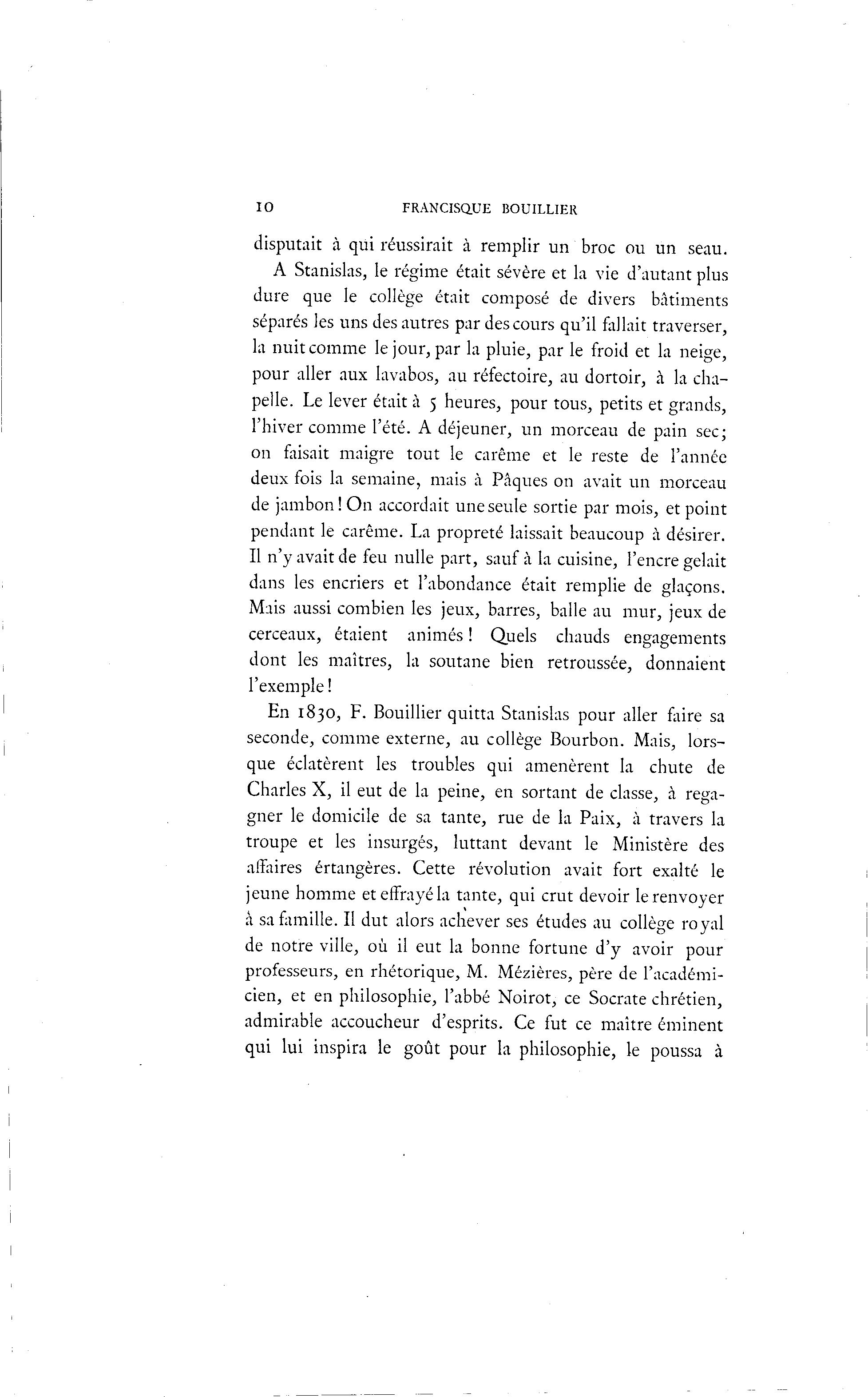 10 FRANCISQUE BOUILLIER disputait à qui réussirait à remplir un broc ou un seau. A Stanislas, le régime était sévère et la vie d'autant plus dure que le collège était composé de divers bâtiments séparés les uns des autres par des cours qu'il fallait traverser, la nuit comme le jour, par la pluie, par le froid et la neige, pour aller aux lavabos, au réfectoire, au dortoir, à la cha- pelle. Le lever était à 5 heures, pour tous, petits et grands, l'hiver comme l'été. A déjeuner, un morceau de pain sec; on faisait maigre tout le carême et le reste de l'année deux fois la semaine, mais à Pâques on avait un morceau de jambon! On accordait une seule sortie par mois, et point pendant le carême. La propreté laissait beaucoup à désirer. Il n'y avait de feu nulle part, sauf à la cuisine, l'encre gelait dans les encriers et l'abondance était remplie de glaçons. Mais aussi combien les jeux, barres, balle au mur, jeux de cerceaux, étaient animés ! Quels chauds engagements dont les maîtres, la soutane bien retroussée, donnaient l'exemple ! En 1830, F. Bouillier quitta Stanislas pour aller faire sa seconde, comme externe, au collège Bourbon. Mais, lors- que éclatèrent les troubles qui amenèrent la chute de Charles X, il eut de la peine, en sortant de classe, à rega- gner le domicile de sa tante, rue de la Paix, à travers la troupe et les insurgés, luttant devant le Ministère des affaires értangères. Cette révolution avait fort exalté le jeune homme et effrayé la tante, qui crut devoir le renvoyer à sa famille. Il dut alors achever ses études au collège royal de notre ville, où il eut la bonne fortune d'y avoir pour professeurs, en rhétorique, M. Mézières, père de l'académi- cien, et en philosophie, l'abbé Noirot, ce Socrate chrétien, admirable accoucheur d'esprits. Ce fut ce maître éminent qui lui inspira le goût pour la philosophie, le poussa Ã