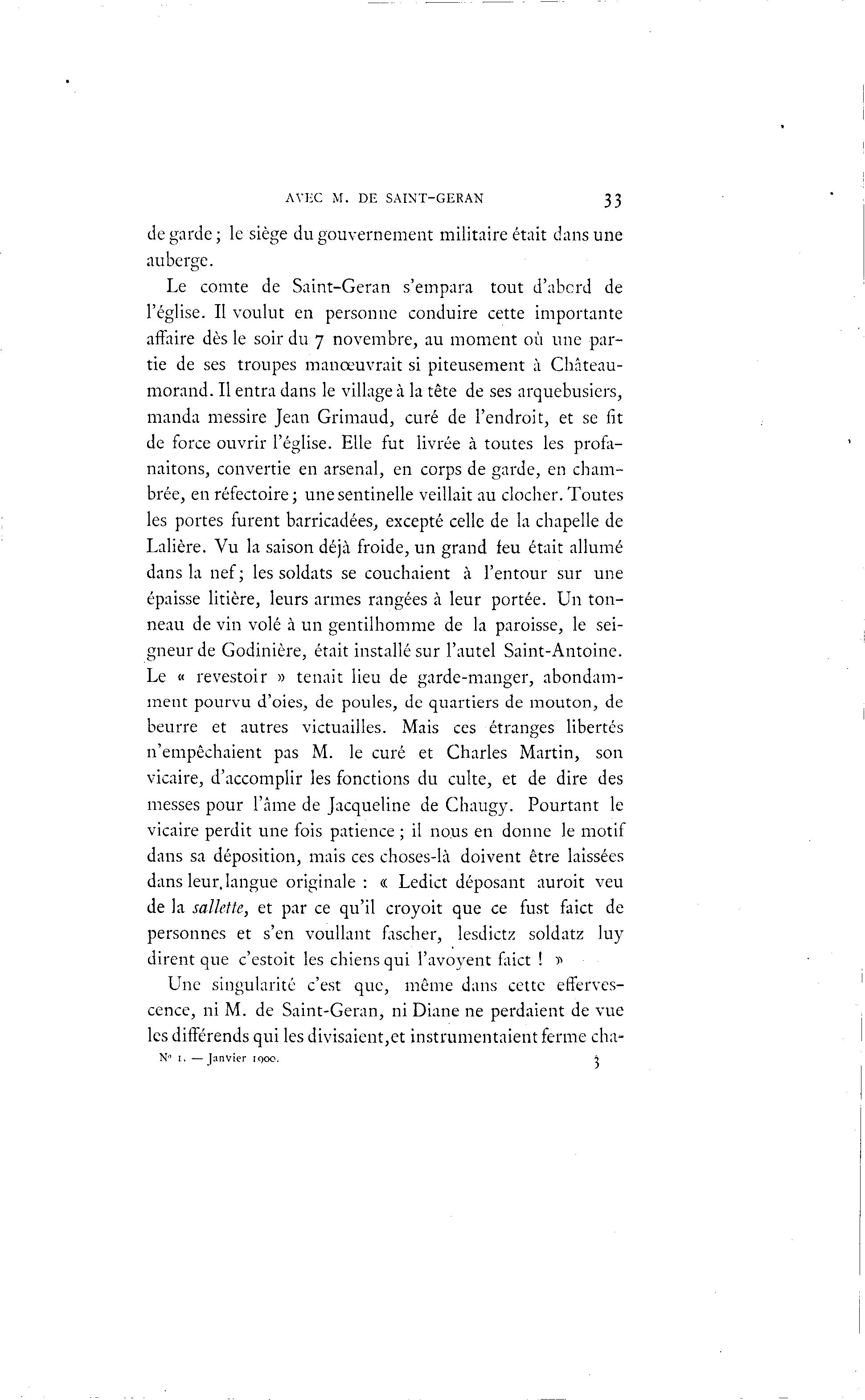 AVEC M. DE SAINT-GERAN 33 de garde; le siège du gouvernement militaire était dans une auberge. Le comte de Saint-Geran s'empara tout d'abcrd de l'église. Il voulut en personne conduire cette importante affaire dès le soir du 7 novembre, au moment où une par- tie de ses troupes manœuvrait si piteusement à Château- morand. Il entra dans le village à la tête de ses arquebusiers, manda messire Jean Grimaud, curé de l'endroit, et se fit de force ouvrir l'église. Elle fut livrée à toutes les profa- naitons, convertie en arsenal, en corps de garde, en cham- brée, en réfectoire; une sentinelle veillait au clocher. Toutes les portes furent barricadées, excepté celle de la chapelle de Lalière. Vu la saison déjà froide, un grand feu était allumé dans la nef; les soldats se couchaient à l'entour sur une épaisse litière, leurs armes rangées à leur portée. Un ton- neau de vin volé à un gentilhomme de la paroisse, le sei- gneur de Godinière, était installé sur l'autel Saint-Antoine. Le « revestoir » tenait lieu de garde-manger, abondam- ment pourvu d'oies, de poules, de quartiers de mouton, de beurre et autres victuailles. Mais ces étranges libertés n'empêchaient pas M. le curé et Charles Martin, son vicaire, d'accomplir les fonctions du culte, et de dire des messes pour l'âme de Jacqueline de Chaugy. Pourtant le vicaire perdit une fois patience ; il nous en donne le motif dans sa déposition, mais ces choses-là doivent être laissées dans leur, langue originale : « Ledict déposant auroit veu de la salktte, et par ce qu'il croyoit que ce fust faict de personnes et s'en voullant fascher, lesdictz soldatz luy dirent que c'estoit les chiens qui l'avoyent faict ! r> Une singularité c'est que, même dans cette efferves- cence, ni M. de Saint-Geran, ni Diane ne perdaient de vue les différends qui les divisaient,et instrumentaient ferme cha- N° I. — J a n v i e r 1900. ?