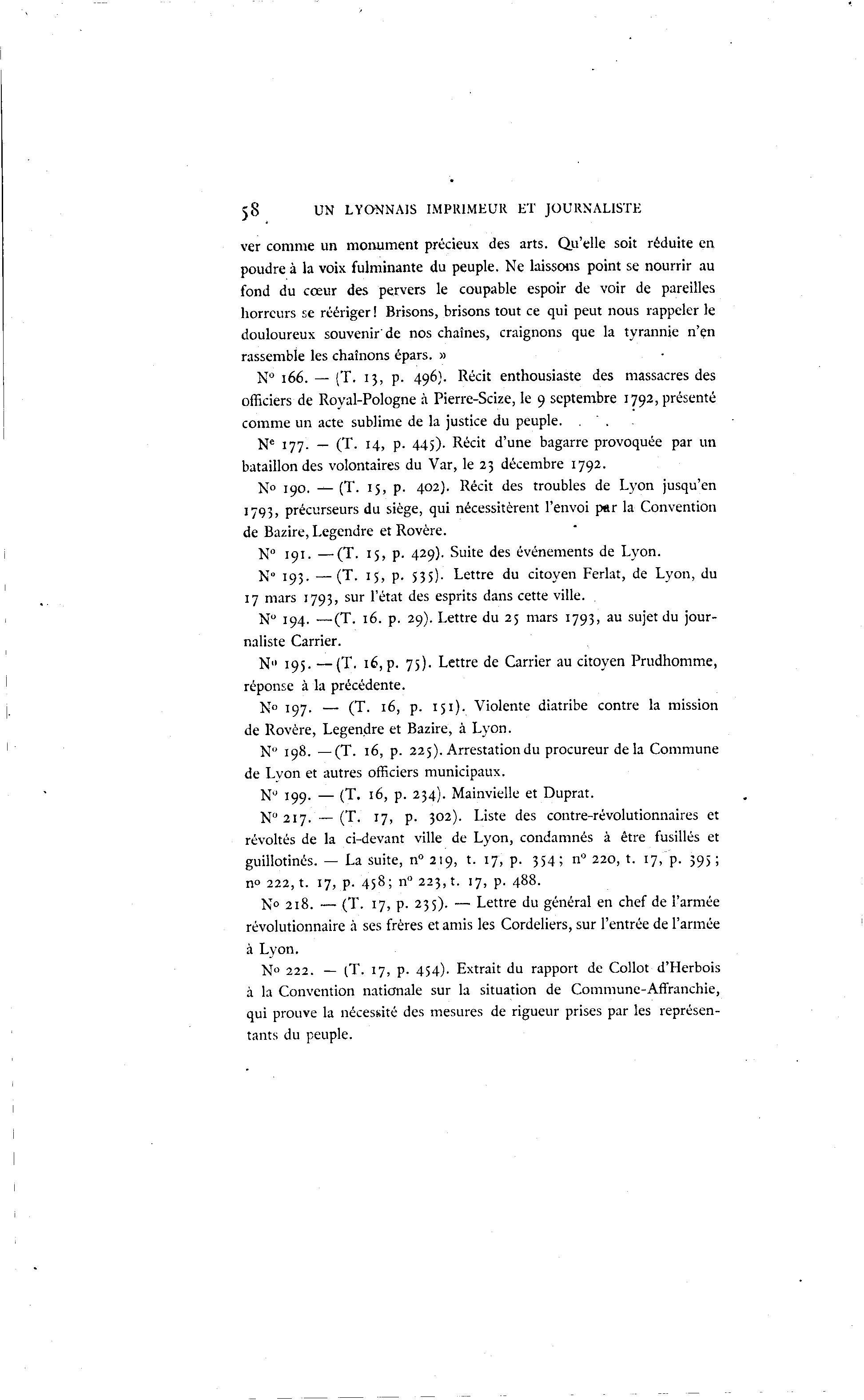 58 UN LYONNAIS IMPRIMEUR ET JOURNALISTE ver comme un monument précieux des arts. Qu'elle soit réduite en poudre à la voix fulminante du peuple. Ne laissons point se nourrir au fond du cœur des pervers le coupable espoir de voir de pareilles horreurs se rtériger ! Brisons, brisons tout ce qui peut nous rappeler le douloureux souvenir'de nos chaînes, craignons que la tyrannie n'en rassemble les chaînons épars. » N° 166. — (T. 13, p. 496). Récit enthousiaste des massacres des officiers de Royal-Pologne à Pierre-Scize, le 9 septembre 1792, présenté comme un acte sublime de la justice du peuple. . N e 177. — (T. 14, p. 445). Récit d'une bagarre provoquée par un bataillon des volontaires du Var, le 23 décembre 1792. N° 190. — (T. 15, p. 402). Récit des troubles de Lyon jusqu'en 1793, précurseurs du siège, qui nécessitèrent l'envoi par la Convention de Bazire, Legendre et Rovère. N° 191. — ( T . 15, p. 429). Suite des événements de Lyon. N° 193. •—(T. 15, p. 535). Lettre du citoyen Ferlât, de Lyon, du 17 mars 1793, sur l'état des esprits dans cette ville. N° 194. — ( T . 16. p. 29). Lettre du 25 mars 1793, au sujet du jour- naliste Carrier. N" 195. — ( T . 16, p. 75). Lettre de Carrier au citoyen Prudhomme, réponse à la précédente. N° 197. — (T. 16, p. 151). Violente diatribe contre la mission de Rovère, Legendre et Bazire, à Lyon. N" 198. — ( T . 16, p. 225). Arrestation du procureur delà Commune de Lyon et autres officiers municipaux. N" 199. — (T. 16, p. 234). Mainvielle et Duprat. N ° 2 I 7 . — (T. 17, p. 302). Liste des contre-révolutionnaires et révoltés de la ci-devant ville de Lyon, condamnés à être fusillés et guillotinés. — La suite, n° 219, t. 17, p. 354; n° 220, t. 17, p. 595; n» 222, t. 17, p. 458; n° 223, t. 17, p. 488. N° 218. — ( T . 17, p. 235). — Lettre du général en chef de l'armée révolutionnaire à ses frères et amis les Cordeliers, sur l'entrée de l'armée à Lyon. N° 222. — (T. 17, p. 454). Extrait du rapport de Collot d'Herbois à la Convention nationale sur la situation de Commune-Affranchie, qui prouve la nécessité des mesures de rigueur prises par les représen- tants du peuple.
