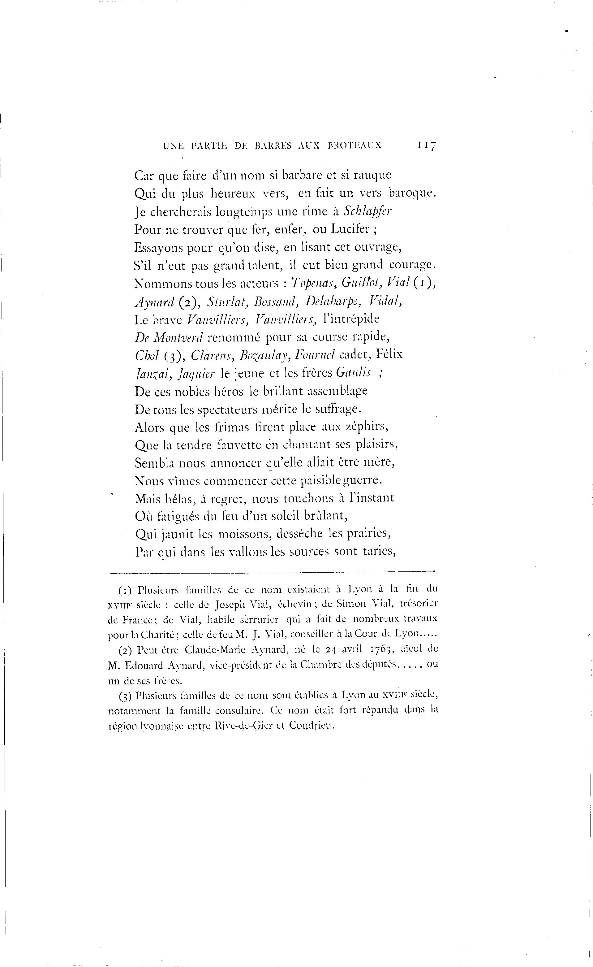 UNE PART1K DH BAKRKS AUX BKOTKAUX I 17 Car que faire d'un nom si barbare et si rauquc Qui du plus heureux vers, en fait un vers baroque. Je chercherais longtemps une rime à Schlapfer Pour ne trouver que fer, enfer, ou Lucifer ; Essayons pour qu'on dise, en lisant cet ouvrage, S'il n'eut pas grand talent, il eut bien grand courage. Nommons tous les acteurs : Topenas, Guiltot, Vial (i), Aynard (2), Slurlaï, Bossand, Deïaharpe, Vidal, Le brave VauviUiers, Vauvilliers, l'intrépide De Moniverd renommé pour sa course rapide, Chol (3), Clarens, Bo^aulay, Fourmi cadet, Félix ]an~ai, Jaquier le jeune et les frères Gaulis ; De ces nobles héros le brillant assemblage De tous les spectateurs mérite le suffrage. Alors que les frimas firent place aux zéphirs, Que la tendre fauvette en chantant ses plaisirs, Sembla nous annoncer qu'elle allait être mère, Nous vîmes commencer cette paisible guerre. Mais hélas, à regret, nous touchons à l'instant Où fatigués du feu d'un soleil brûlant, Qui jaunit les moissons, dessèche les prairies, Par qui dans les vallons les sources sont taries, (1) Plusieurs familles de ce nom existaient à Lyon à la fin du XVIIIC siècle : celle de Joseph Vial, échevin ; de Simon Vial, trésorier de France; de Vial, habile serrurier qui a fait de nombreux travaux pour la Charité; celle de feu M. J. Vial, conseiller à la Cour de Lyon (2) Peut-être Claude-Marie Aynard, né le 24 avril 1763, aïeul de M. Edouard Avnard, vice-président de la Chambre des députés ou un de ses frères. (3) Plusieurs familles de ce nom sont établies à Lvon au xvm c siècle, notamment la famille consulaire. Ce nom était fort répandu dans la région lyonnaise entre Rivc-dc-Gier et Condrieu.