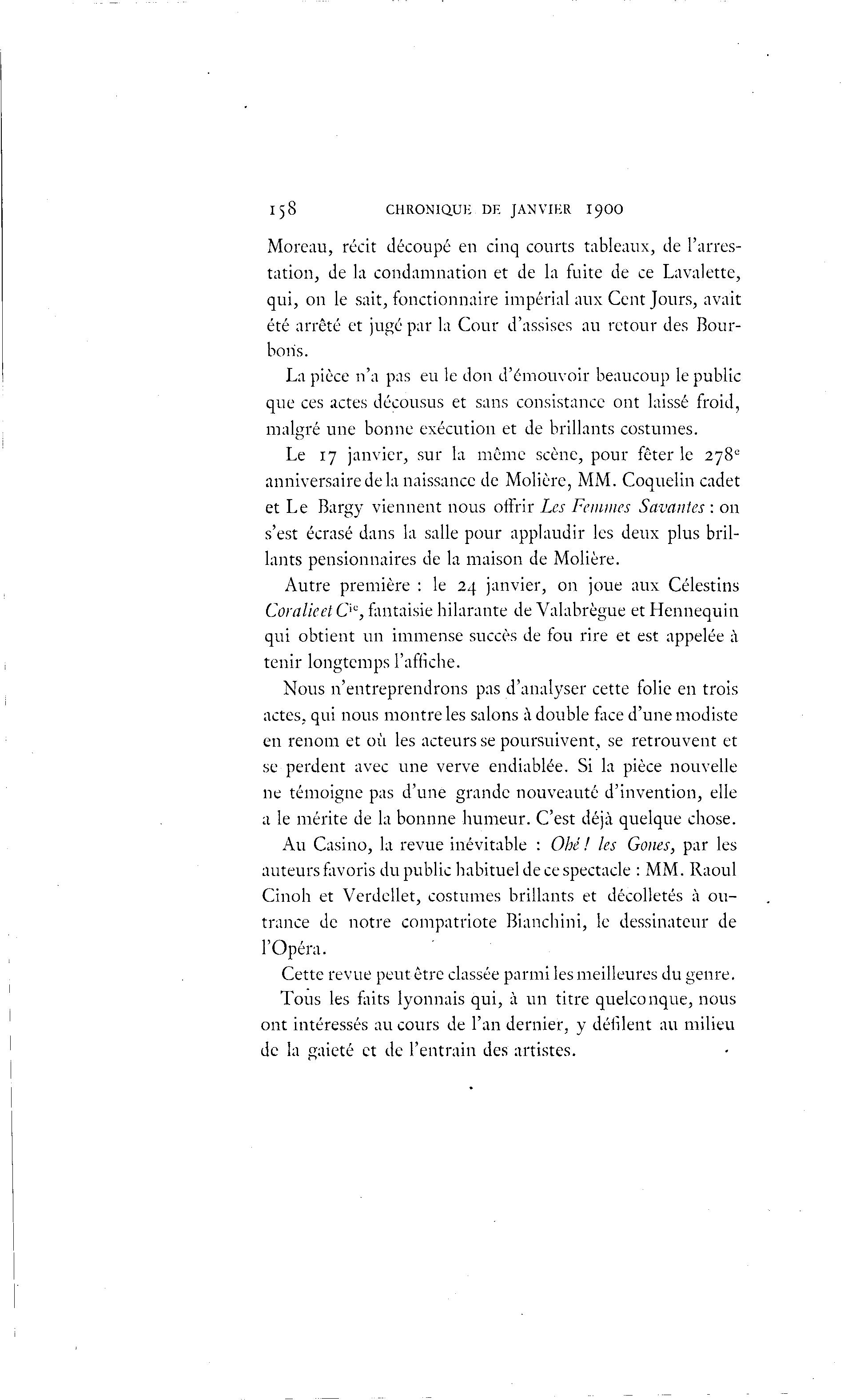 158 CHRONIQUE DE JANVIER I9OO Moreau, récit découpé en cinq courts tableaux, de l'arres- tation, de la condamnation et de la fuite de ce Lavalette, qui, on le sait, fonctionnaire impérial aux Cent Jours, avait été arrêté et jugé par la Cour d'assises au retour des Bour- bons. La pièce n'a pas eu le don d'émouvoir beaucoup le public que ces actes décousus et sans consistance ont laissé froid, malgré une bonne exécution et de brillants costumes. Le 17 janvier, sur la même scène, pour fêter le 278 e anniversaire de la naissance de Molière, MM. Coquelin cadet et Le Bargy viennent nous offrir Les Femmes Savantes : on s'est écrasé dans la salle pour applaudir les deux plus bril- lants pensionnaires de la maison de Molière. Autre première : le 24 janvier, on joue aux Célestins Coralieet C'% fantaisie hilarante de Valabrègue et Hennequin qui obtient un immense succès de fou rire et est appelée à tenir longtemps l'affiche. Nous n'entreprendrons pas d'analyser cette folie en trois actes, qui nous montre les salons à double face d'une modiste en renom et où les acteurs se poursuivent, se retrouvent et se perdent avec une verve endiablée. Si la pièce nouvelle ne témoigne pas d'une grande nouveauté d'invention, elle a le mérite de la bonnne humeur. C'est déjà quelque chose. Au Casino, la revue inévitable : Ohé ! les Gones, par les auteurs favoris du public habituel de ce spectacle : MM. Raoul Cinoh et Verdellet, costumes brillants et décolletés à ou- trance de notre compatriote Bianchini, le dessinateur de l'Opéra. Cette revue peut être classée parmi les meilleures du genre. Tous les faits lyonnais qui, à un titre quelconque, nous ont intéressés au cours de l'an dernier, y défilent au milieu de la gaieté et de l'entrain des artistes.
