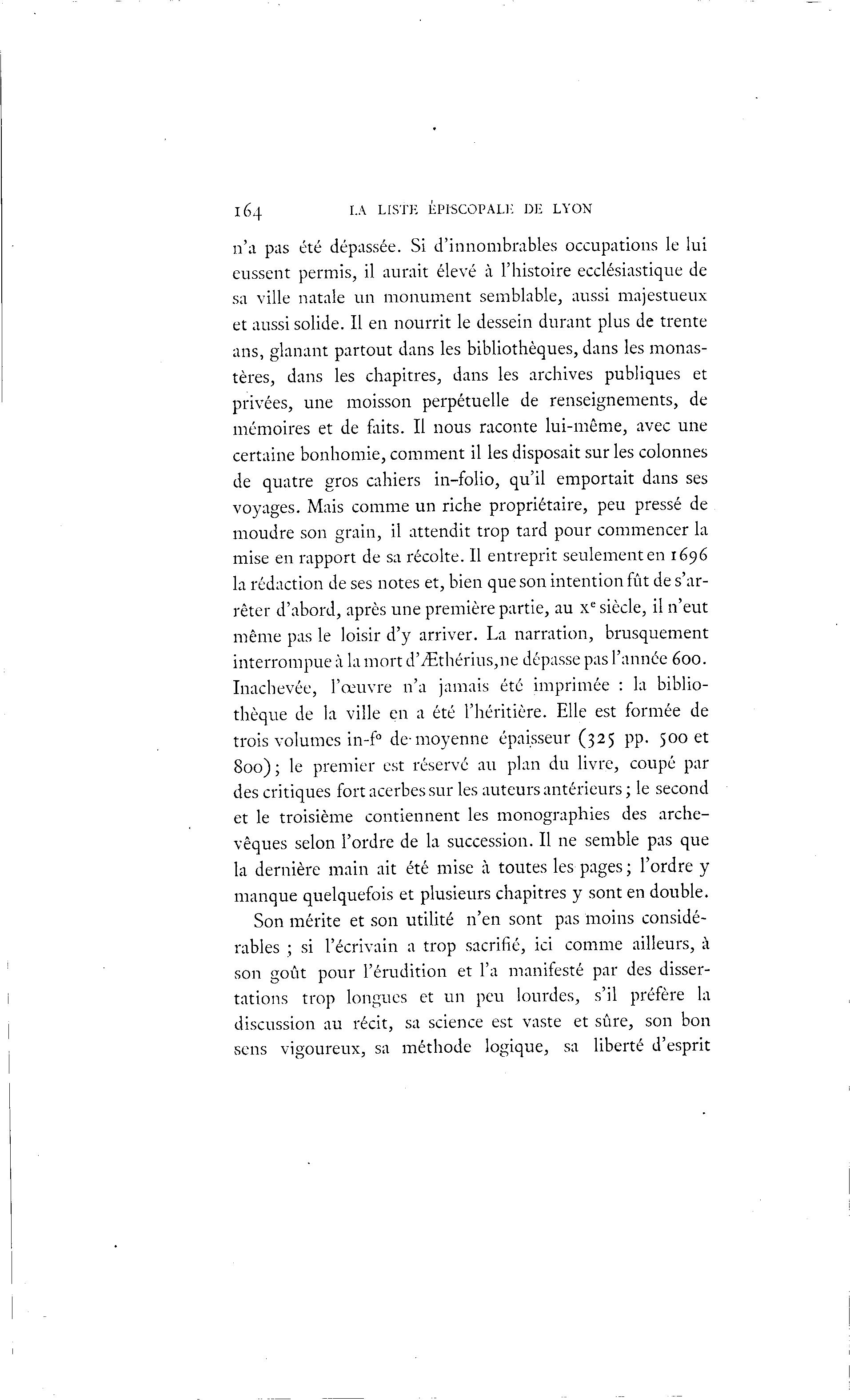 164 LA LISTE EPISCOPALE DE LYON n'a pas été dépassée. Si d'innombrables occupations le lui eussent permis, il aurait élevé à l'histoire ecclésiastique de sa ville natale un monument semblable, aussi majestueux et aussi solide. Il en nourrit le dessein durant plus de trente ans, glanant partout dans les bibliothèques, dans les monas- tères, dans les chapitres, dans les archives publiques et privées, une moisson perpétuelle de renseignements, de mémoires et de faits. Il nous raconte lui-même, avec une certaine bonhomie, comment il les disposait sur les colonnes de quatre gros cahiers in-folio, qu'il emportait dans ses voyages. Mais comme un riche propriétaire, peu pressé de moudre son grain, il attendit trop tard pour commencer la mise en rapport de sa récolte. Il entreprit seulement en 1696 la rédaction de ses notes et, bien que son intention fût de s'ar- rêter d'abord, après une première partie, au xe siècle, il n'eut même pas le loisir d'y arriver. La narration, brusquement interrompue à la mort d'iEthérius,ne dépasse pas l'année 600. Inachevée, l'œuvre n'a jamais été imprimée : la biblio- thèque de la ville en a été l'héritière. Elle est formée de trois volumes in-f° de-moyenne épaisseur (325 pp. 500 et 800) ; le premier est réservé au plan du livre, coupé par des critiques fort acerbes sur les auteurs antérieurs; le second et le troisième contiennent les monographies des arche- vêques selon l'ordre de la succession. Il ne semble pas que la dernière main ait été mise à toutes les pages ; l'ordre y manque quelquefois et plusieurs chapitres y sont en double. Son mérite et son utilité n'en sont pas moins considé- rables ; si l'écrivain a trop sacrifié, ici comme ailleurs, à son goût pour l'érudition et l'a manifesté par des disser- tations trop longues et un peu lourdes, s'il préfère la discussion au récit, sa science est vaste et sûre, son bon sens vigoureux, sa méthode logique, sa liberté d'esprit