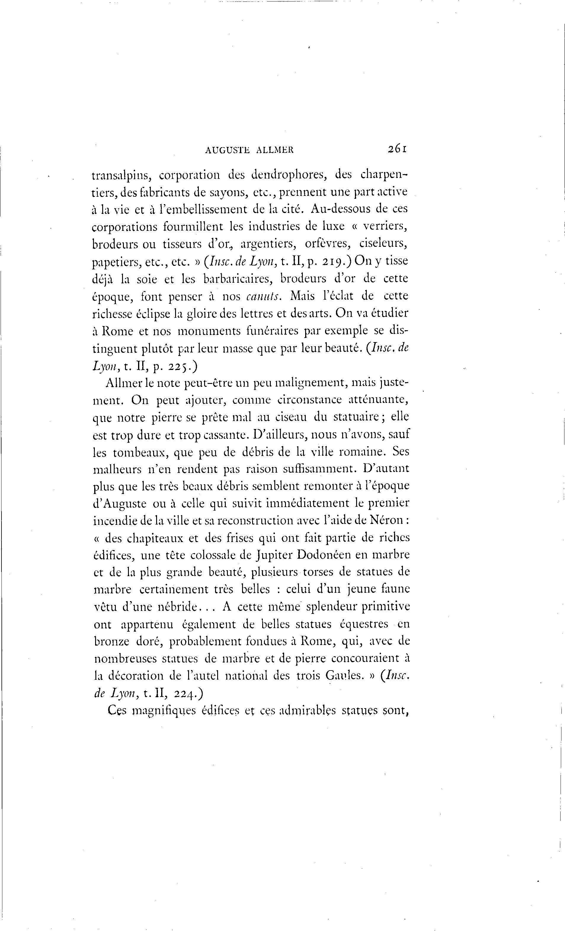 AUGUSTE ALLMER 2ÔI transalpins, corporation des dendrophores, des charpen- tiers, des fabricants de sayons, etc., prennent une part active à la vie et à l'embellissement de la cité. Au-dessous de ces corporations fourmillent les industries de luxe « verriers, brodeurs ou tisseurs d'or, argentiers, orfèvres, ciseleurs, papetiers, etc., etc. » (Insc. de Lyon, t. II, p. 219.) On y tisse déjà la soie et les barbaricaires, brodeurs d'or de cette époque, font penser à nos canuts. Mais l'éclat de cette richesse éclipse la gloire des lettres et des arts. On va étudier à Rome et nos monuments funéraires par exemple se dis- tinguent plutôt parleur masse que par leur beauté. (Insc. de Lyon, t. II, p. 225.) Allmer le note peut-être un peu malignement, mais juste- ment. On peut ajouter, comme circonstance atténuante, que notre pierre se prête mal au ciseau du statuaire ; elle est trop dure et trop cassante. D'ailleurs, nous n'avons, sauf les tombeaux, que peu de débris de la ville romaine. Ses malheurs n'en rendent pas raison suffisamment. D'autant plus que les très beaux débris semblent remonter à l'époque d'Auguste ou à celle qui suivit immédiatement le premier incendie de la ville et sa reconstruction avec l'aide de Néron : « des chapiteaux et des frises qui ont fait partie de riches édifices, une tête colossale de Jupiter Dodonéen en marbre et de la plus grande beauté, plusieurs torses de statues de marbre certainement très belles : celui d'un jeune faune vêtu d'une nébride... A cette même splendeur primitive ont appartenu également de belles statues équestres en bronze doré, probablement fondues à Rome, qui, avec de nombreuses statues de marbre et de pierre concouraient à la décoration de l'autel national des trois Gaules. » (Insc. de Lyon, t. II, 224.) Ces magnifiques édifices et ces admirables statues sont,