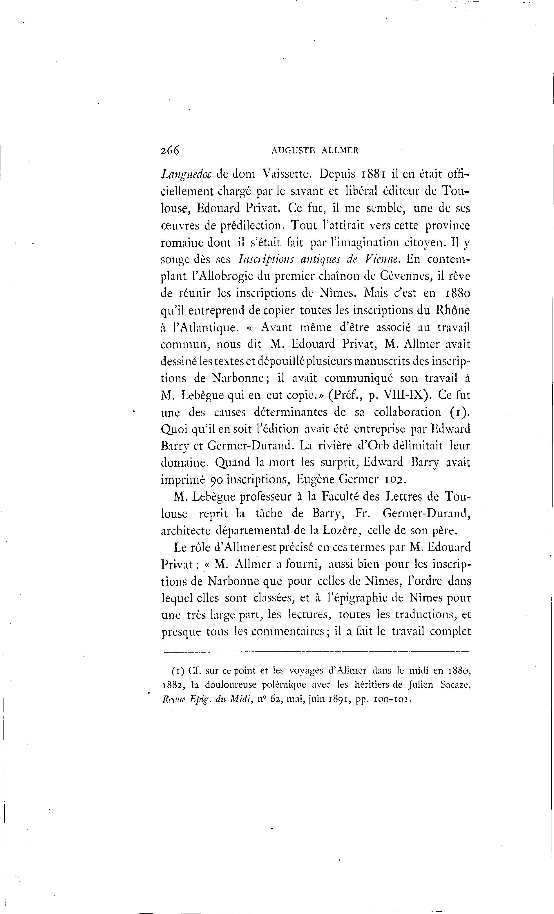 266 AUGUSTE ALLMER Languedoc de dom Vaissette. Depuis 1881 il en était offi- ciellement chargé par le savant et libéral éditeur de Tou- louse, Edouard Privât. Ce fut, il me semble, une de ses œuvres de prédilection. Tout l'attirait vers cette province romaine dont il s'était fait par l'imagination citoyen. Il y songe dès ses Inscriptions antiques de Vienne. En contem- plant l'Allobrogie du premier chaînon de Cévennes, il rêve de réunir les inscriptions de Nîmes. Mais c'est en 1880 qu'il entreprend de copier toutes les inscriptions du Rhône à l'Atlantique. « Avant même d'être associé au travail commun, nous dit M. Edouard Privât, M. Allmer avait dessiné les textes et dépouillé plusieurs manuscrits des inscrip- tions de Narbonne; il avait communiqué son travail à M. Lebègue qui en eut copie.» (Préf., p. VIII-IX). Ce fut une des causes déterminantes de sa collaboration (1). Quoi qu'il en soit l'édition avait été entreprise par Edward Barry et Germer-Durand. La rivière d'Orb délimitait leur domaine. Quand la mort les surprit, Edward Barry avait imprimé 90 inscriptions, Eugène Germer 102. M. Lebègue professeur à la Faculté des Lettres de Tou- louse reprit la tâche de Barry, Fr. Germer-Durand, architecte départemental de la Lozère, celle de son père. Le rôle d'AUmer est précisé en ces termes par M. Edouard Privât : « M. Allmer a fourni, aussi bien pour les inscrip- tions de Narbonne que pour celles de Nîmes, l'ordre dans lequel elles sont classées, et à l'épigraphie de Nîmes pour une très large part, les lectures, toutes les traductions, et presque tous les commentaires ; il a fait le travail complet (1) Cf. sur ce point et les voyages d'AUmer dans le midi en 1880, 1882, la douloureuse polémique avec les héritiers de Julien Sacaze, Revue Epig. du Midi, n° 62, mai, juin 1891, pp. 100-101.