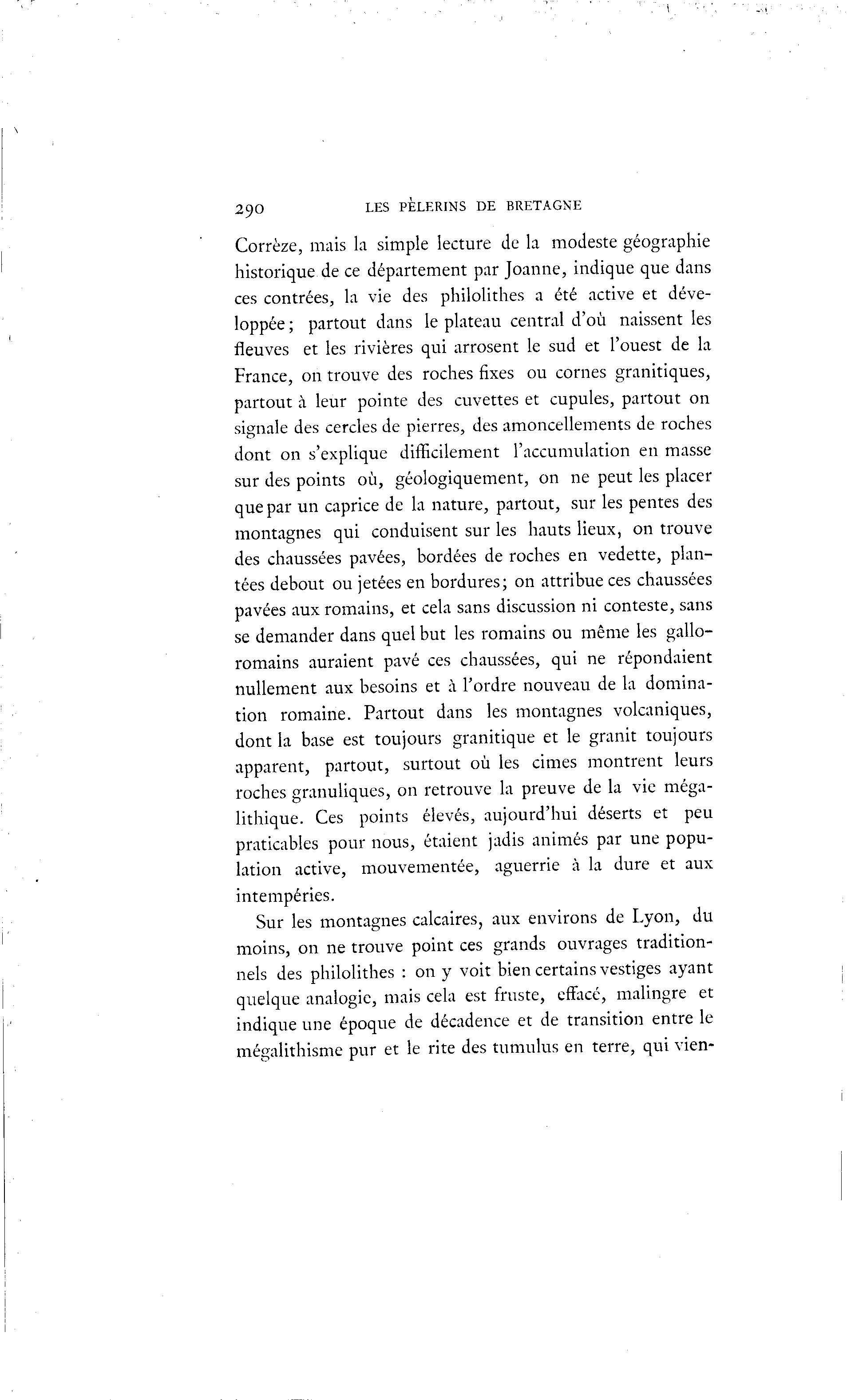 290 LES PÈLERINS DE BRETAGNE Corrèze, mais la simple lecture de la modeste géographie historique de ce département par Joanne, indique que dans ces contrées, la vie des philolithes a été active et déve- loppée ; partout dans le plateau central d'où naissent les fleuves et les rivières qui arrosent le sud et l'ouest de la France, on trouve des roches fixes ou cornes granitiques, partout à leur pointe des cuvettes et cupules, partout on signale des cercles de pierres, des amoncellements de roches dont on s'explique difficilement l'accumulation en masse sur des points où, géologiquement, on ne peut les placer que par un caprice de la nature, partout, sur les pentes des montagnes qui conduisent sur les hauts lieux, on trouve des chaussées pavées, bordées de roches en vedette, plan- tées debout ou jetées en bordures; on attribue ces chaussées pavées aux romains, et cela sans discussion ni conteste, sans se demander dans quel but les romains ou même les gallo- romains auraient pavé ces chaussées, qui ne répondaient nullement aux besoins et à l'ordre nouveau de la domina- tion romaine. Partout dans les montagnes volcaniques, dont la base est toujours granitique et le granit toujours apparent, partout, surtout où les cimes montrent leurs roches granuliques, on retrouve la preuve de la vie méga- lithique. Ces points élevés, aujourd'hui déserts et peu praticables pour nous, étaient jadis animés par une popu- lation active, mouvementée, aguerrie à la dure et aux intempéries. Sur les montagnes calcaires, aux environs de Lyon, du moins, on ne trouve point ces grands ouvrages tradition- nels des philolithes : on y voit bien certains vestiges ayant quelque analogie, mais cela est fruste, effacé, malingre et indique une époque de décadence et de transition entre le mégalithisme pur et le rite des tumulus en terre, qui vien-