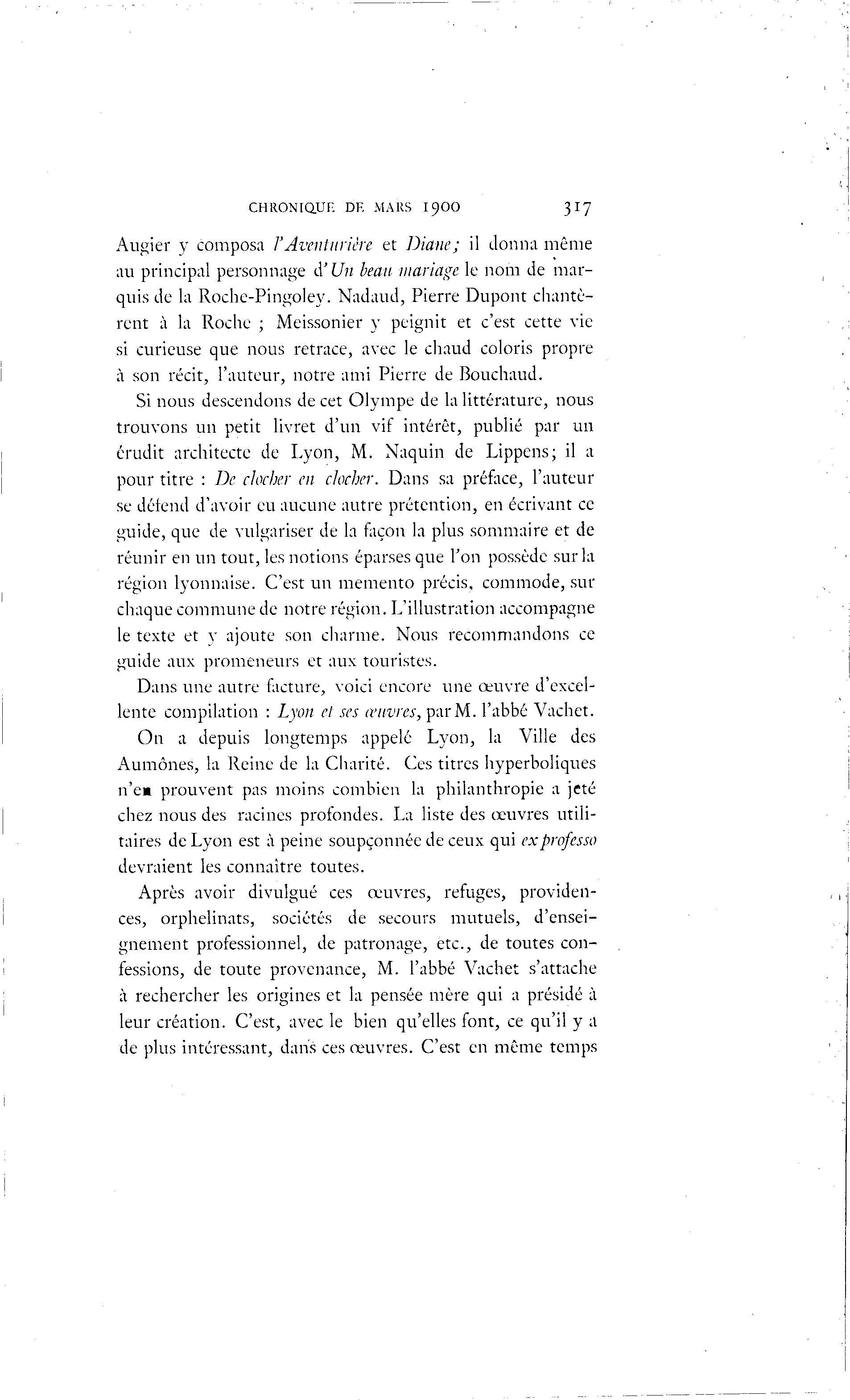 CHRONIQUE DE MARS I9OO 317 Augier y composa VAventurière et Diane; il donna même au principal personnage d'Un beau mariage le nom de mar- quis de la Rocbe-Pingoley. Nadaud, Pierre Dupont chantè- rent à la Roche ; Meissonier y peignit et c'est cette vie si curieuse que nous retrace, avec le chaud coloris propre à son récit, l'auteur, notre ami Pierre de Bouchaud. Si nous descendons de cet Olympe de la littérature, nous trouvons un petit livret d'un vif intérêt, publié par un érudit architecte de Lyon, M. Naquin de Lippens; il a pour titre : De clocher en clocher. Dans sa préface, l'auteur se détend d'avoir eu aucune autre prétention, en écrivant ce guide, que de vulgariser de la façon la plus sommaire et de réunir en un tout, les notions éparses que l'on possède sur la région lyonnaise. C'est un mémento précis, commode, sur chaque commune de notre région. L'illustration accompagne le texte et y ajoute son charme. Nous recommandons ce guide aux promeneurs et aux touristes. Dans une autre facture, voici encore une oeuvre d'excel- lente compilation : Lyon et ses œuvres, par M. l'abbé Vachet. On a depuis longtemps appelé Lyon, la Ville des Aumônes, la Reine de la Charité. Ces titres hyperboliques n'em prouvent pas moins combien la philanthropie a jeté chez nous des racines profondes. La liste des œuvres utili- taires de Lyon est à peine soupçonnée de ceux qui ex professa devraient les connaître toutes. Après avoir divulgué ces œuvres, refuges, providen- ces, orphelinats, sociétés de secours mutuels, d'ensei- gnement professionnel, de patronage, etc., de toutes con- fessions, de toute provenance, M. l'abbé Vachet s'attache à rechercher les origines et la pensée mère qui a présidé à leur création. C'est, avec le bien qu'elles font, ce qu'il y a de plus intéressant, dans ces œuvres. C'est en même temps