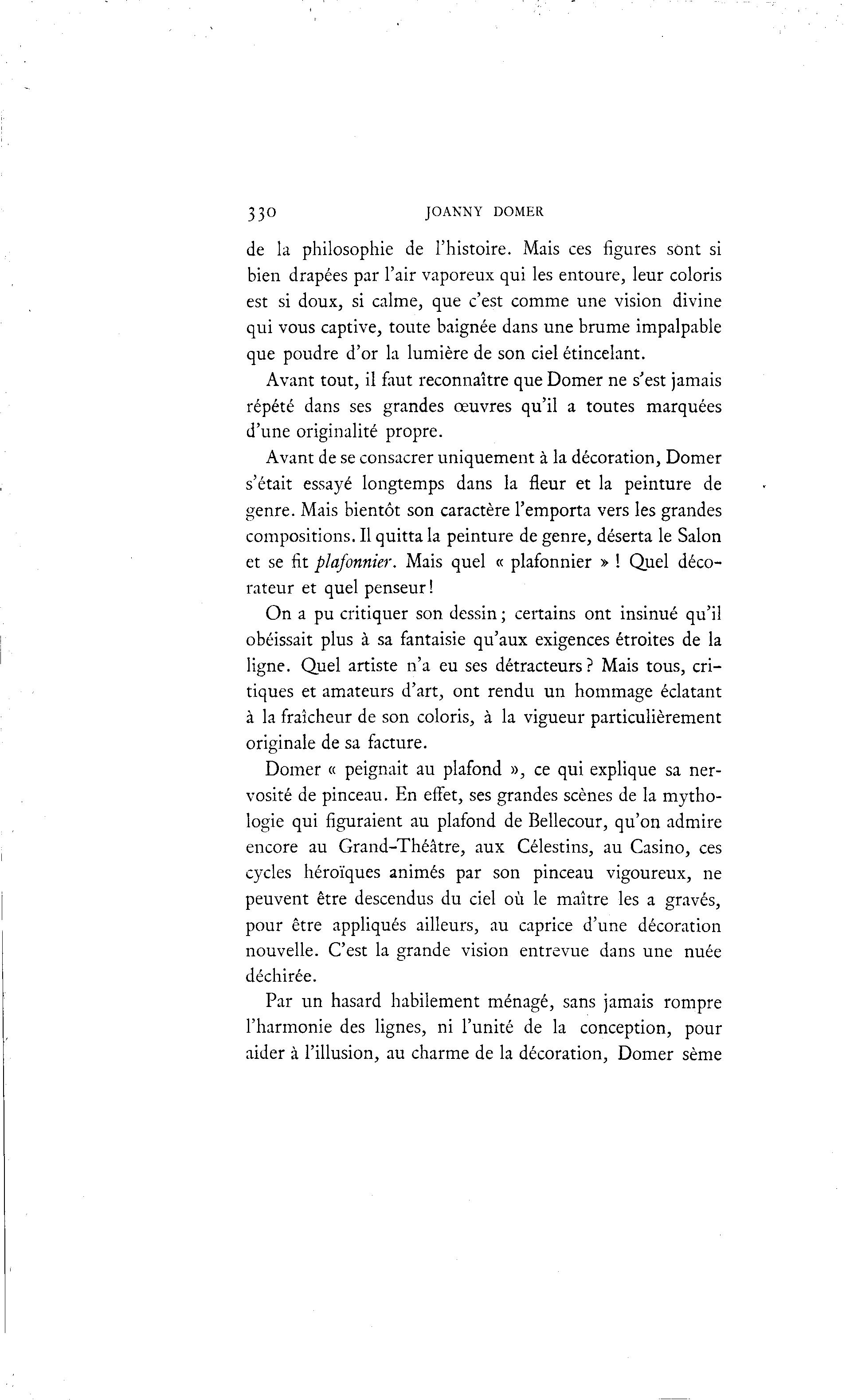 330 JOANNY DOMER de la philosophie de l'histoire. Mais ces figures sont si bien drapées par l'air vaporeux qui les entoure, leur coloris est si doux, si calme, que c'est comme une vision divine qui vous captive, toute baignée dans une brume impalpable que poudre d'or la lumière de son ciel étincelant. Avant tout, il faut reconnaître que Domer ne s'est jamais répété dans ses grandes œuvres qu'il a toutes marquées d'une originalité propre. Avant de se consacrer uniquement à la décoration, Domer s'était essayé longtemps dans la fleur et la peinture de genre. Mais bientôt son caractère l'emporta vers les grandes compositions. Il quitta la peinture de genre, déserta le Salon et se fit plafonnier. Mais quel « plafonnier » ! Quel déco- rateur et quel penseur ! On a pu critiquer son dessin ; certains ont insinué qu'il obéissait plus à sa fantaisie qu'aux exigences étroites de la ligne. Quel artiste n'a eu ses détracteurs ? Mais tous, cri- tiques et amateurs d'art, ont rendu un hommage éclatant à la fraîcheur de son coloris, à la vigueur particulièrement originale de sa facture. Domer « peignait au plafond », ce qui explique sa ner- vosité de pinceau. En effet, ses grandes scènes de la mytho- logie qui figuraient au plafond de Bellecour, qu'on admire encore au Grand-Théâtre, aux Célestins, au Casino, ces cycles héroïques animés par son pinceau vigoureux, ne peuvent être descendus du ciel où le maître les a gravés, pour être appliqués ailleurs, au caprice d'une décoration nouvelle. C'est la grande vision entrevue dans une nuée déchirée. Par un hasard habilement ménagé, sans jamais rompre l'harmonie des lignes, ni l'unité de la conception, pour aider à l'illusion, au charme de la décoration, Domer sème