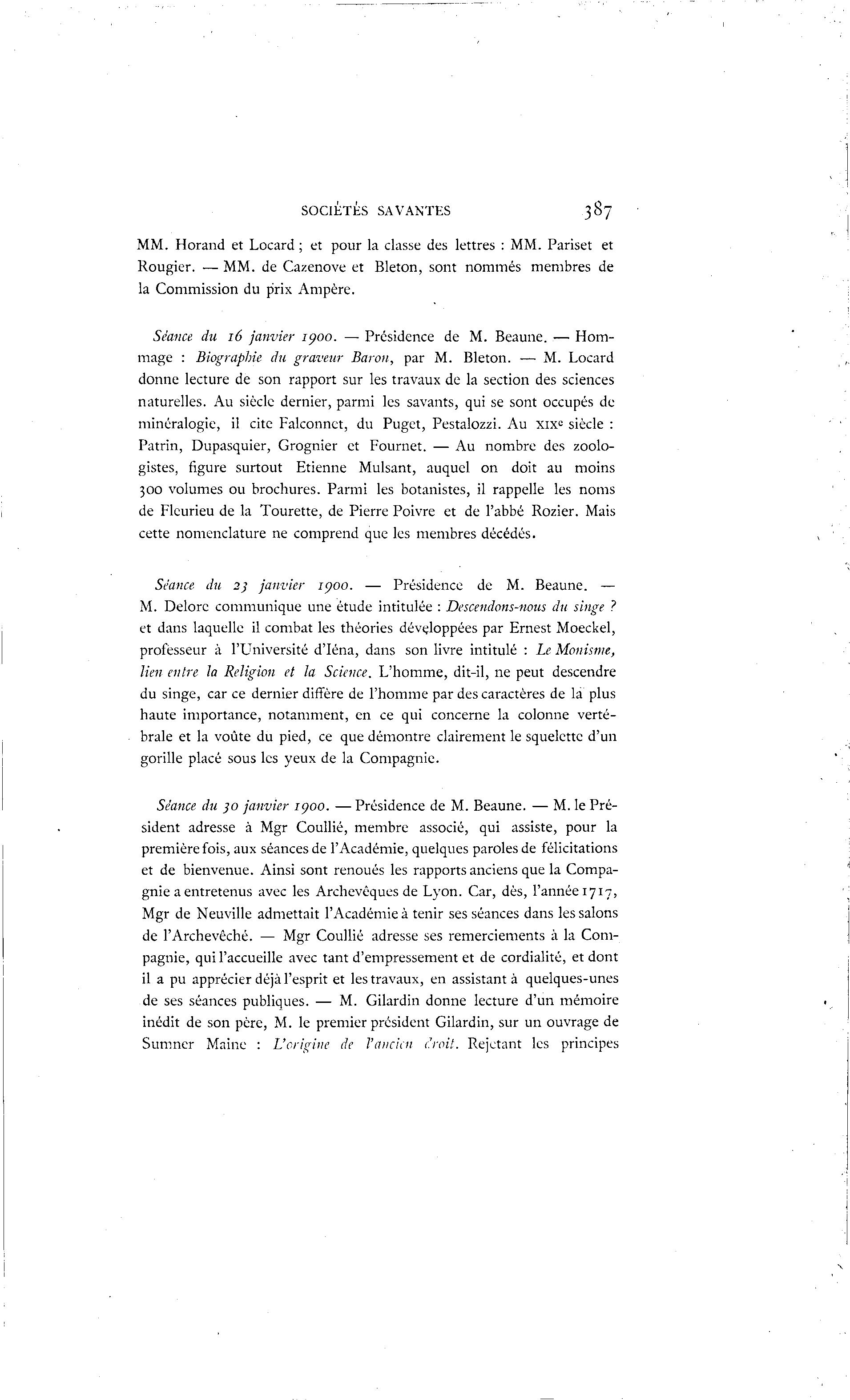 SOCIÉTÉS SAVANTES 387 MM. Horand et Locard ; et pour la classe des lettres : MM. Pariset et Rougier. — MM. de Cazenove et Bleton, sont nommés membres de la Commission du prix Ampère. Séance du 16 janvier iyoo. — Présidence de M. Beaune. — Hom- mage : Biographie du graveur Baron, par M. Bleton. — M. Locard donne lecture de son rapport sur les travaux de la section des sciences naturelles. Au siècle dernier, parmi les savants, qui se sont occupés de minéralogie, il cite Falconnct, du Puget, Pestalozzi. Au xix c siècle : Patrin, Dupasquier, Grognier et Fournet. — Au nombre des zoolo- gistes, figure surtout Etienne Mulsant, auquel on doit au moins 300 volumes ou brochures. Parmi les botanistes, il rappelle les noms de Fleurieu de la Tourette, de Pierre Poivre et de l'abbé Rozier. Mais cette nomenclature ne comprend que les membres décédés. Séance du 2} janvier 1900. — Présidence de M. Beaune. — M. Delorc communique une étude intitulée : Descendons-nous du singe ? et dans laquelle il combat les théories développées par Ernest Moeckel, professeur à l'Université d'Iéna, dans son livre intitulé : Le Monisme, lien entre la Religion et la Science. L'homme, dit-il, ne peut descendre du singe, car ce dernier diffère de l'homme par des caractères de la plus haute importance, notamment, en ce qui concerne la colonne verté- brale et la voûte du pied, ce que démontre clairement le squelette d'un gorille placé sous les yeux de la Compagnie. Séance du 30 janvier içoo. — Présidence de M. Beaune. — M. le Pré- sident adresse à Mgr Coullié, membre associé, qui assiste, pour la première fois, aux séances de l'Académie, quelques paroles de félicitations et de bienvenue. Ainsi sont renoués les rapports anciens que la Compa- gnie a entretenus avec les Archevêques de Lyon. Car, dès, l'année 1717, Mgr de Neuville admettait l'Académie à tenir ses séances dans les salons de l'Archevêché. — Mgr Coullié adresse ses remerciements à la Com- pagnie, qui l'accueille avec tant d'empressement et de cordialité, et dont il a pu apprécier déjà l'esprit et les travaux, en assistant à quelques-unes de ses séances publiques. — M. Gilardin donne lecture d'un mémoire inédit de son père, M. le premier président Gilardin, sur un ouvrage de Sumner Maine : L'origine de l'ancien droit. Rejetant les principes