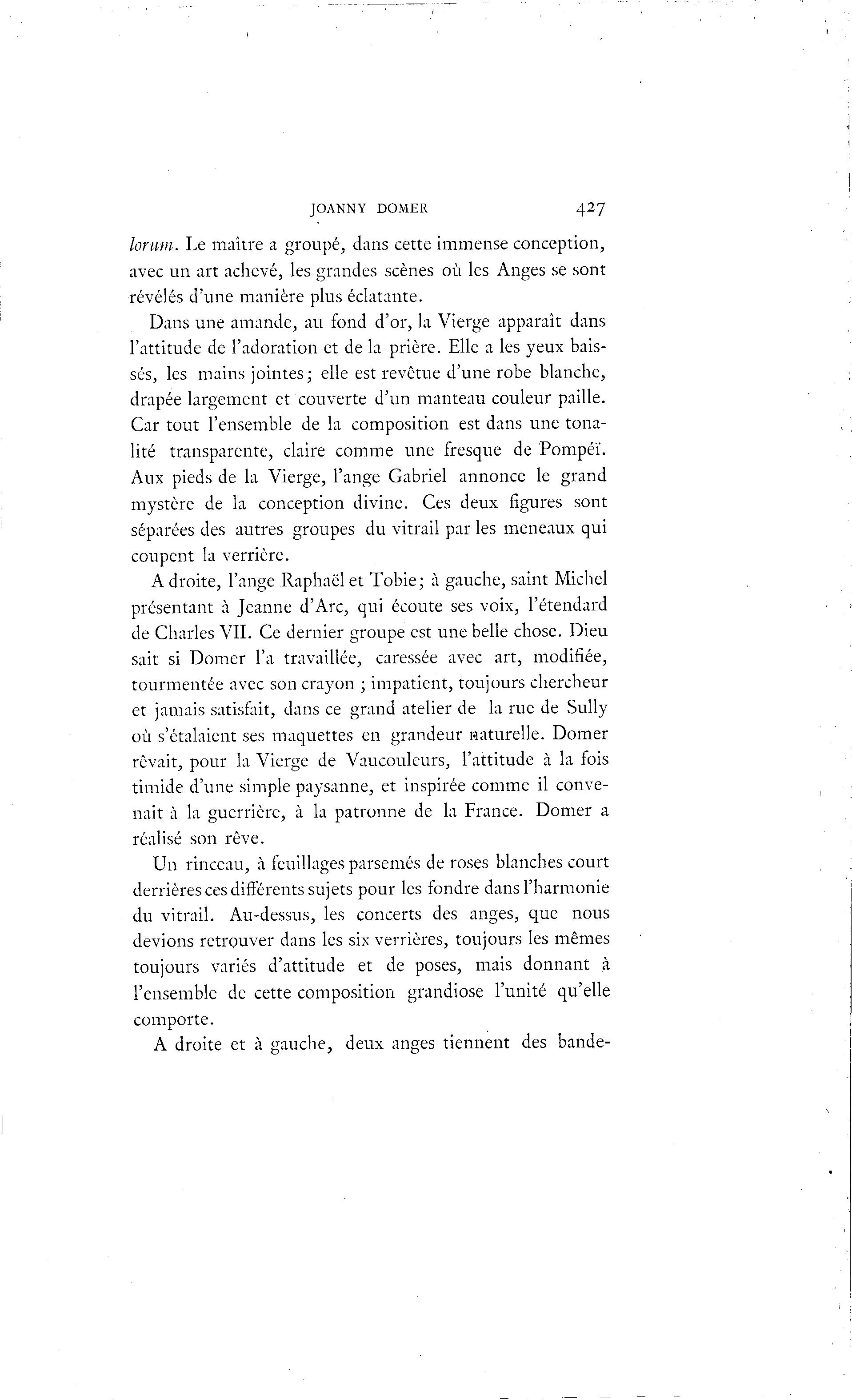 JOANNY DOMER 427 lorum. Le maître a groupé, dans cette immense conception, avec un art achevé, les grandes scènes où les Anges se sont révélés d'une manière plus éclatante. Dans une amande, au fond d'or, la Vierge apparaît dans l'attitude de l'adoration et de la prière. Elle a les yeux bais- sés, les mains jointes; elle est revêtue d'une robe blanche, drapée largement et couverte d'un manteau couleur paille. Car tout l'ensemble de la composition est dans une tona- lité transparente, claire comme une fresque de Pompéï. Aux pieds de la Vierge, l'ange Gabriel annonce le grand mystère de la conception divine. Ces deux figures sont séparées des autres groupes du vitrail par les meneaux qui coupent la verrière. A droite, l'ange Raphaël et Tobie; à gauche, saint Michel présentant à Jeanne d'Arc, qui écoute ses voix, l'étendard de Charles VIL Ce dernier groupe est une belle chose. Dieu sait si Domer l'a travaillée, caressée avec art, modifiée, tourmentée avec son crayon ; impatient, toujours chercheur et jamais satisfait, dans ce grand atelier de la rue de Sully où s'étalaient ses maquettes en grandeur naturelle. Domer rêvait, pour la Vierge de Vaucouleurs, l'attitude à la fois timide d'une simple paysanne, et inspirée comme il conve- nait à la guerrière, à la patronne de la France. Domer a réalisé son rêve. Un rinceau, à feuillages parsemés de roses blanches court derrières ces différents sujets pour les fondre dans l'harmonie du vitrail. Au-dessus, les concerts des anges, que nous devions retrouver dans les six verrières, toujours les mêmes toujours variés d'attitude et de poses, mais donnant à l'ensemble de cette composition grandiose l'unité qu'elle comporte. A droite et à gauche, deux anges tiennent des bande-