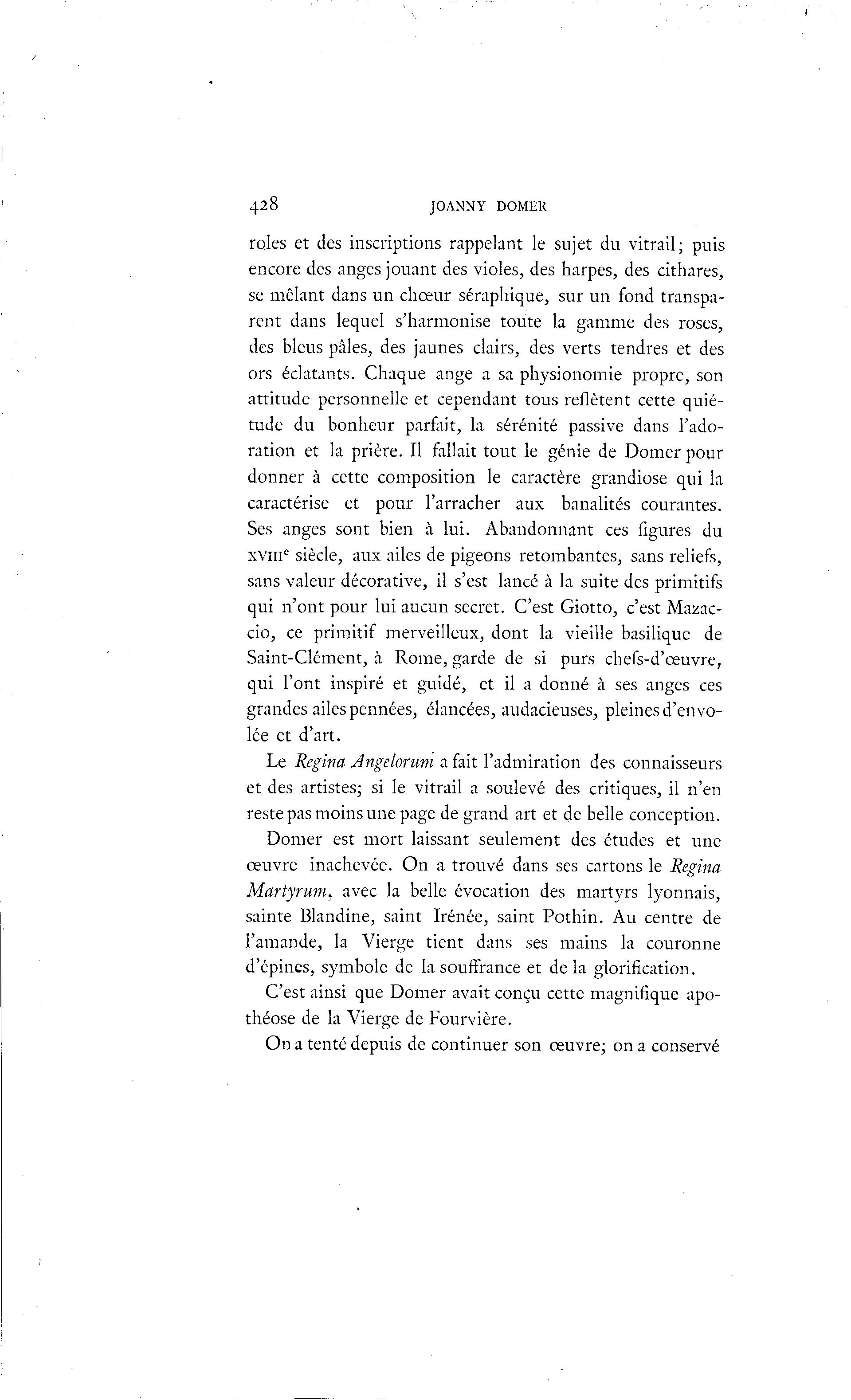 428 JOANNY DOMER rôles et des inscriptions rappelant le sujet du vitrail; puis encore des anges jouant des violes, des harpes, des cithares, se mêlant dans un chœur séraphique, sur un fond transpa- rent dans lequel s'harmonise toute la gamme des roses, des bleus pâles, des jaunes clairs, des verts tendres et des ors éclatants. Chaque ange a sa physionomie propre, son attitude personnelle et cependant tous reflètent cette quié- tude du bonheur parfait, la sérénité passive dans l'ado- ration et la prière. Il fallait tout le génie de Domer pour donner à cette composition le caractère grandiose qui la caractérise et pour l'arracher aux banalités courantes. Ses anges sont bien à lui. Abandonnant ces figures du xvm e siècle, aux ailes de pigeons retombantes, sans reliefs, sans valeur décorative, il s'est lancé à la suite des primitifs qui n'ont pour lui aucun secret. C'est Giotto, c'est Mazac- cio, ce primitif merveilleux, dont la vieille basilique de Saint-Clément, à Rome, garde de si purs chefs-d'œuvre, qui l'ont inspiré et guidé, et il a donné à ses anges ces grandes ailes pennées, élancées, audacieuses, pleines d'envo- lée et d'art. Le Regina Angelorum a fait l'admiration des connaisseurs et des artistes; si le vitrail a soulevé des critiques, il n'en reste pas moins une page de grand art et de belle conception. Domer est mort laissant seulement des études et une œuvre inachevée. On a trouvé dans ses cartons le Regina Martyrum, avec la belle évocation des martyrs lyonnais, sainte Blandine, saint Irénée, saint Pothin. Au centre de l'amande, la Vierge tient dans ses mains la couronne d'épines, symbole de la souffrance et de la glorification. C'est ainsi que Domer avait conçu cette magnifique apo- théose de la Vierge de Fourvière. On a tenté depuis de continuer son œuvre; on a conservé