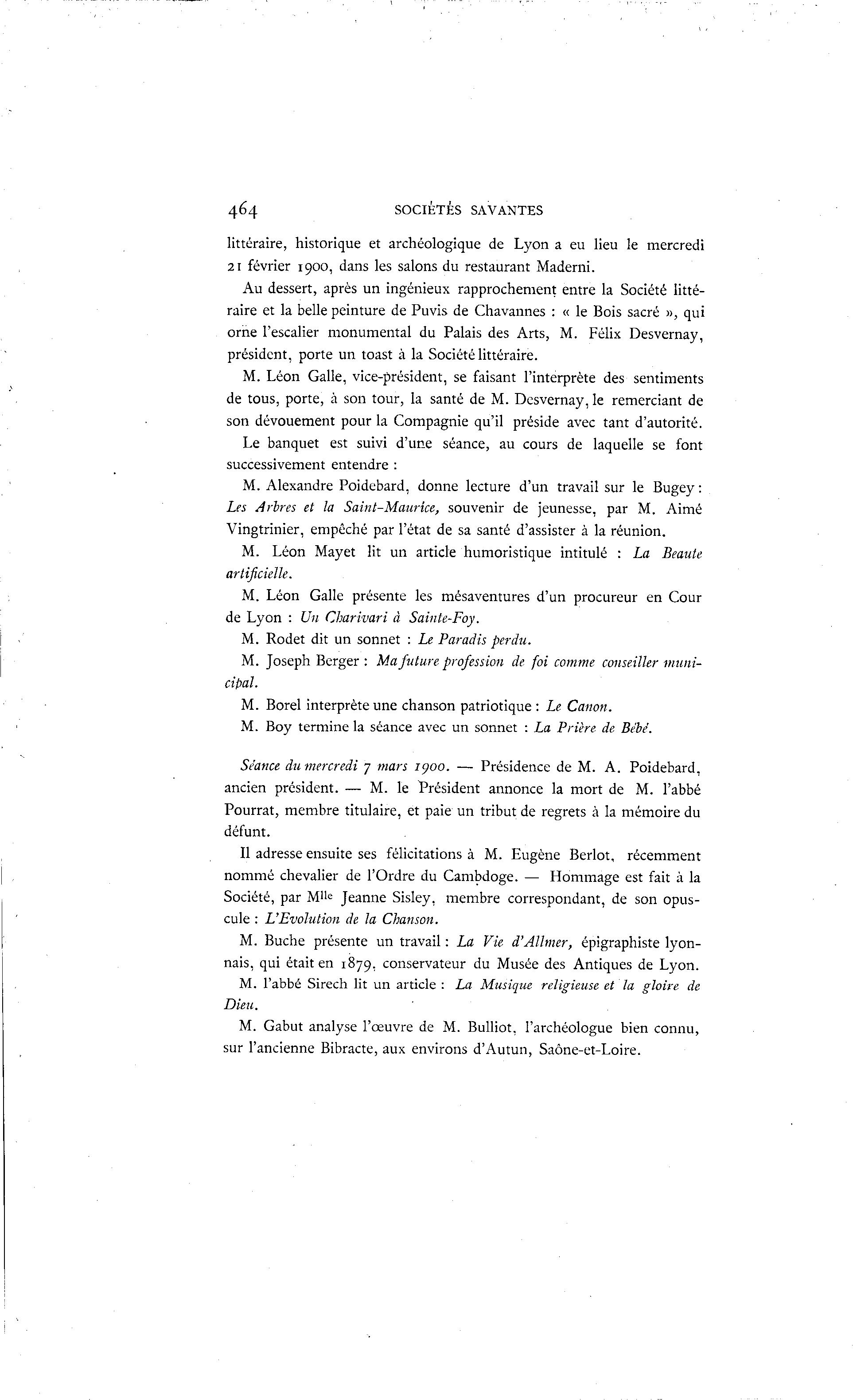 464 SOCIÉTÉS SAVANTES littéraire, historique et archéologique de Lyon a eu lieu le mercredi 21 février 1900, dans les salons du restaurant Maderni. Au dessert, après un ingénieux rapprochement entre la Société litté- raire et la belle peinture de Puvis de Chavannes : « le Bois sacré », qui orne l'escalier monumental du Palais des Arts, M. Félix Desvernay, président, porte un toast à la Société littéraire. M. Léon Galle, vice-président, se faisant l'interprète des sentiments de tous, porte, à son tour, la santé de M. Dcsvernay, le remerciant de son dévouement pour la Compagnie qu'il préside avec tant d'autorité. Le banquet est suivi d'une séance, au cours de laquelle se font successivement entendre : M. Alexandre Poidebard, donne lecture d'un travail sur le Bugey : Les Arbres et la Saint-Maurice, souvenir de jeunesse, par M. Aimé Vingtrinier, empêché par l'état de sa santé d'assister à la réunion. M. Léon May et lit un article humoristique intitulé : La Beauté artificielle. M. Léon Galle présente les mésaventures d'un procureur en Cour de Lyon : Un Charivari à Sainte-Foy. M. Rodet dit un sonnet : Le Paradis perdu. M. Joseph Berger : Ma future profession de foi comme conseiller muni- cipal. M. Borel interprète une chanson patriotique : Le Canon. M. Boy termine la séance avec un sonnet : La Prière de Bébé'. Séance du mercredi 7 mars iyoo. — Présidence de M. A. Poidebard, ancien président. — M. le Président annonce la mort de M. l'abbé Pourrat, membre titulaire, et paie un tribut de regrets à la mémoire du défunt. Il adresse ensuite ses félicitations à M. Eugène Berlot, récemment nommé chevalier de l'Ordre du Cambdoge. — Hommage est fait à la Société, par M lle Jeanne Sisley, membre correspondant, de son opus- cule : L'Evolution de la Chanson. M. Bûche présente un travail : La Vie d'Allmer, épigraphiste lyon- nais, qui était en 1879, conservateur du Musée des Antiques de Lyon. M. l'abbé Sirech lit un article : La Musique religieuse et la gloire de Dieu. M. Gabut analyse l'œuvre de M. Bulliot, l'archéologue bien connu, sur l'ancienne Bibracte, aux environs d'Autun, Saône-et-Loire.