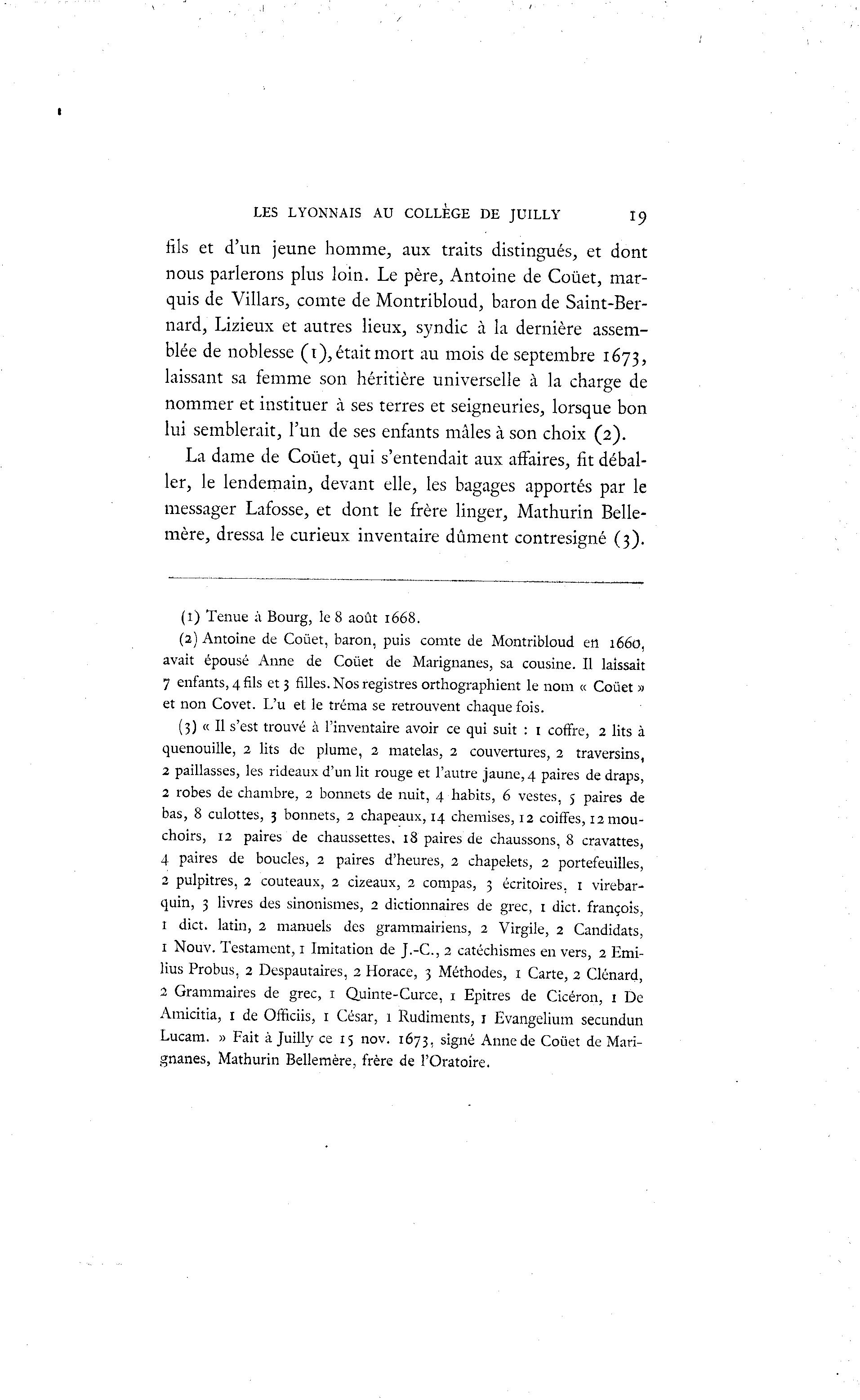 LES LYONNAIS AU COLLEGE DE JUILLY 19 fils et d'un jeune homme, aux traits distingués, et dont nous parlerons plus loin. Le père, Antoine de Coûet, mar- quis de Villars, comte de Montribloud, baron de Saint-Ber- nard, Lizieux et autres lieux, syndic à la dernière assem- blée de noblesse ( t ) , é t a i t m o r t au mois de septembre 1673, laissant sa femme son héritière universelle à la charge de nommer et instituer à ses terres et seigneuries, lorsque bon lui semblerait, l'un de ses enfants mâles à son choix (2). La dame de Coûet, qui s'entendait aux affaires, fit débal- ler, le lendemain, devant elle, les bagages apportés par le messager Lafosse, et dont le frère linger, Mathurin Belle- mère, dressa le curieux inventaire dûment contresigné (3). (1) Tenue à Bourg, le 8 août 1668. (2) Antoine de Coûet, baron, puis comte de Montribloud en 1660, avait épousé Anne de Coûet de Marignanes, sa cousine. Il laissait 7 enfants, 4 fils et 3filles.Nos registres orthographient le nom « Coûet » et non Covet. L'u et le tréma se retrouvent chaque fois. (3) « Il s'est trouvé à l'inventaire avoir ce qui suit : 1 coffre, 2 lits à quenouille, 2 lits de plume, 2 matelas, 2 couvertures, 2 traversins, 2 paillasses, les rideaux d'un lit rouge et l'autre jaune, 4 paires de draps, 2 robes de chambre, 2 bonnets de nuit, 4 habits, 6 vestes, 5 paires de bas, 8 culottes, 3 bonnets, 2 chapeaux, 14 chemises, 12 coiffes, 12 mou- choirs, 12 paires de chaussettes. 18 paires de chaussons, 8 cravattes, 4 paires de boucles, 2 paires d'heures, 2 chapelets, 2 portefeuilles, 2 pulpitres, 2 couteaux, 2 cizeaux, 2 compas, 3 écritoires, 1 virebar- quin, 3 livres des sinonismes, 2 dictionnaires de grec, 1 dict. françois, 1 dict. latin, 2 manuels des grammairiens, 2 Virgile, 2 Candidats, 1 Nouv. Testament, 1 Imitation de J.-C, 2 catéchismes en vers, 2 Emi- lius Probus. 2 Despautaires, 2 Horace, 3 Méthodes, 1 Carte, 2 Clônard, 2 Grammaires de grec, 1 Quinte-Curce, 1 Epitres de Cicéron, 1 De Amicitia, 1 de OfBciis, 1 César, 1 Rudiments, 1 Evangelium secundun Lucam. » Fait à Juilly ce 15 nov. 1673. signé Anne de Coûet de Mari- gnanes, Mathurin Bellemère, frère de l'Oratoire.